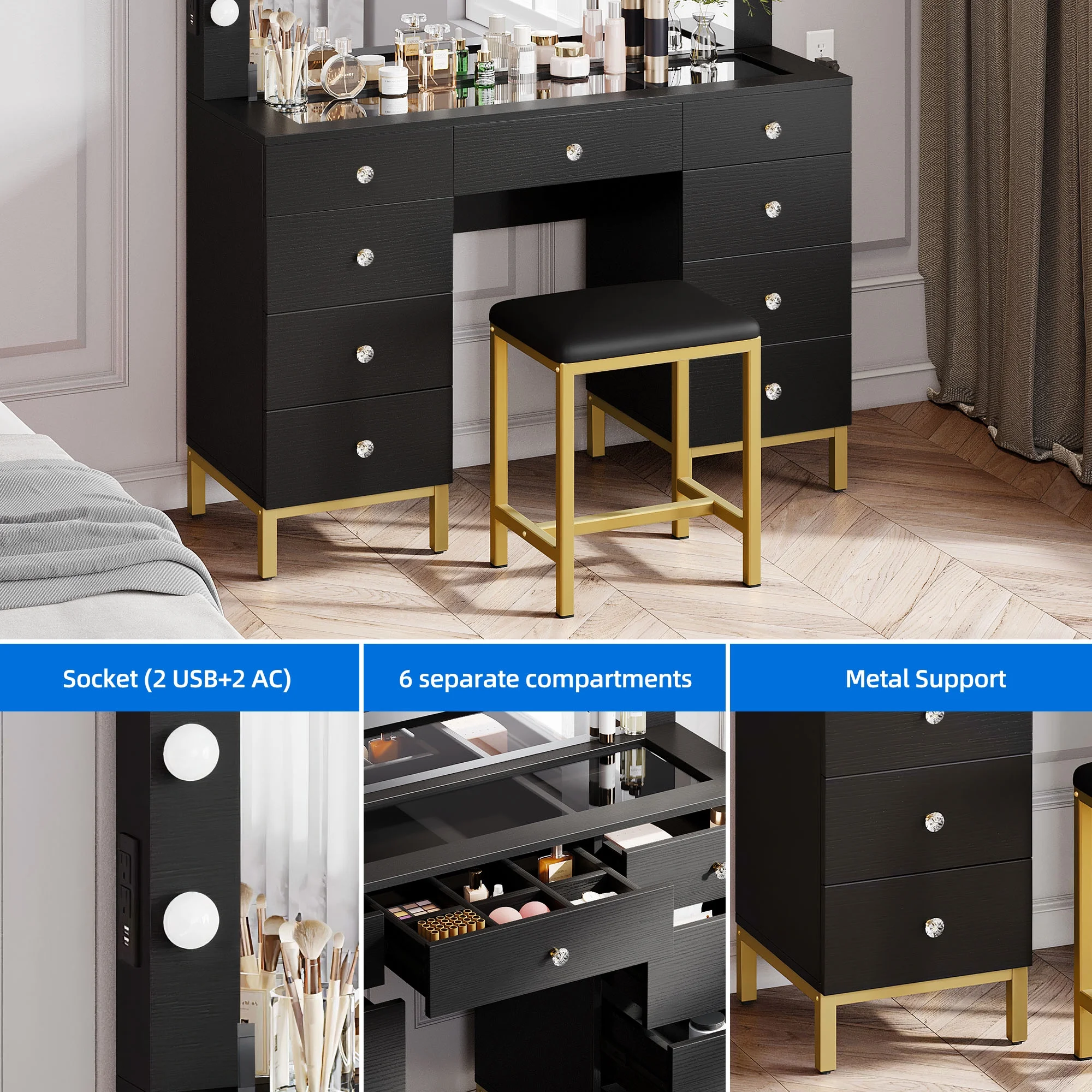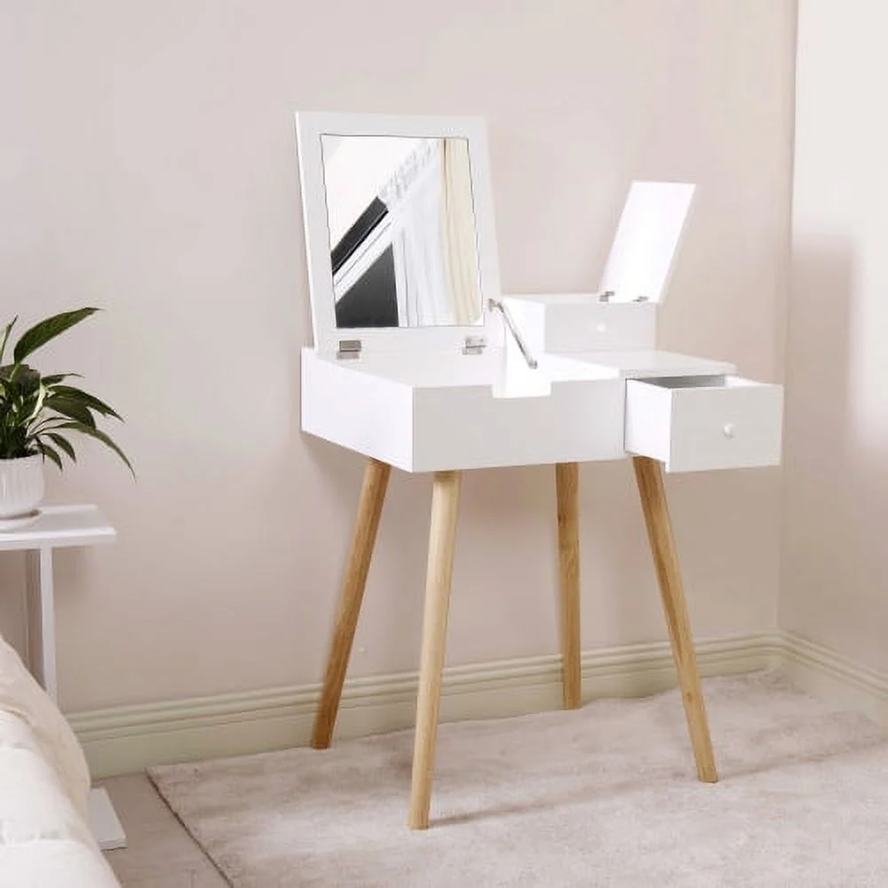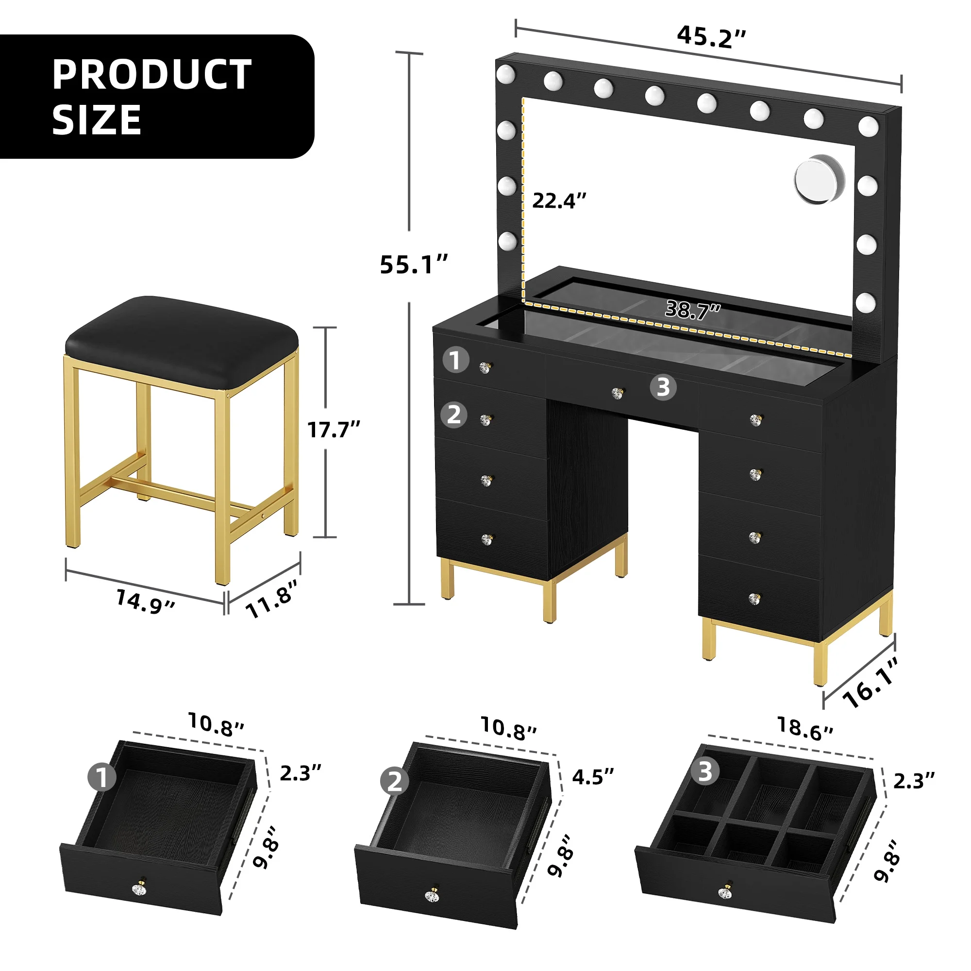 Boahaus Seraphine White Modern Vanity Desk with Mirror, LED Lights, 7 Drawers, Crystal Ball Knobs, for Bedroom