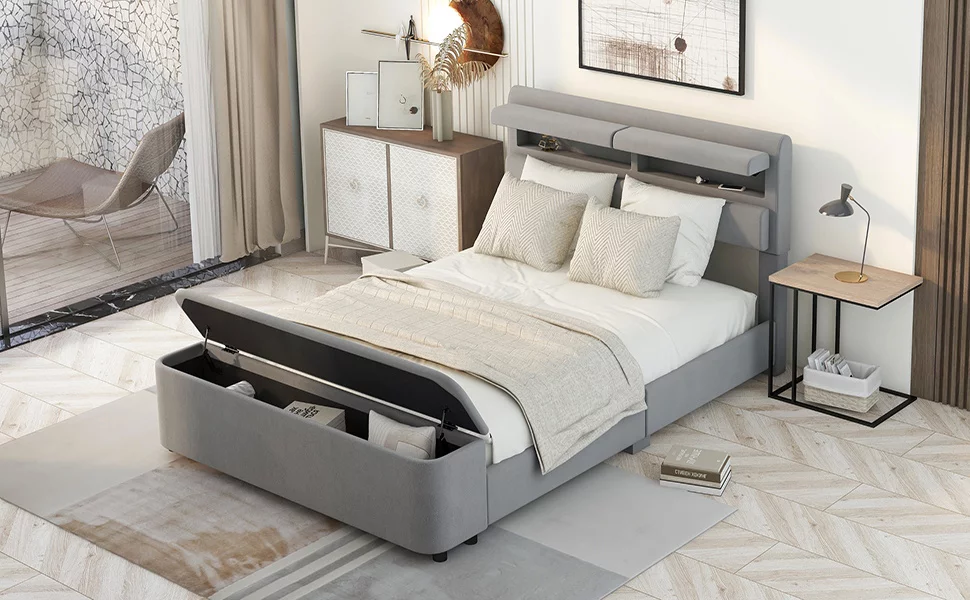 ikayaa Full Size Upholstery Platform Bed with Storage Headboard and Footboard,Support Legs,Grey