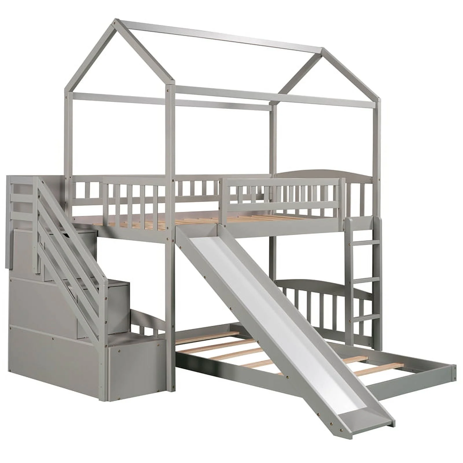CRO Decor Twin Over Twin Bunk Bed with Two Drawers and Slide (White)