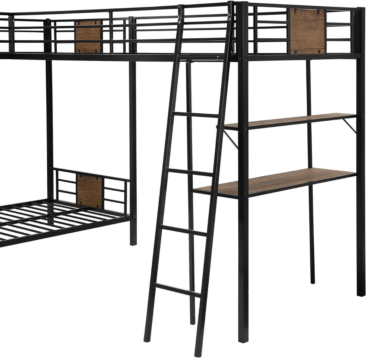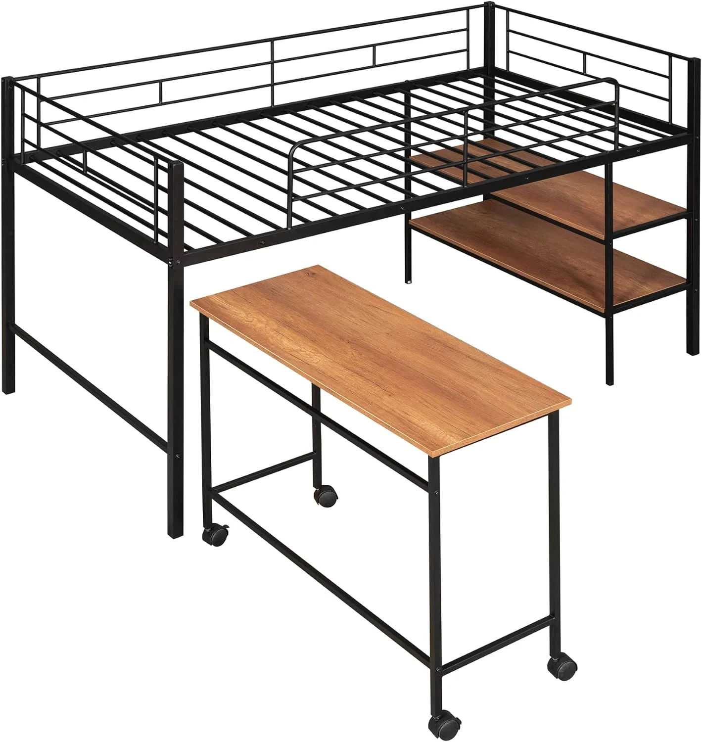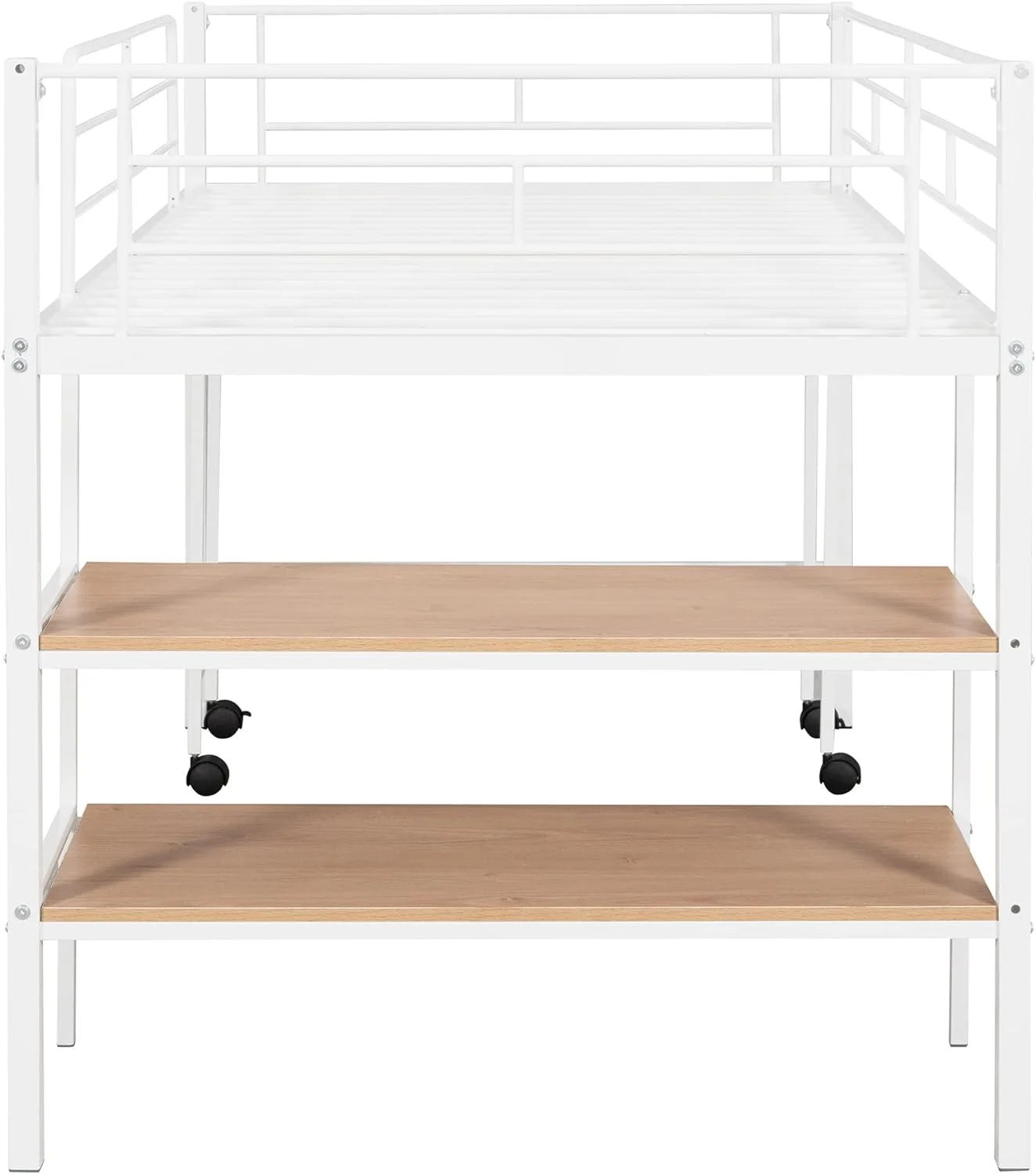 Metal Buk Bed With Rollig Desk, Ladder, Ad 2 Shelves, Size Buk Bed Space-Savig Loft Bed For Boys & Girls Tees