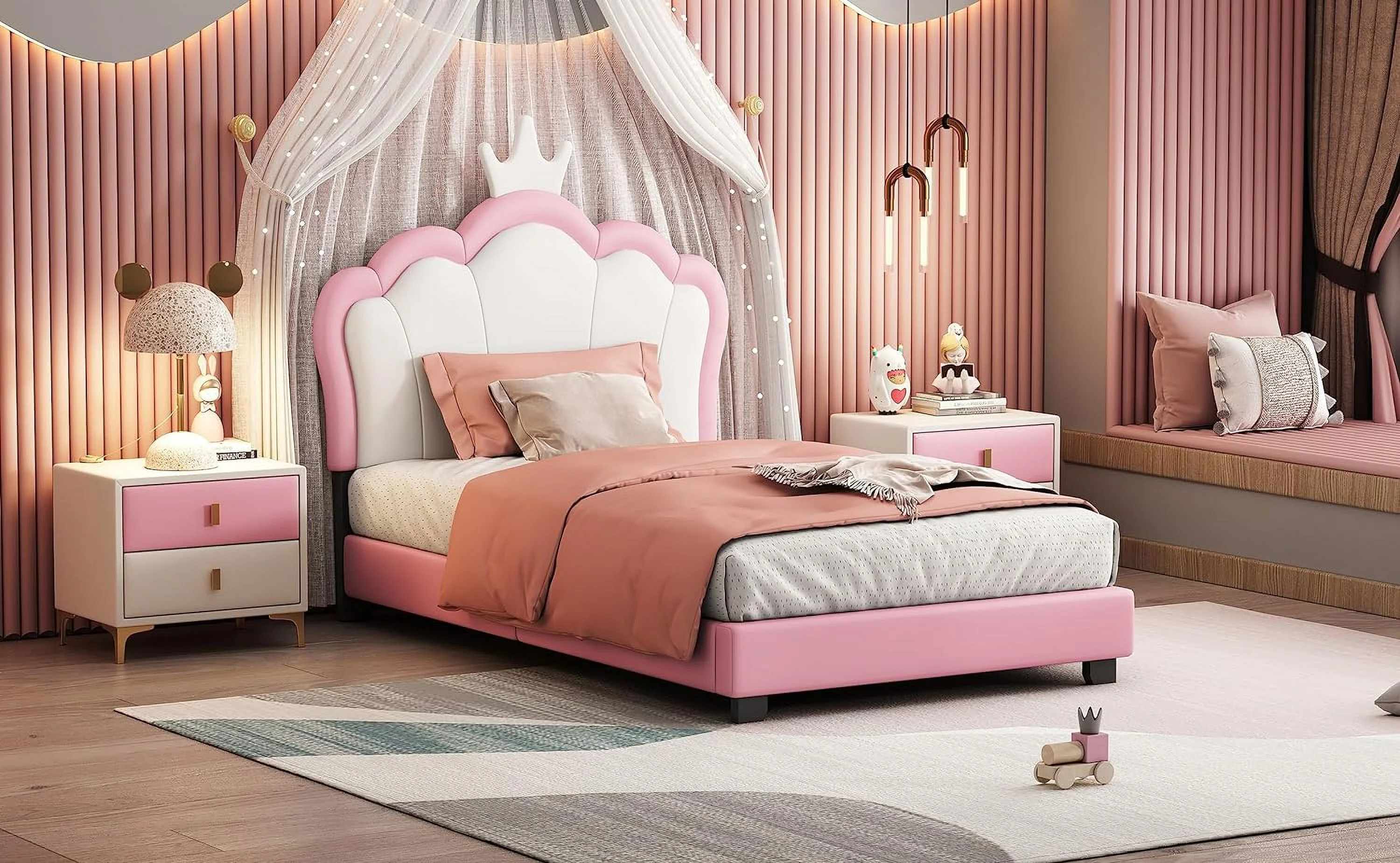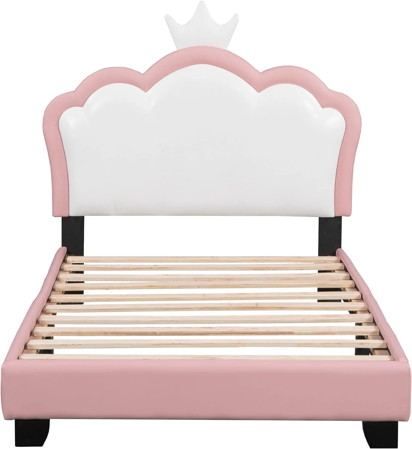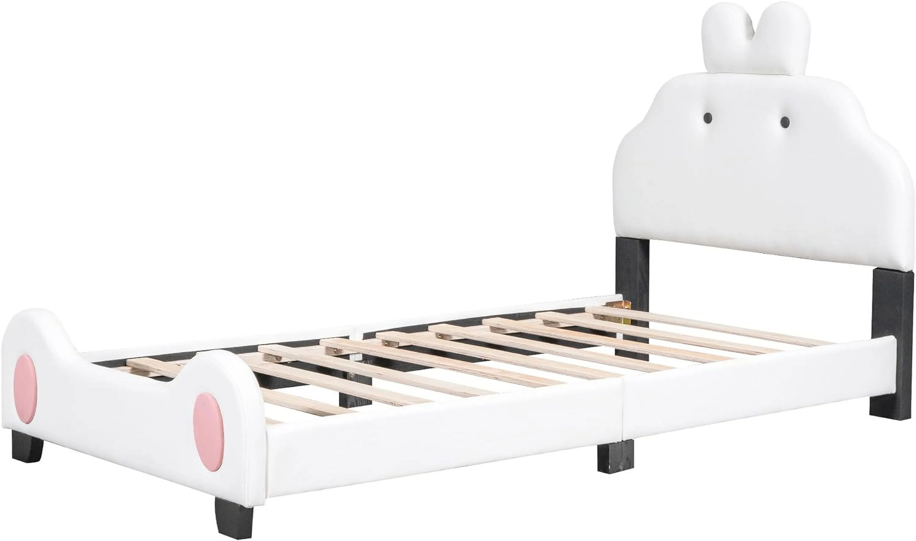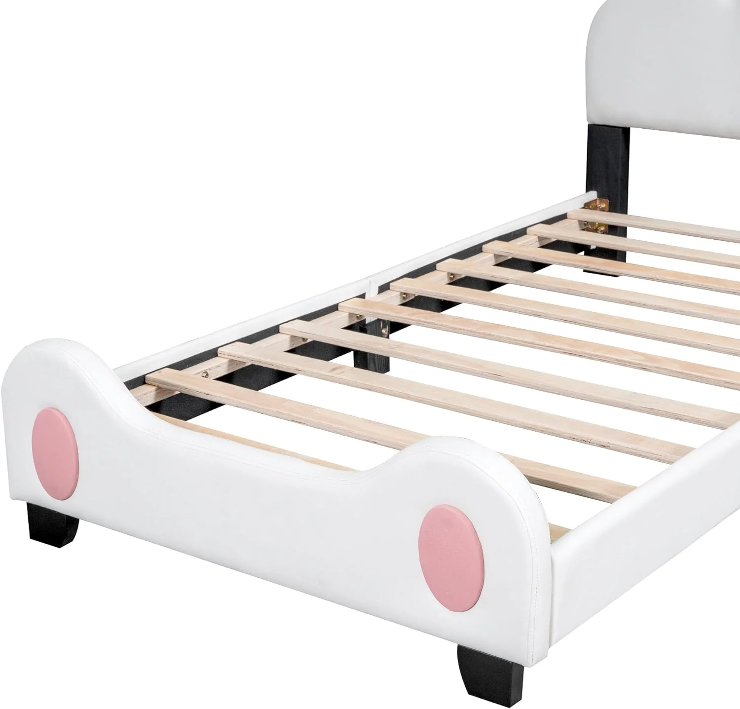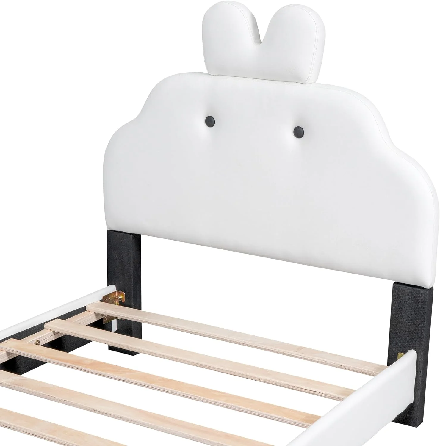 Size PU Leather Upholstered Platform Bed With Cartoo Headboard & Footboard For Boys & Girls, White Pik