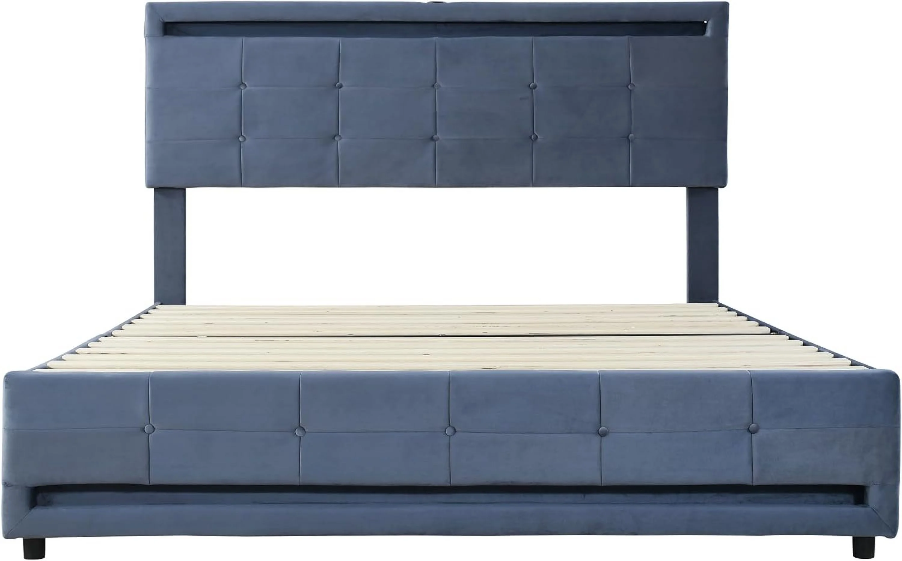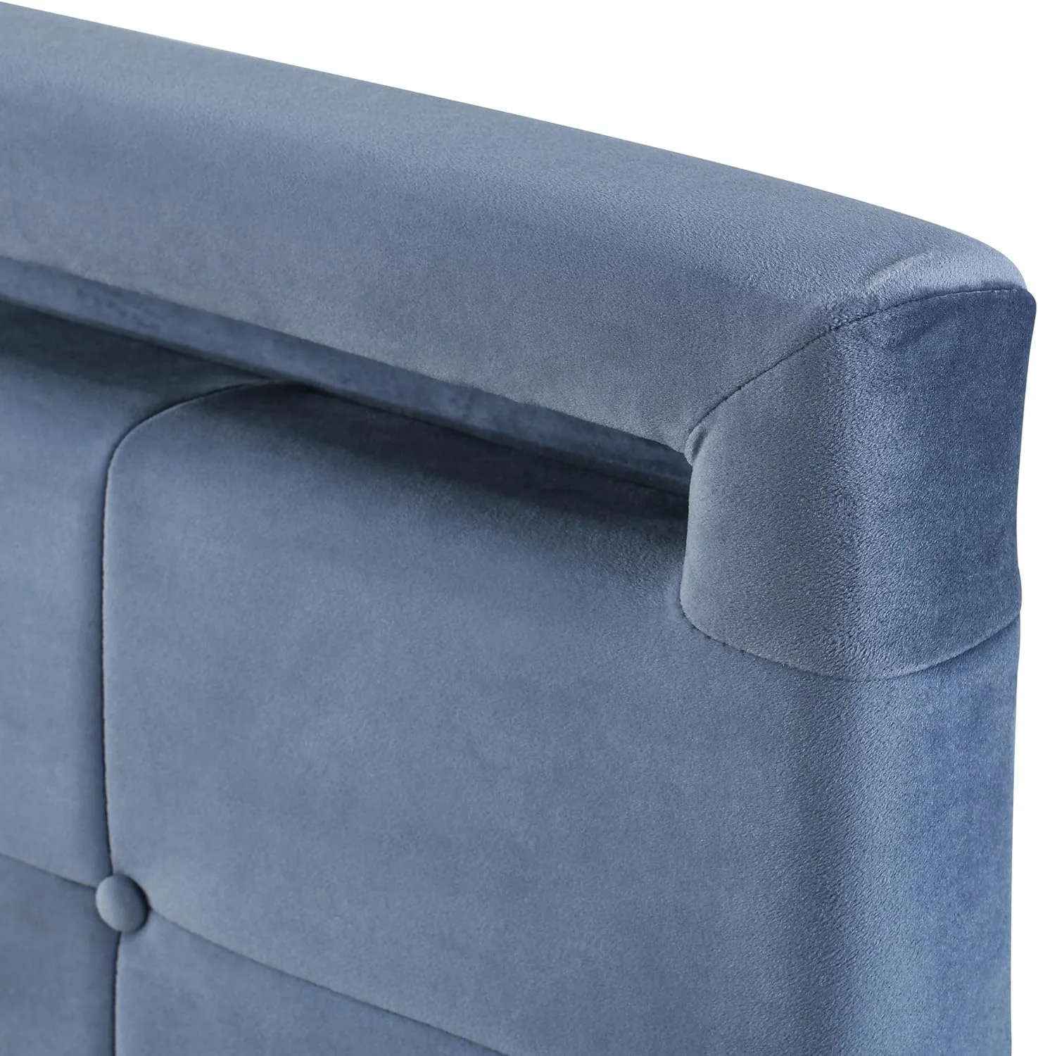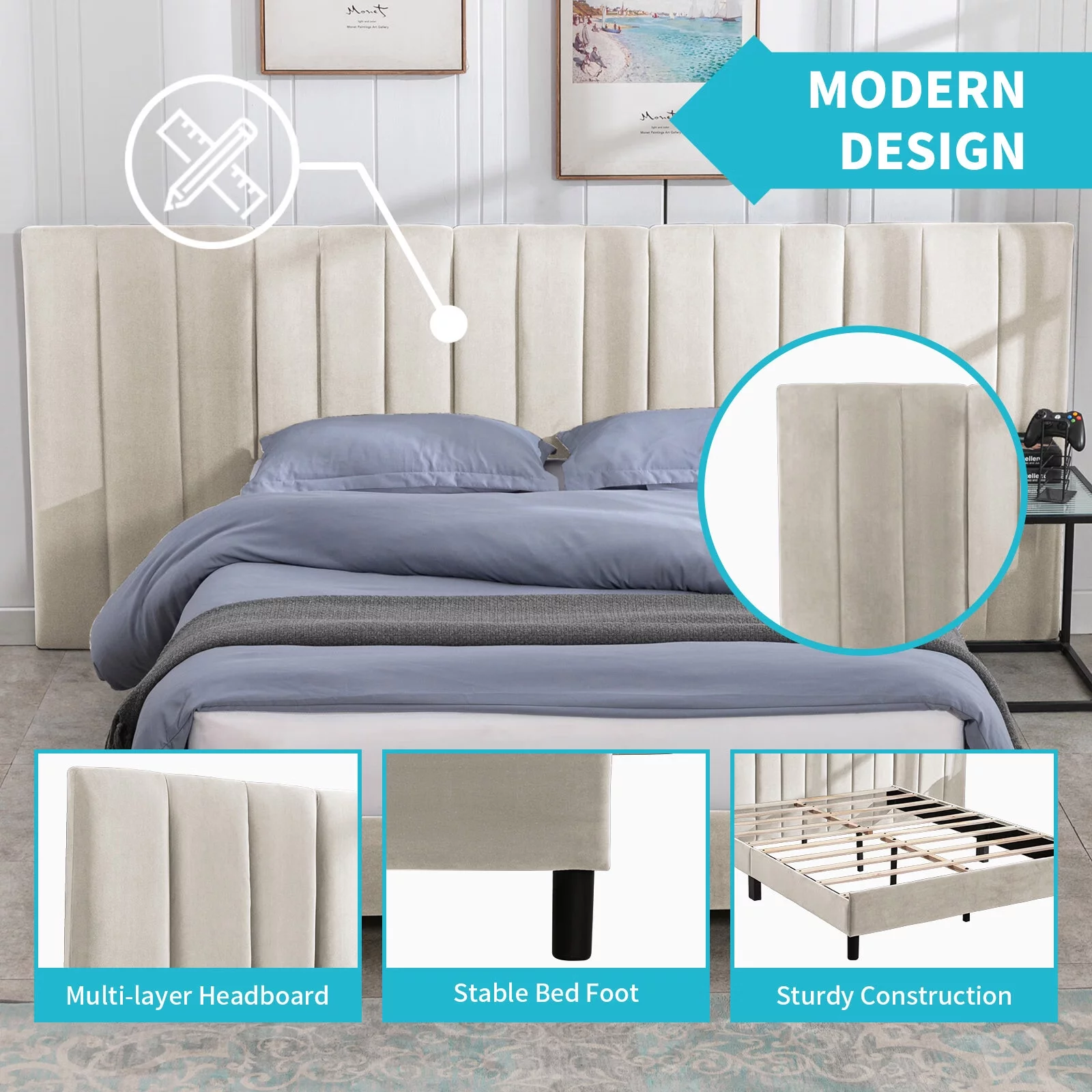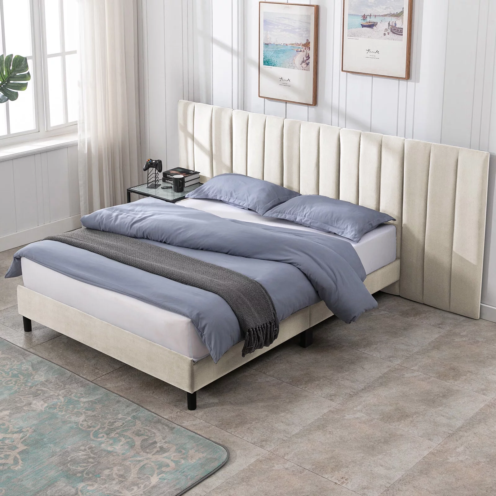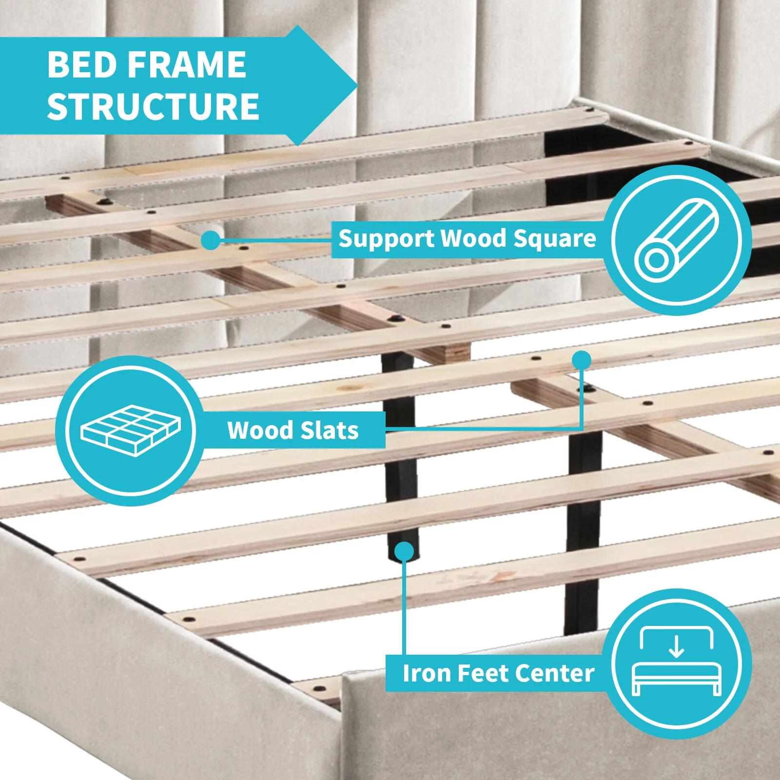 CECER Queen Size Bed Frame with Oversized Wingback Headboard, Tufted Bed Frame with Velvet Upholstered Beige
