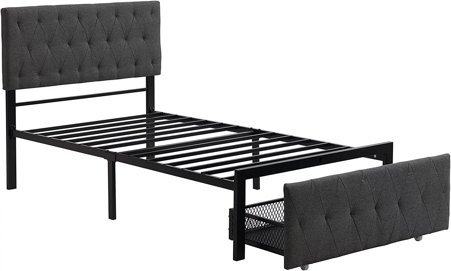 Contemporary Modern Light Brown Burlap Button Tufted Twin Size Bed w Trundle Bedroom Upholstered 1pc Bed Wooden Slats