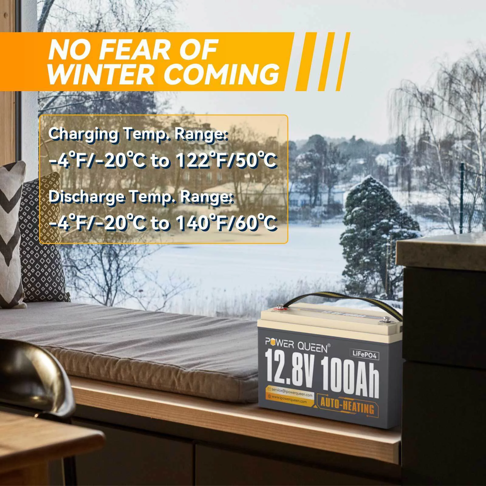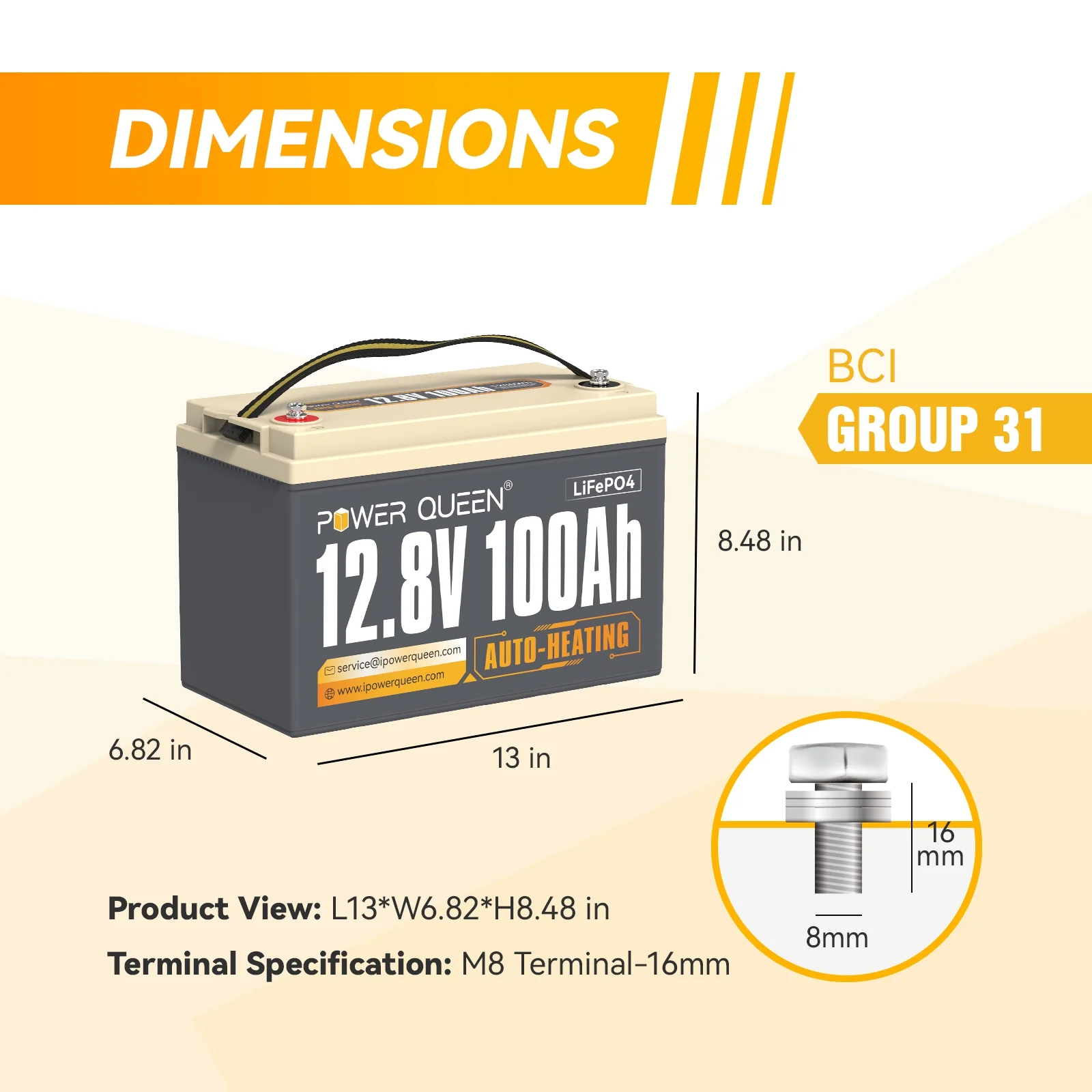 Power Queen 12V 100Ah Auto-Heating LiFePO4 Lithium Battery BMS Support Low Temp. for RV, off-Grid,Match BCI Group 31 Battery Box