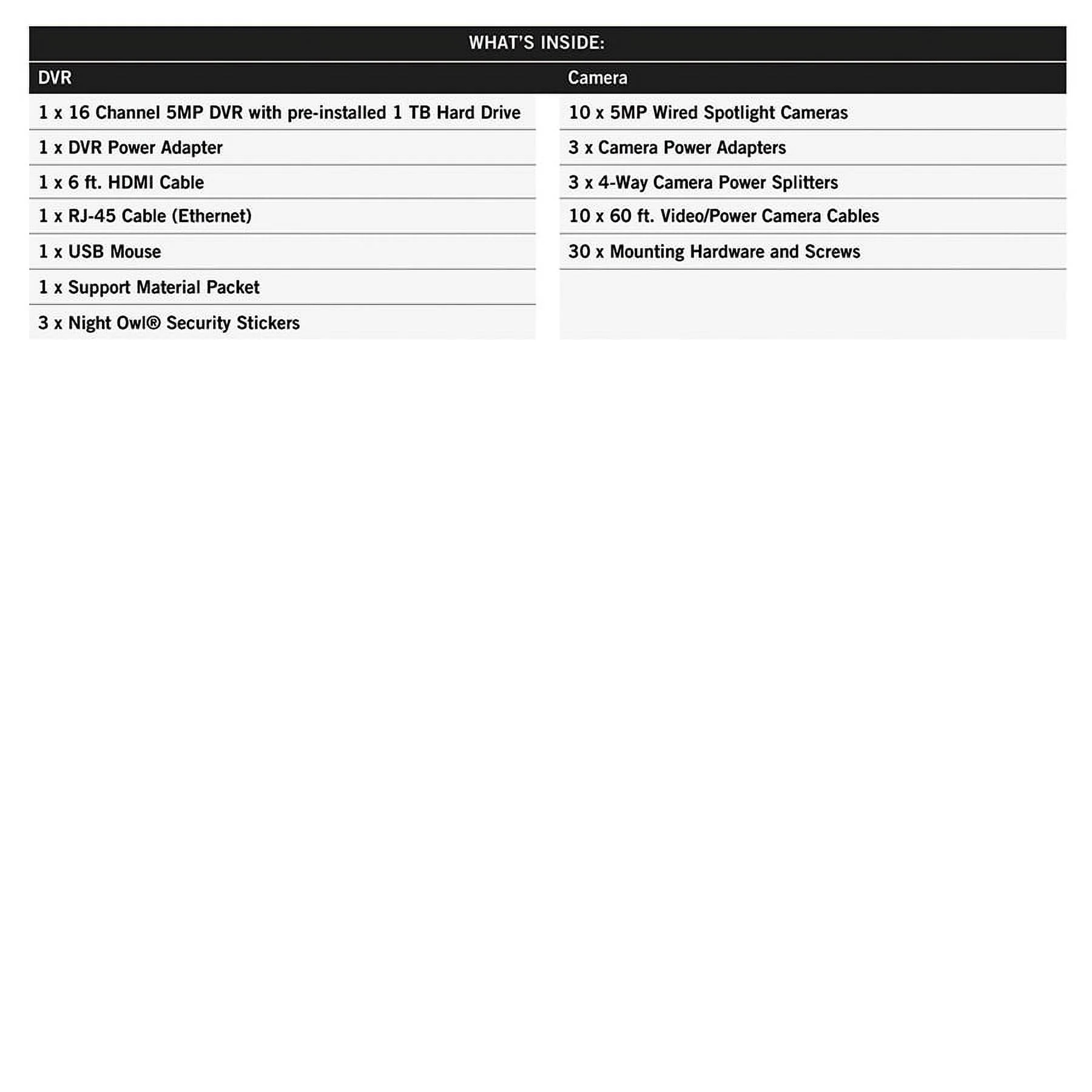 Night Owl 16 Channel DVR, (10) 5MP Wired Spotlight Cameras with 1TB Hard Drive