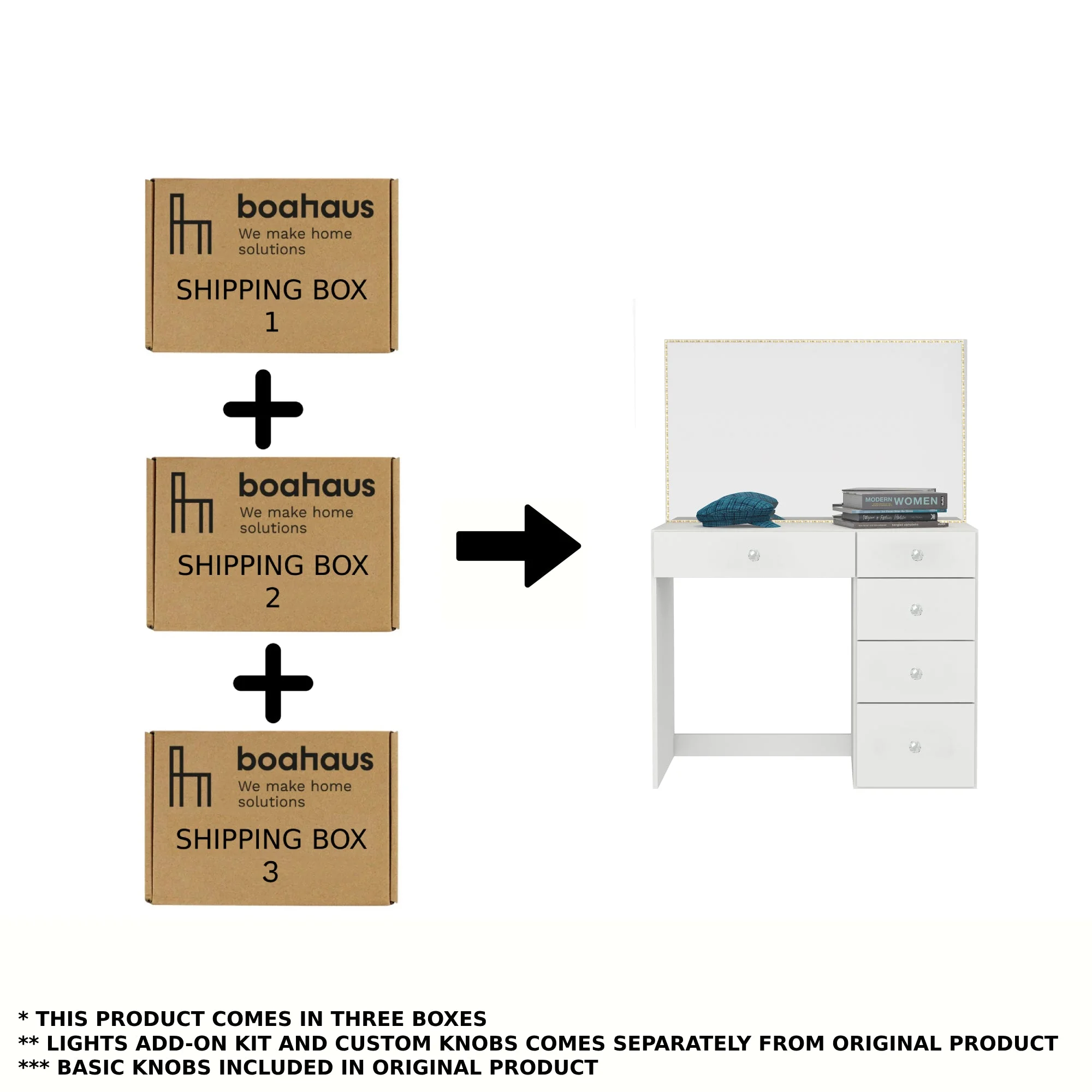 Boahaus Amelia PRO Modern Vanity Desk with 5 Drawers, Lights, Golden Knobs, Wide Mirror, White