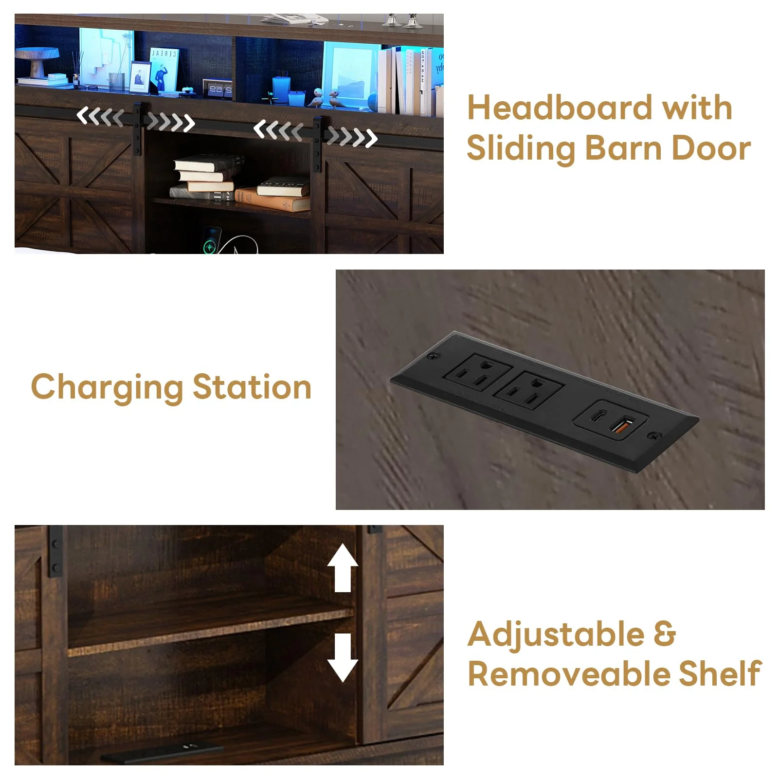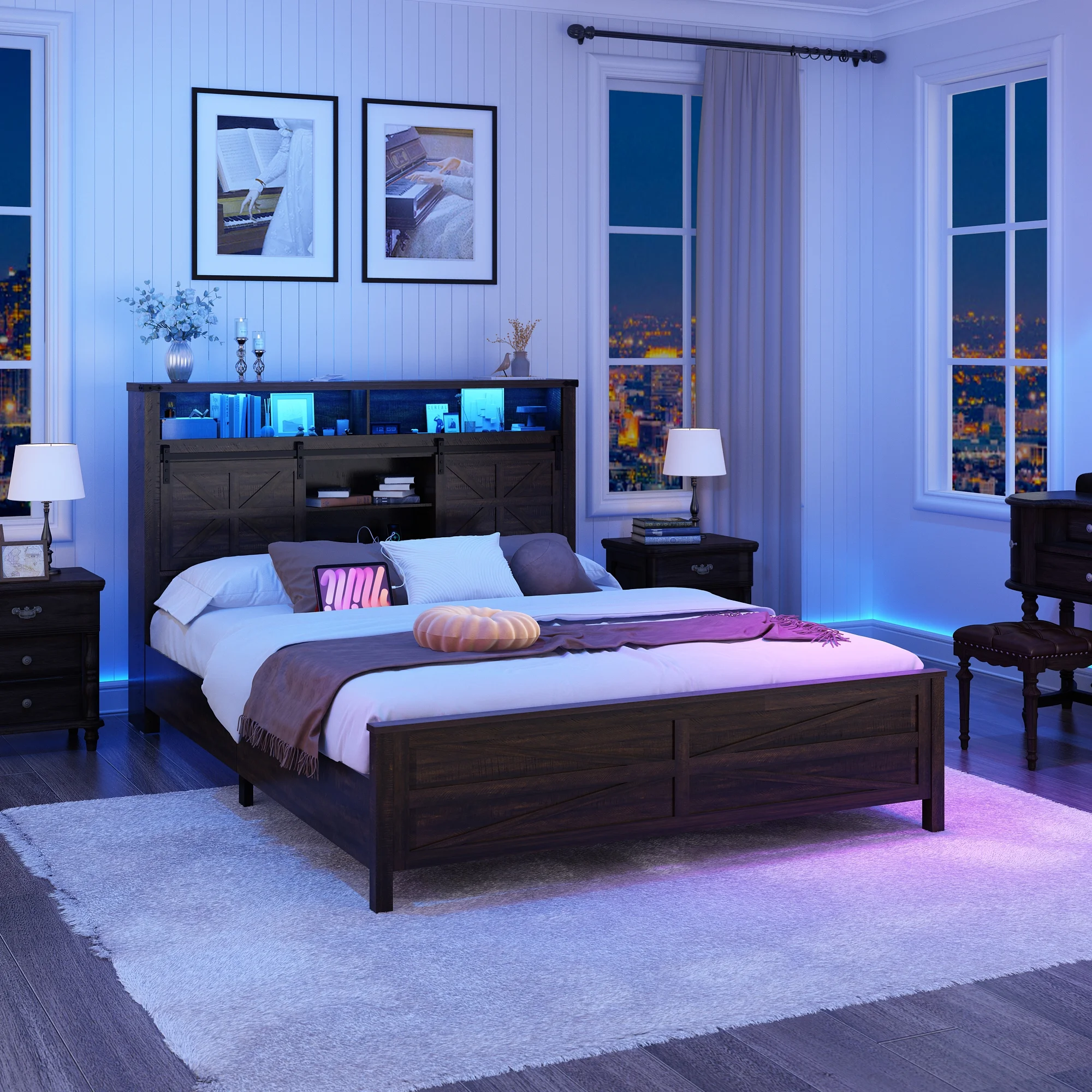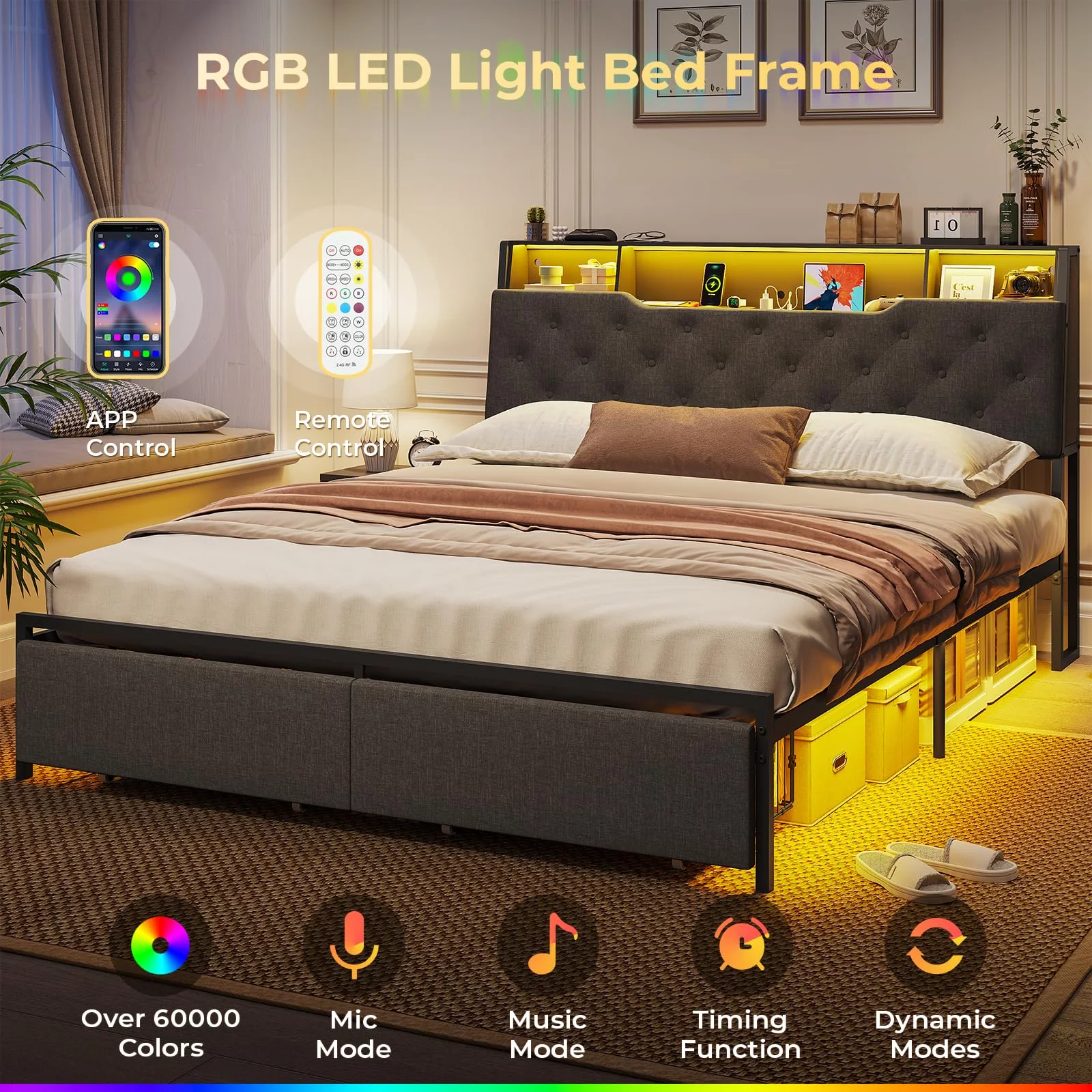 Afuhokles Full Bed Frame with Charging Station, Headboard Storage and 2 Drawers LED Lights, Dark Gray