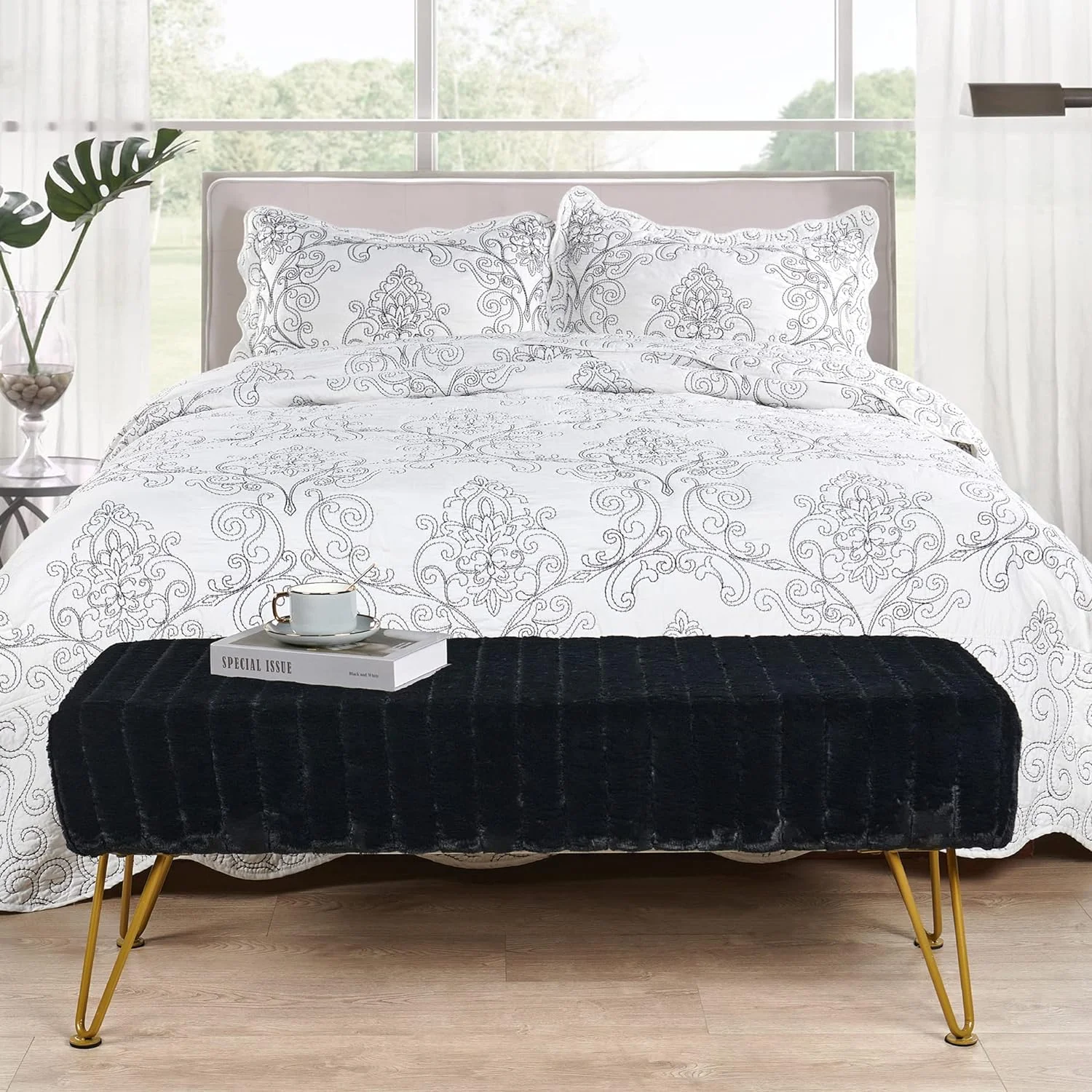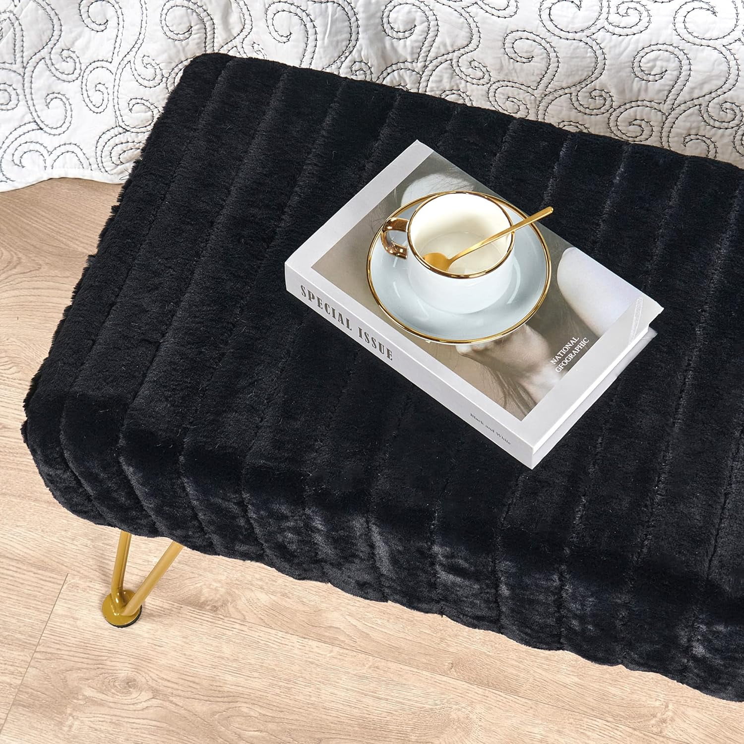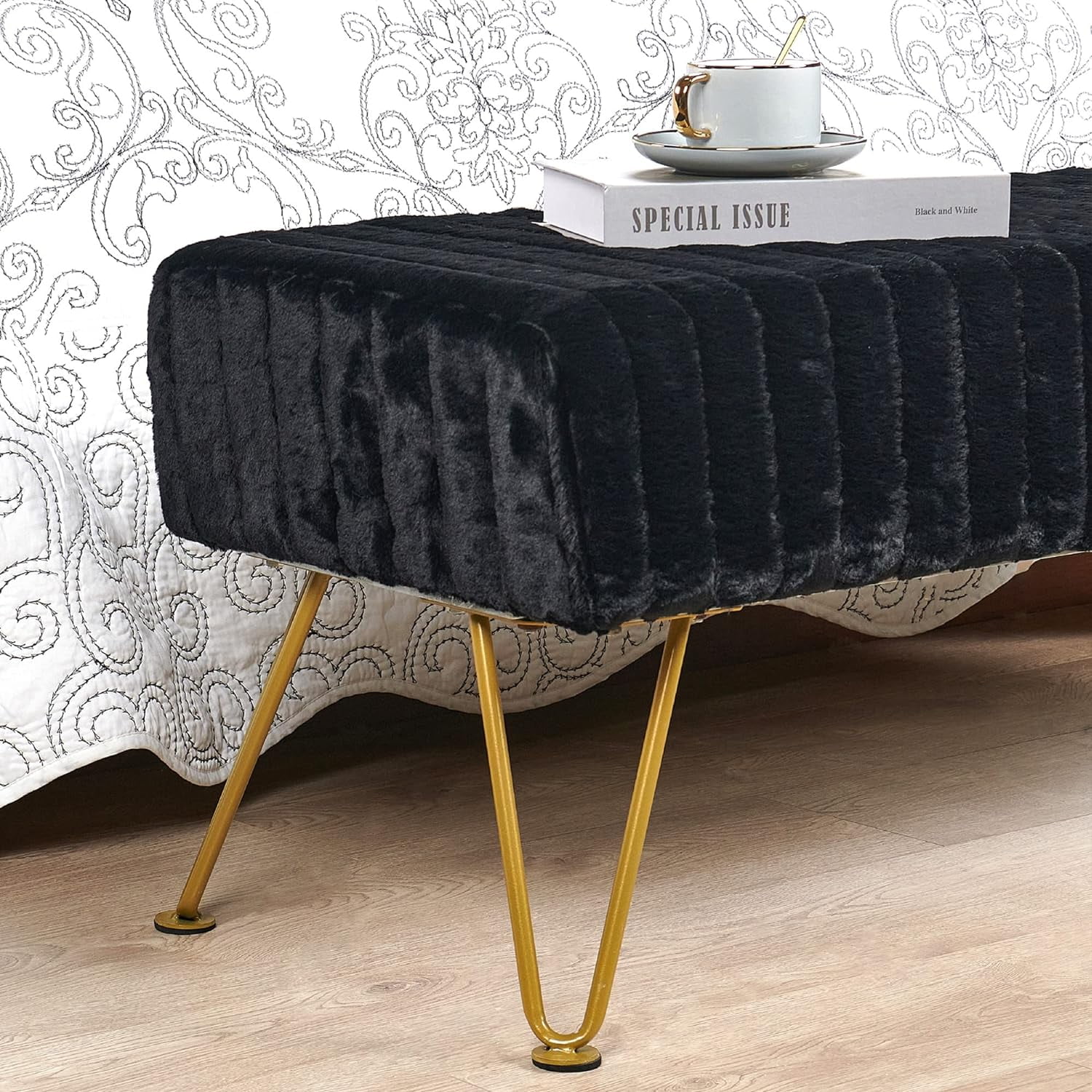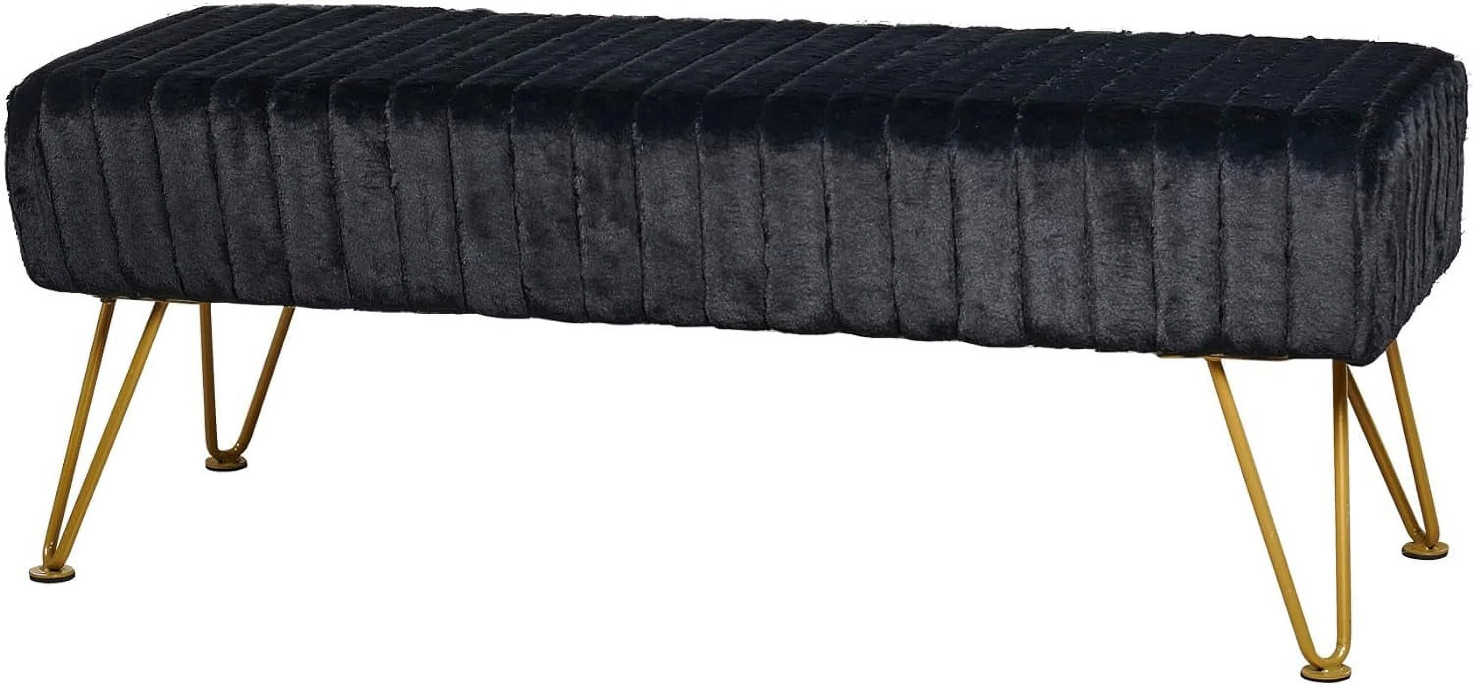 Super Mink Black Faux Fur Ottoman Bench, 46" X 16" X 17" H, Living Room Foot Rest Stool Entryway Makeup Bench End Of Bed Bedroom Home Decor Chair For Sitting