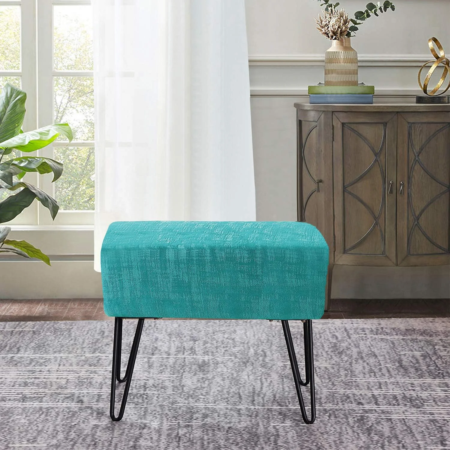 Textured Velvet Ottoman, 19" X 13" X 17" H, Majolica Blue, Fuzzy Entry Way Ottoman Bench For Living Room Bedroom End Of Bed Decorative Makeup Stool Foot Rest Chair Home Décor