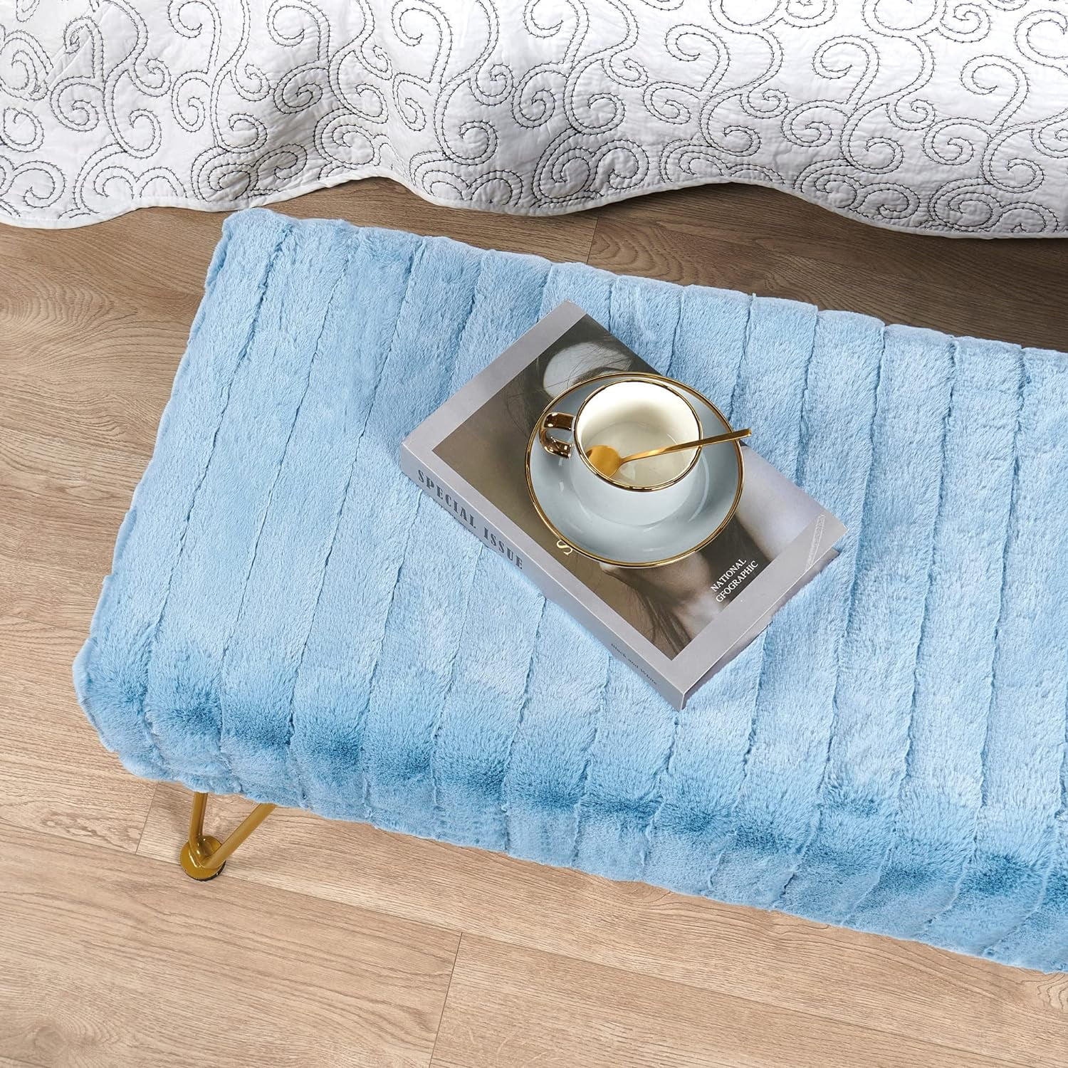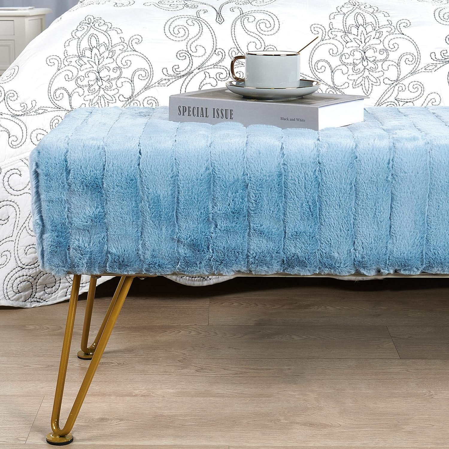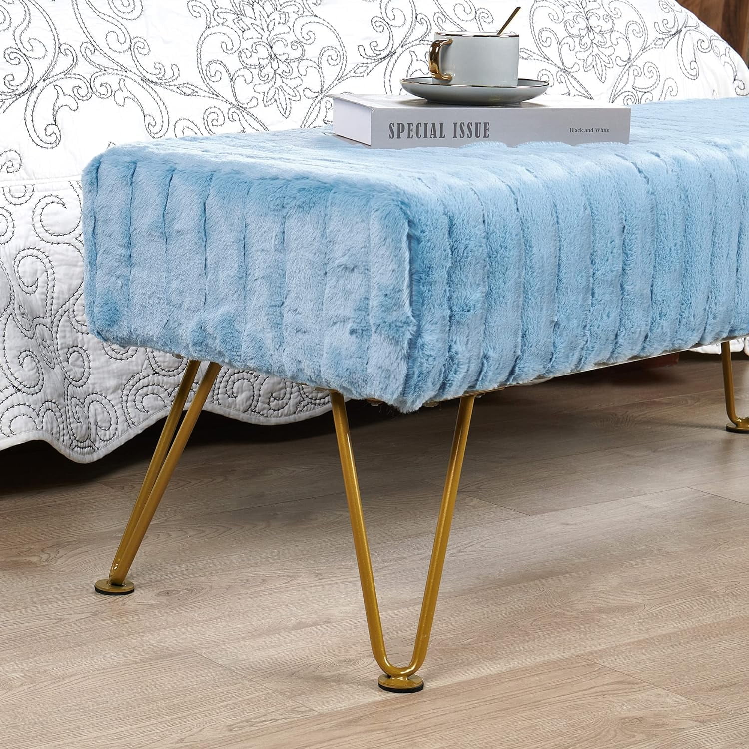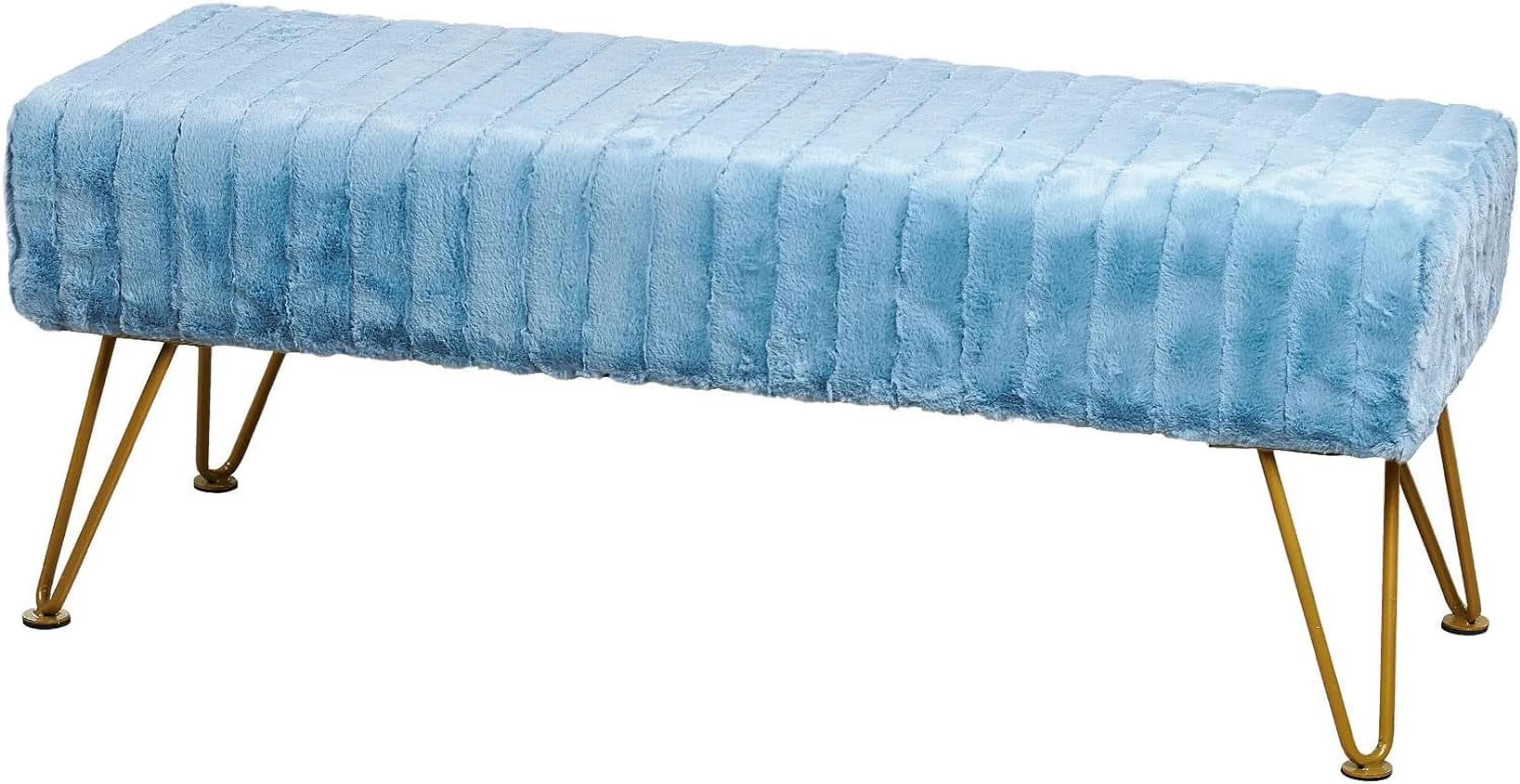 Super Mink Faux Fur Blue Ottoman Bench, 46" X 16" X 17" H, Living Room Foot Rest Stool Entryway Makeup Bench End Of Bed Bedroom Home Decor Chair For Sitting