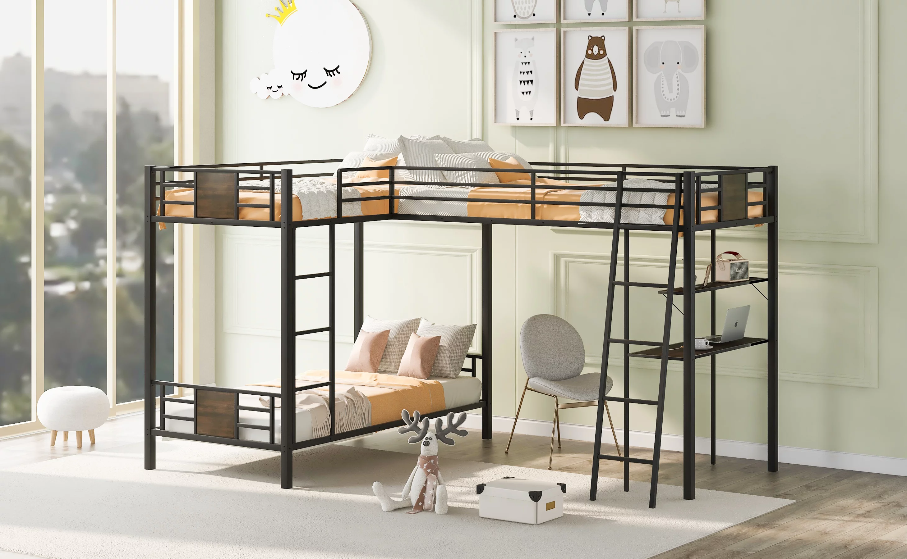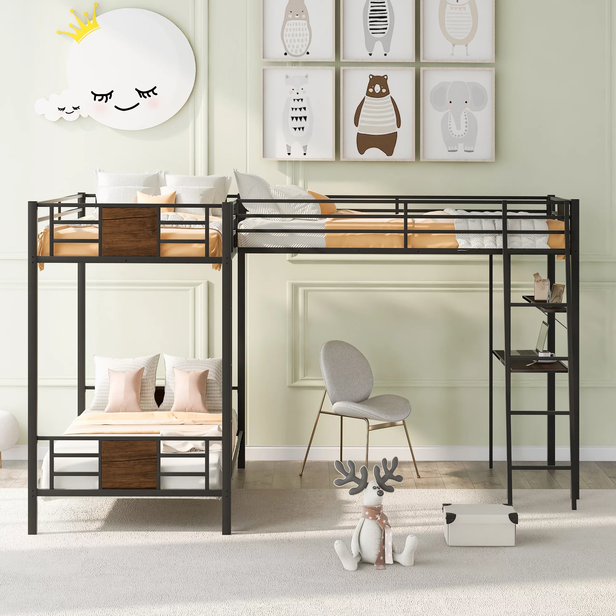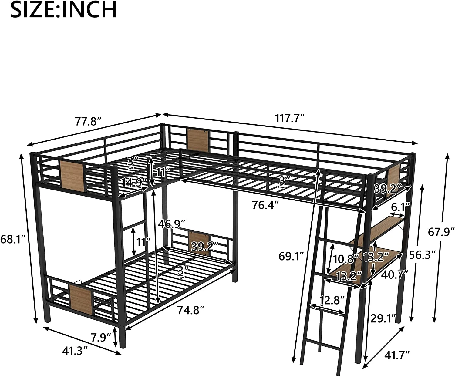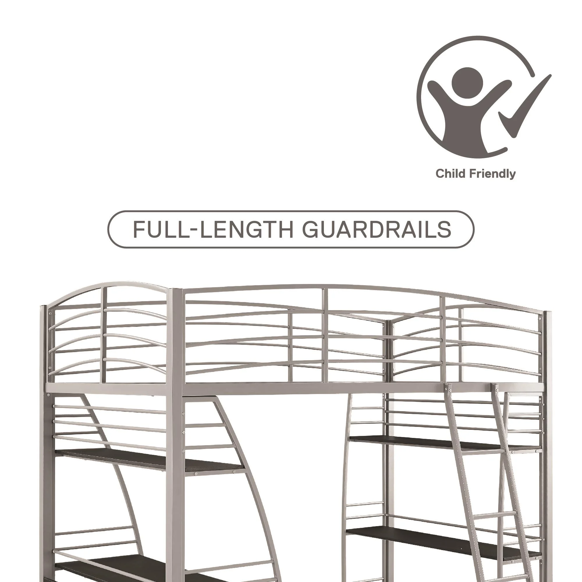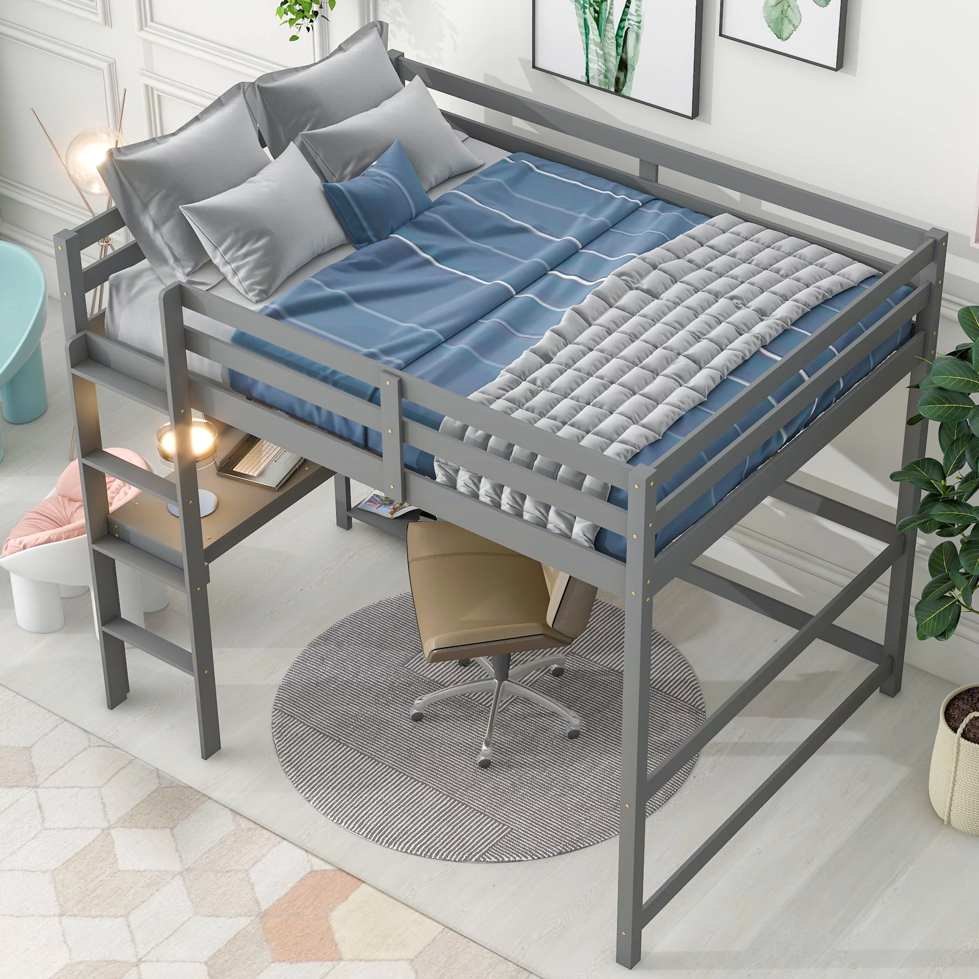 Gewnee Full Size Metal Loft Bed with Desk and Two Ladders for Kids and Teens,Black