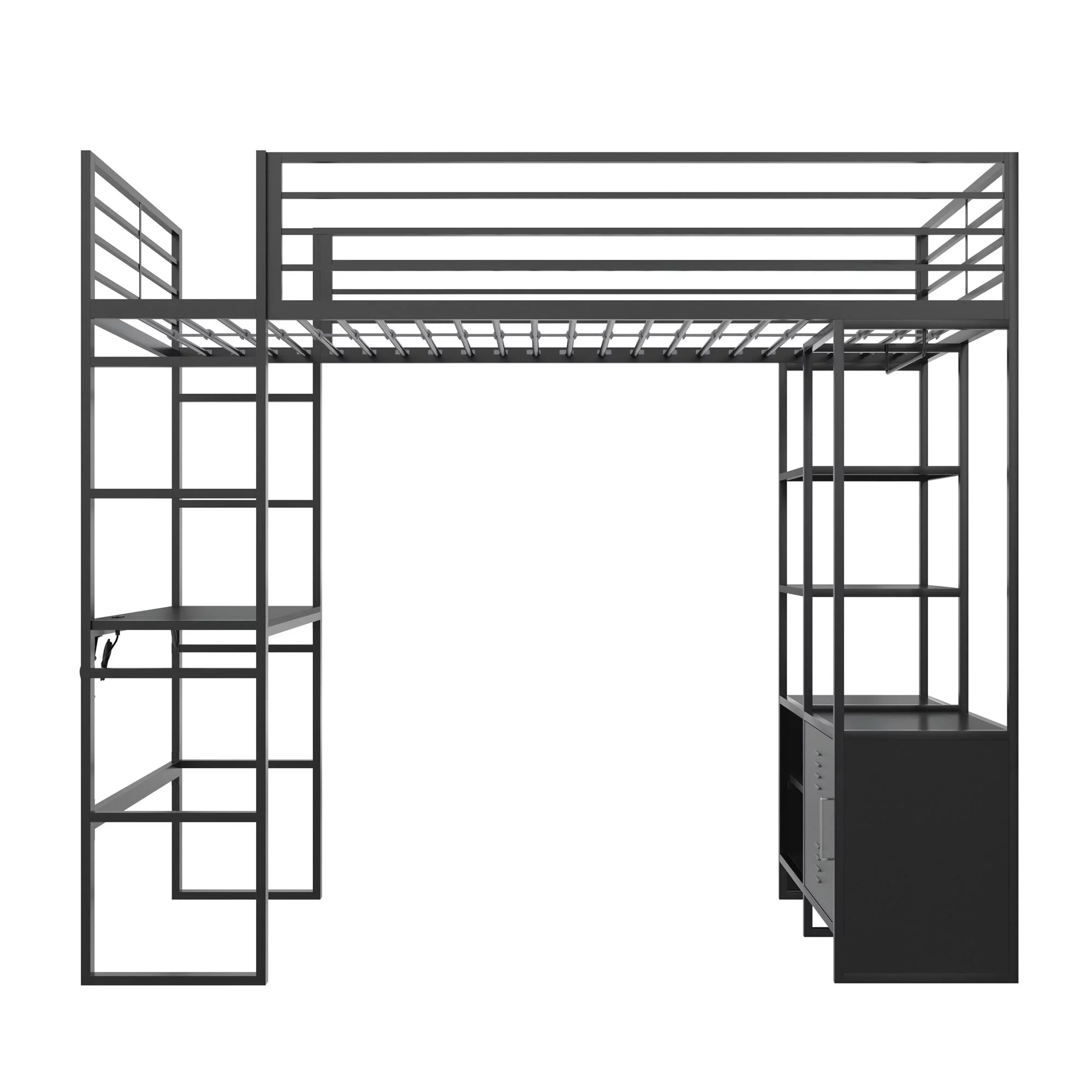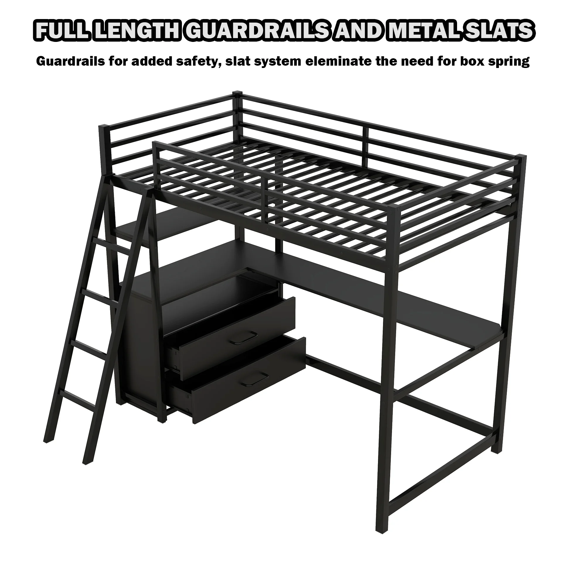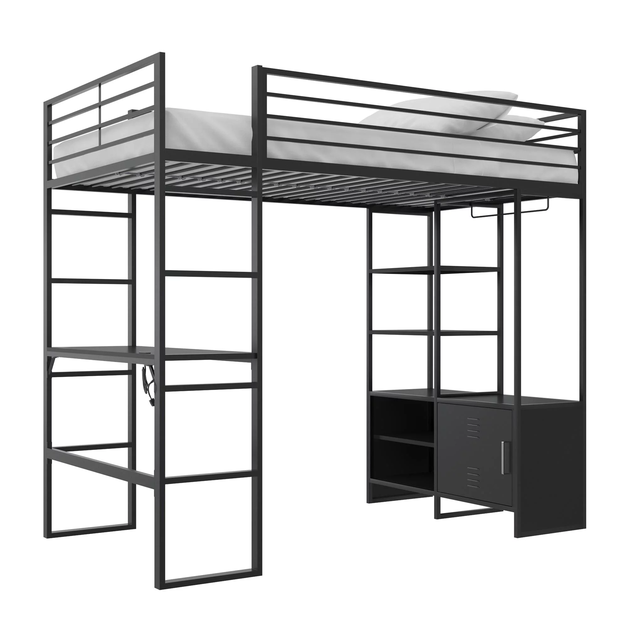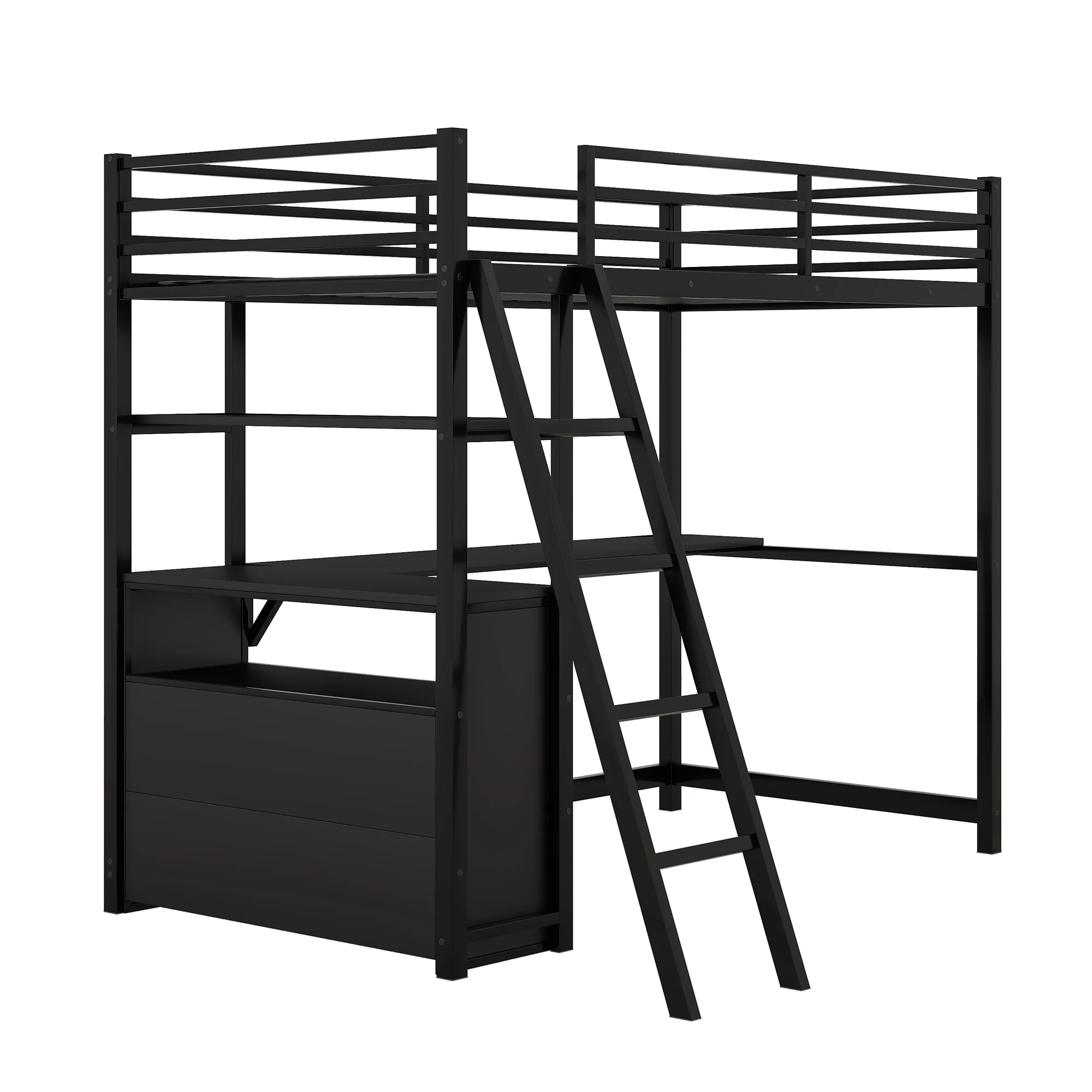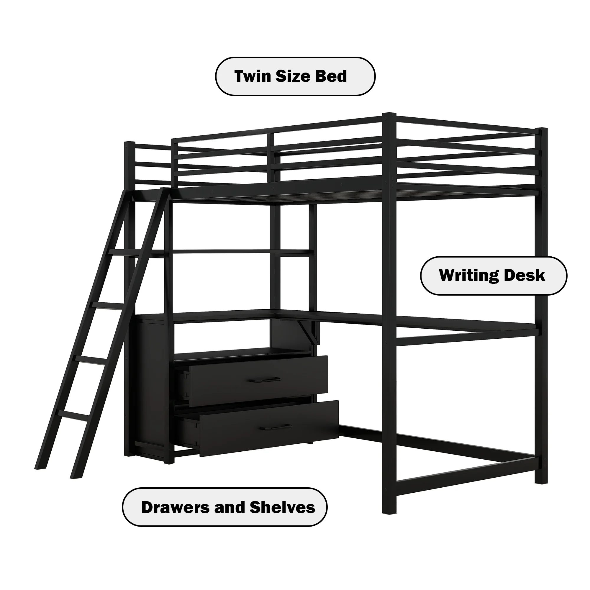 Gewnee Twin Size Metal Loft Bed with Desk and Shelving for Kids,Teens,Black