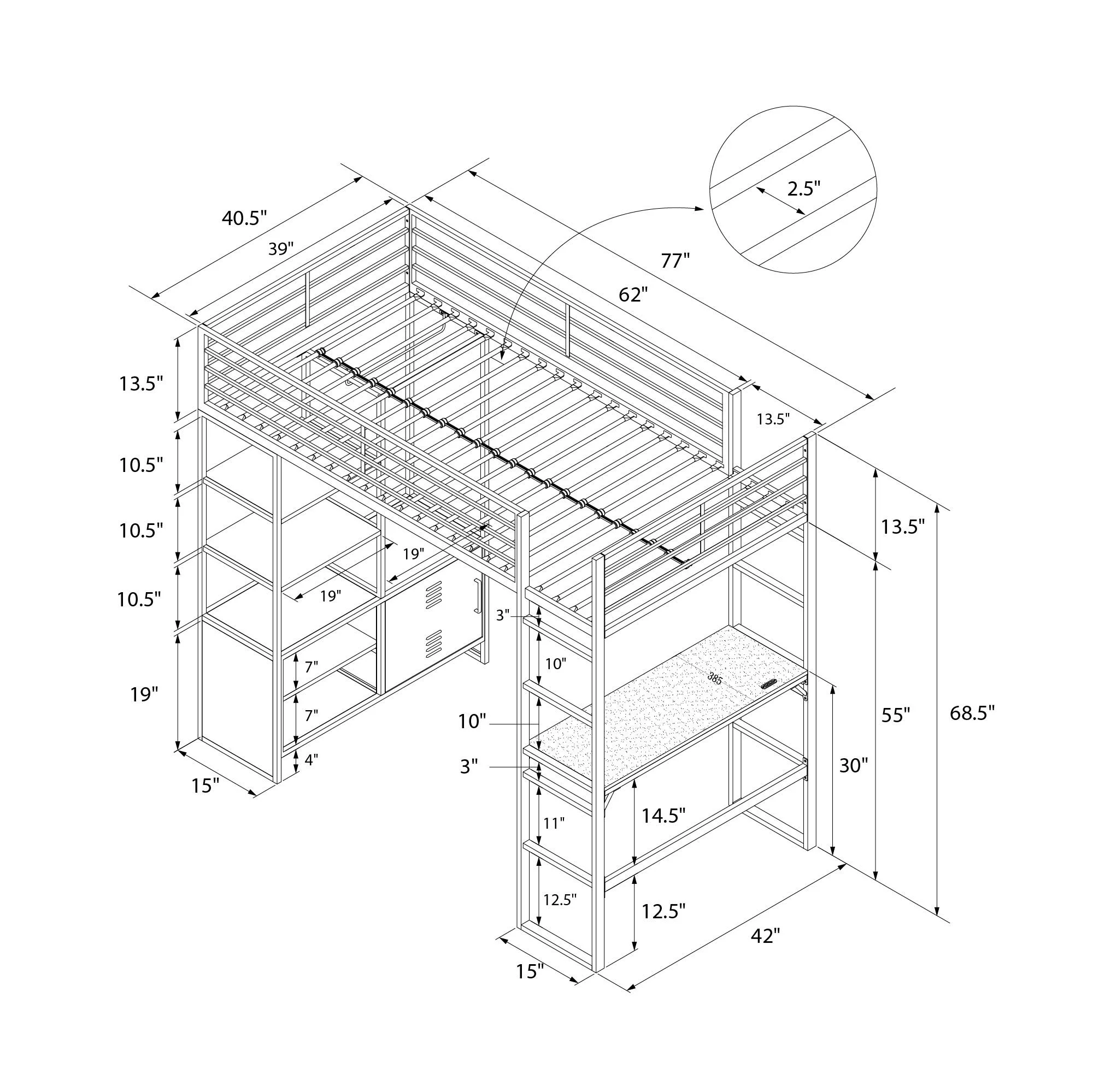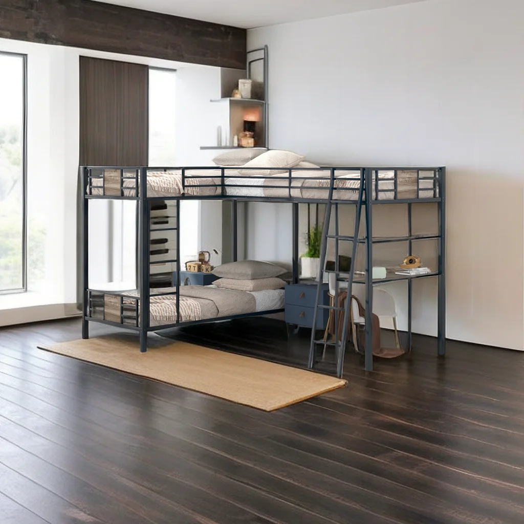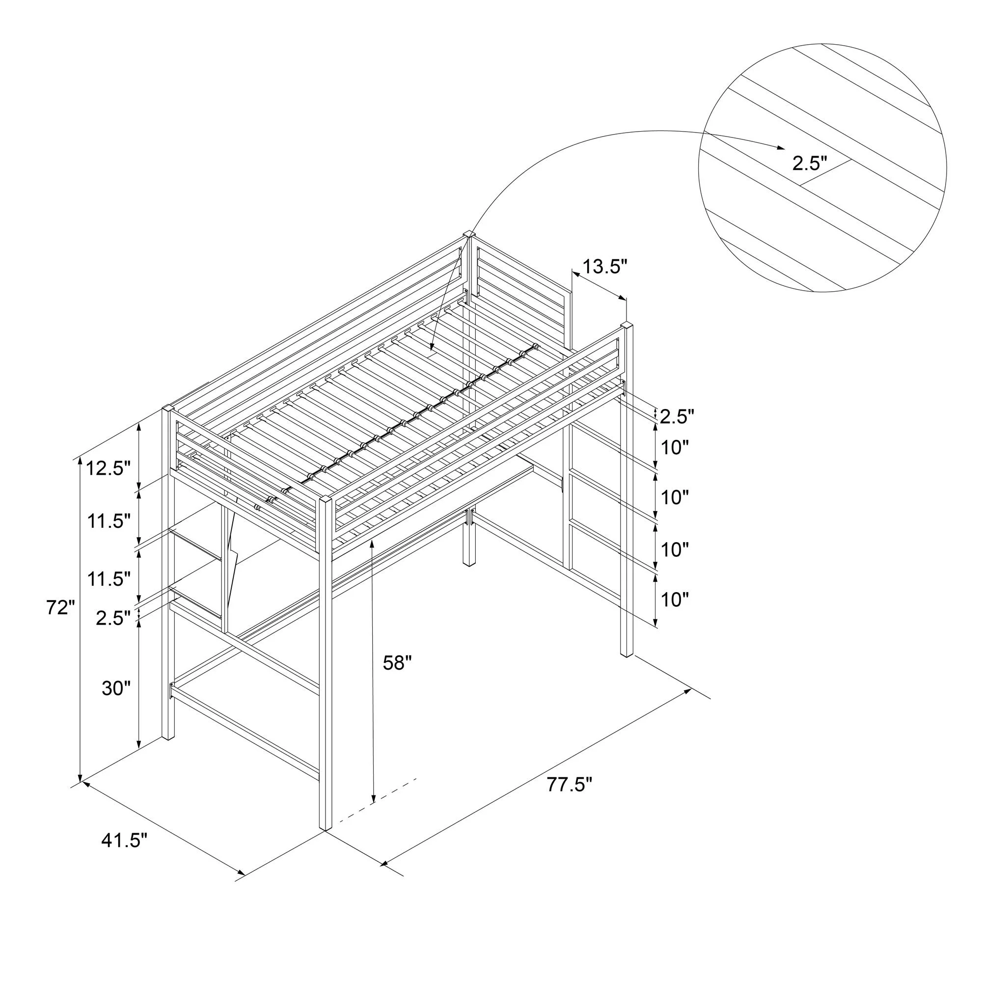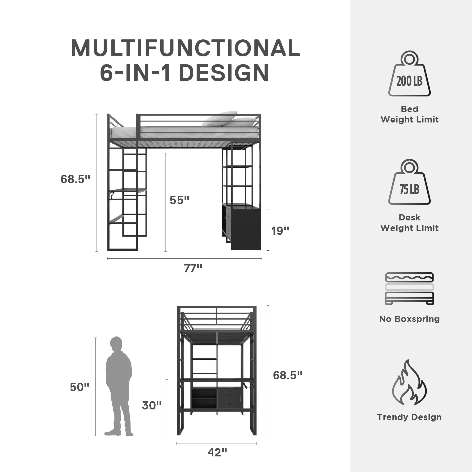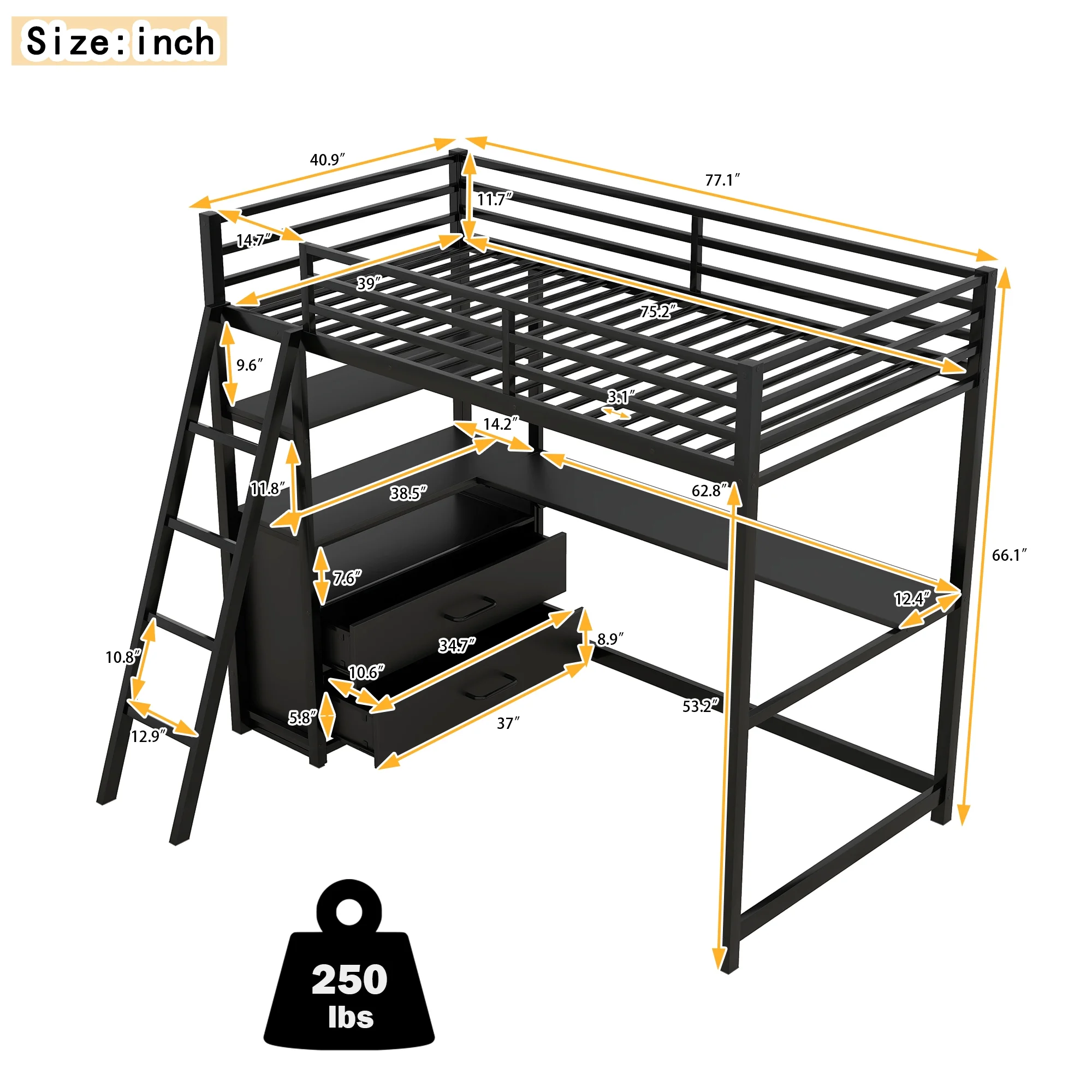 Gewnee Twin Size Metal Loft Bed with Desk and Shelving for Kids,Teens,Black