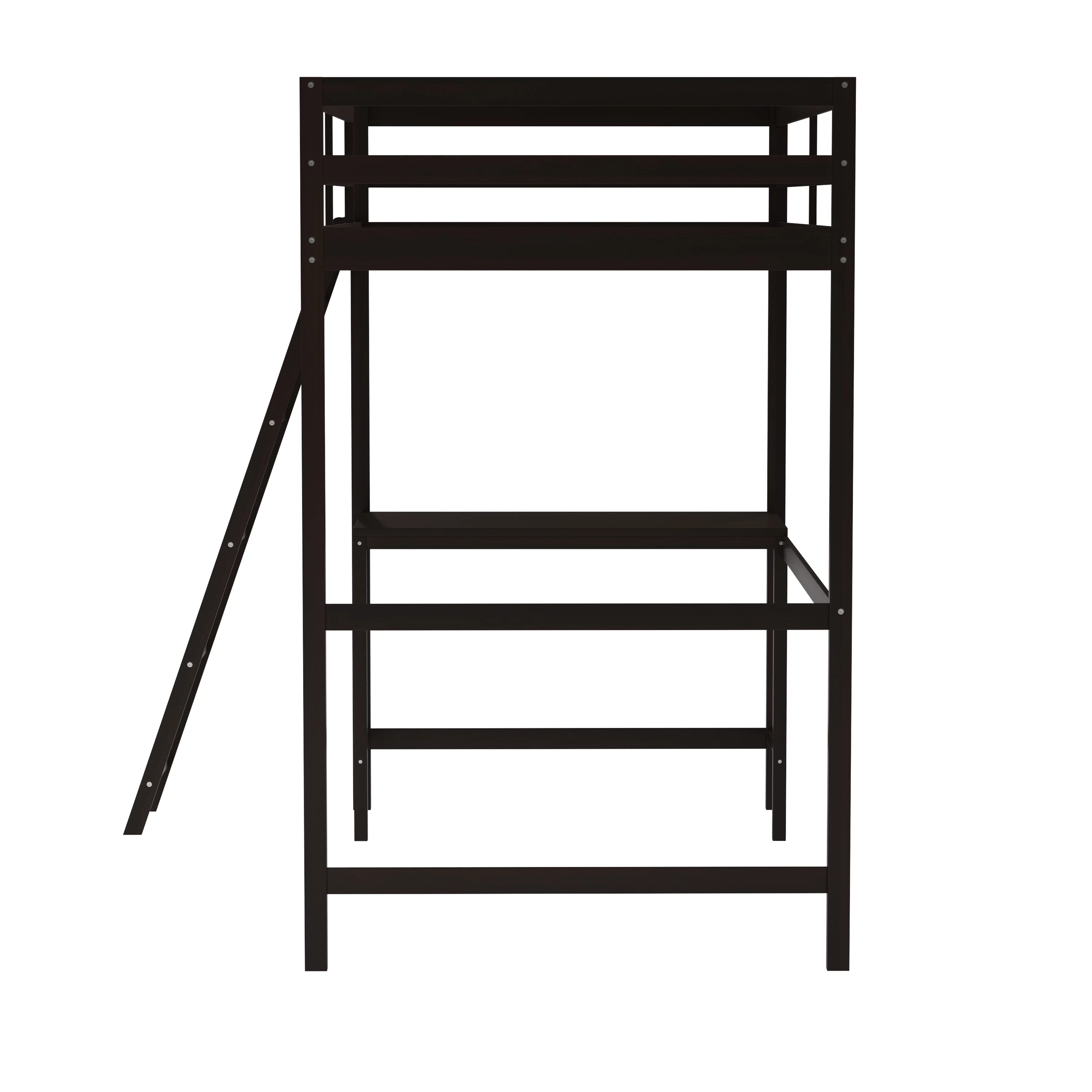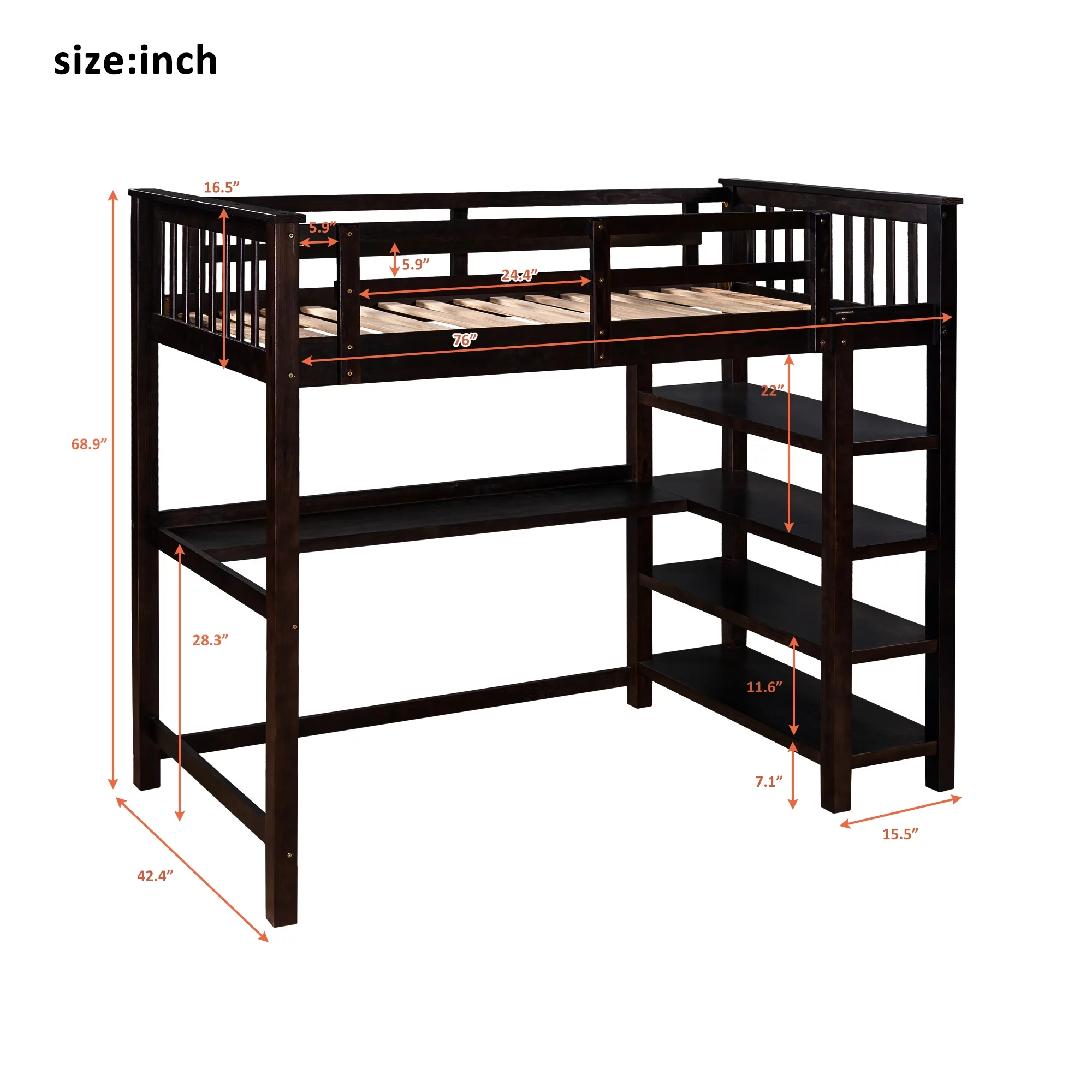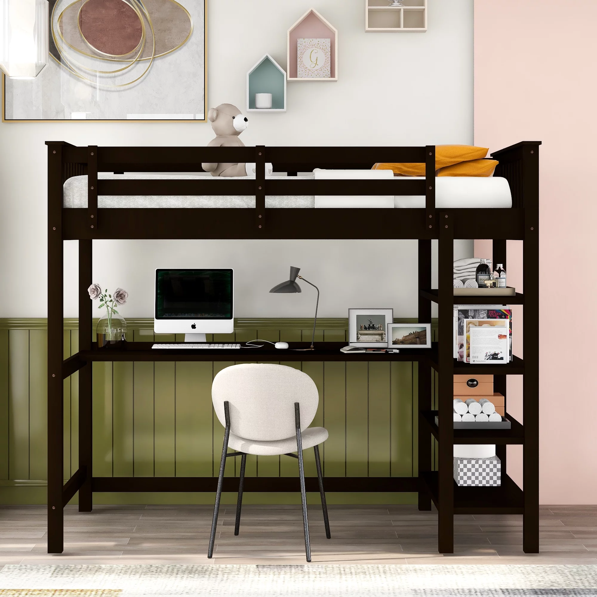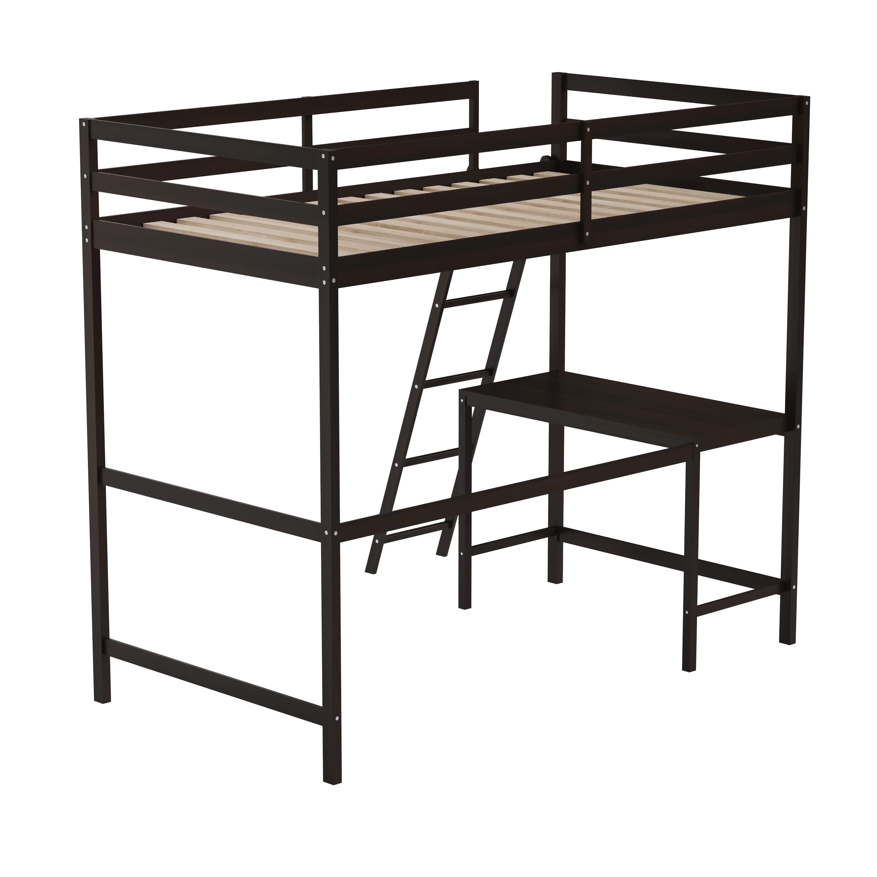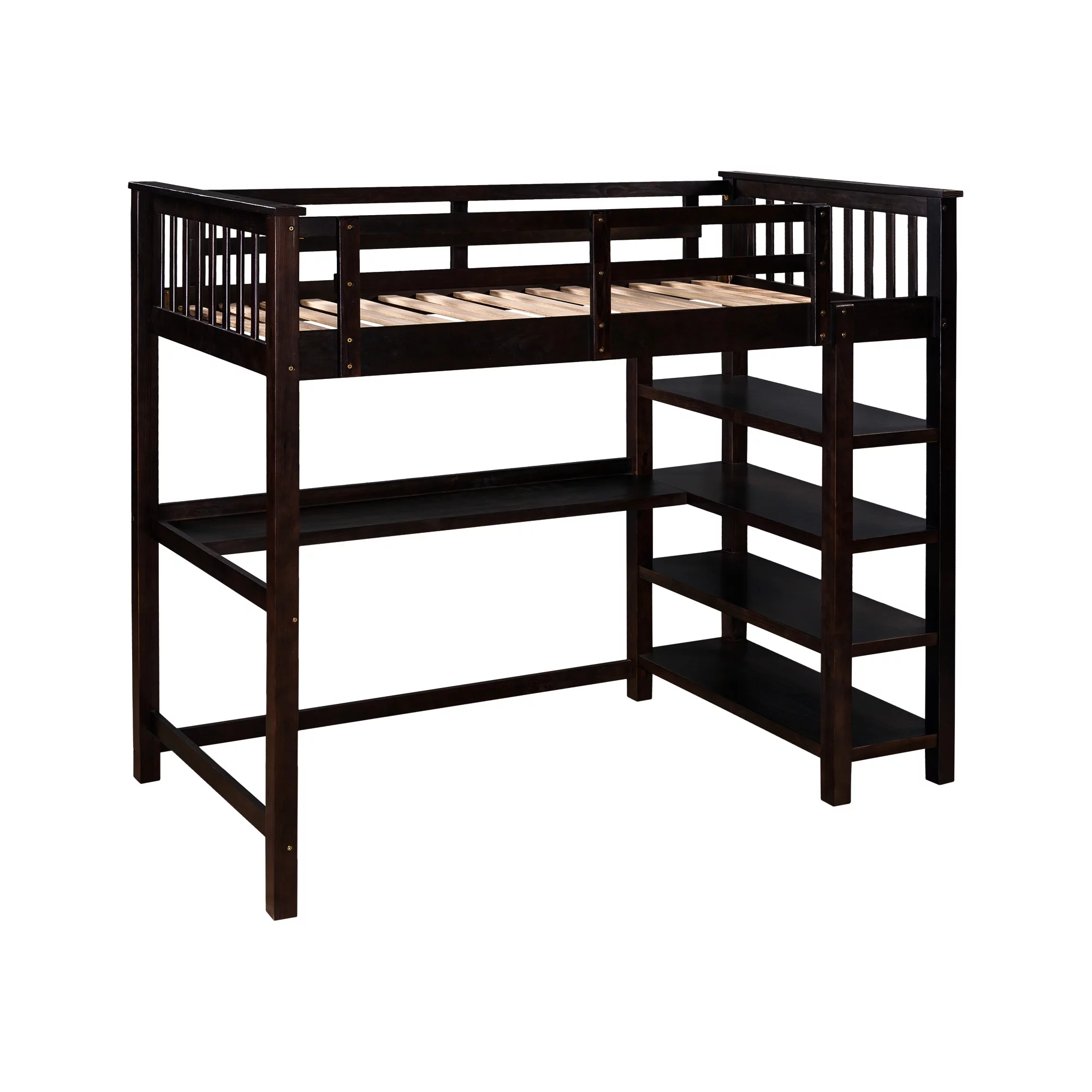 Euroco Wood Twin Loft Bed with Desk & Storage Shelves for Kids Bedroom, Espresso