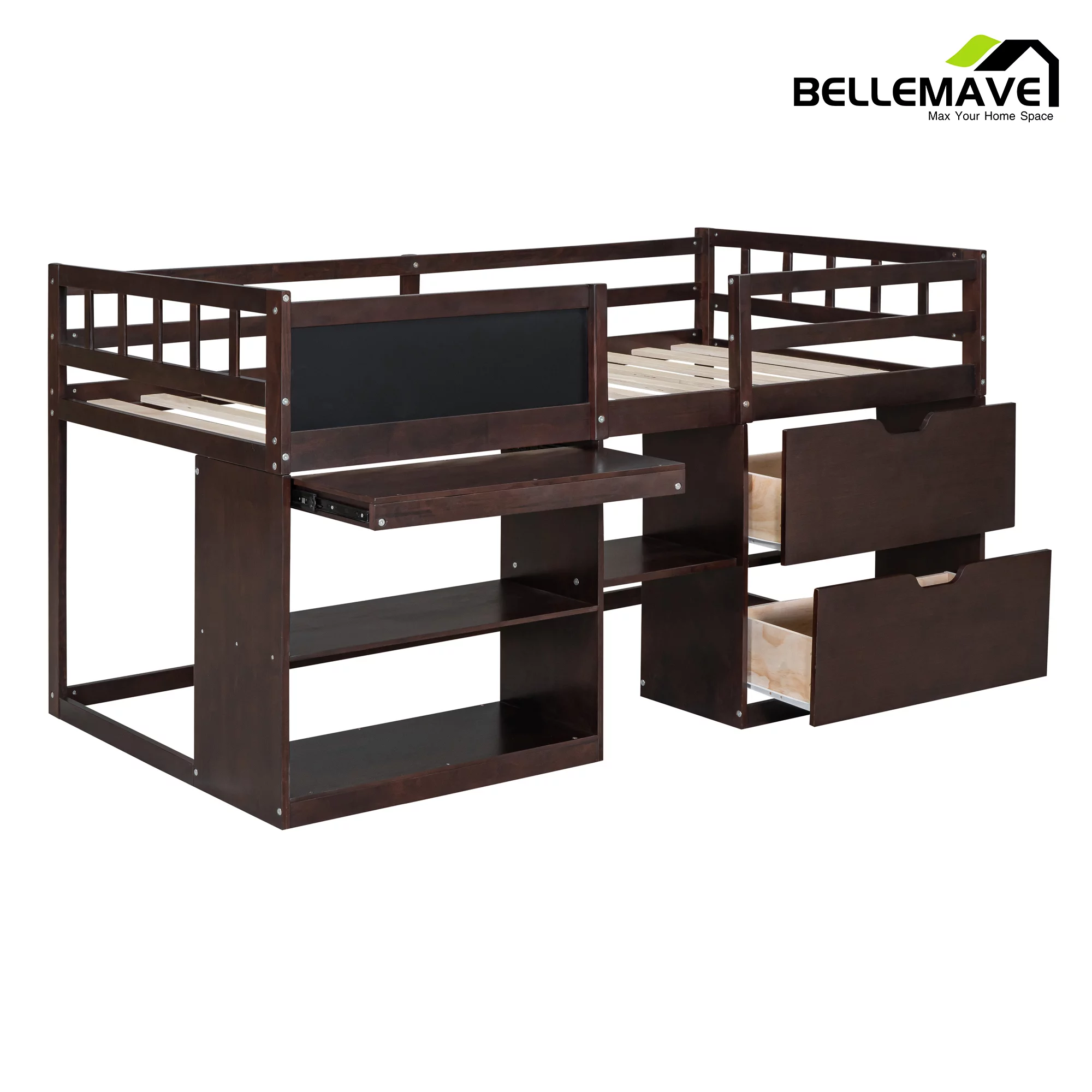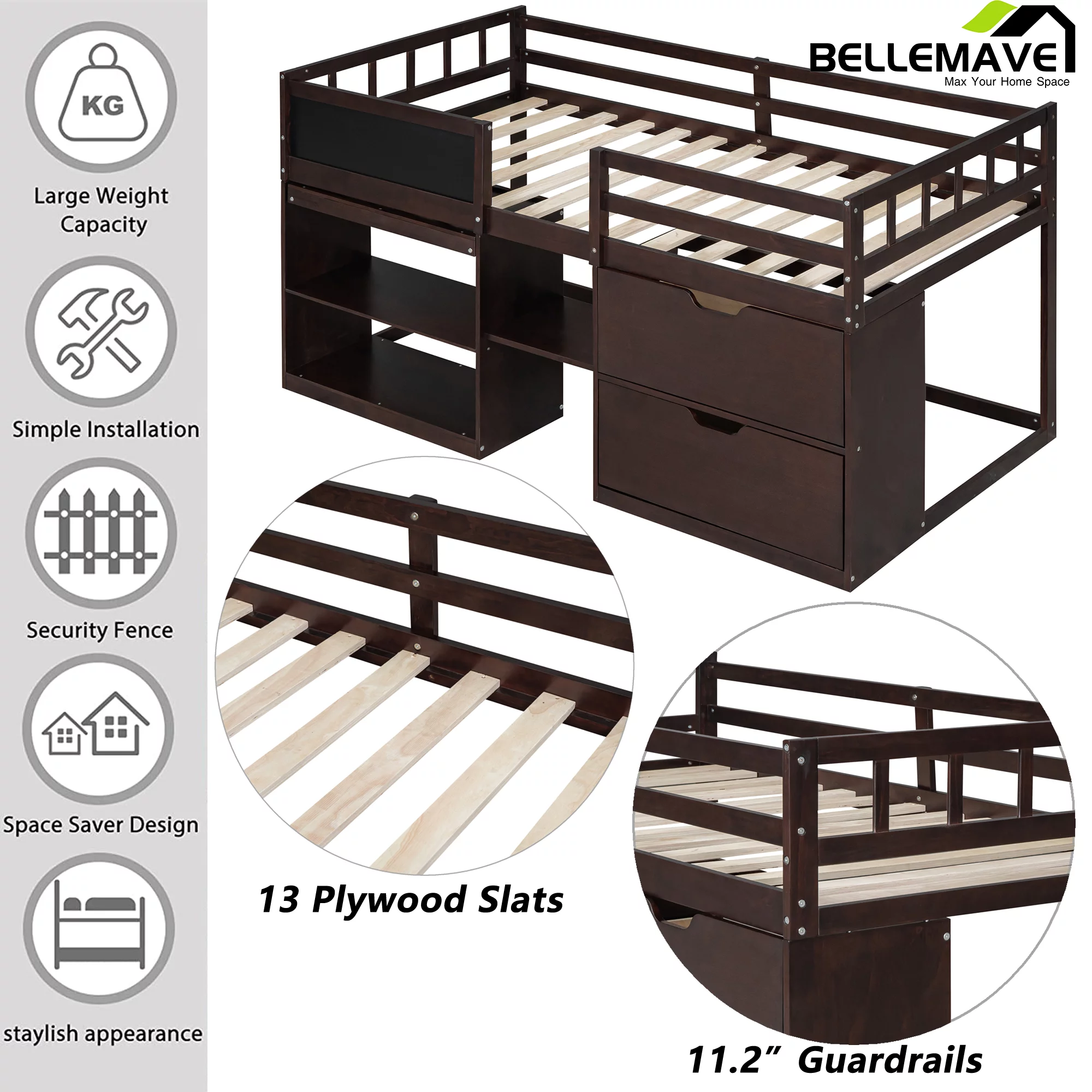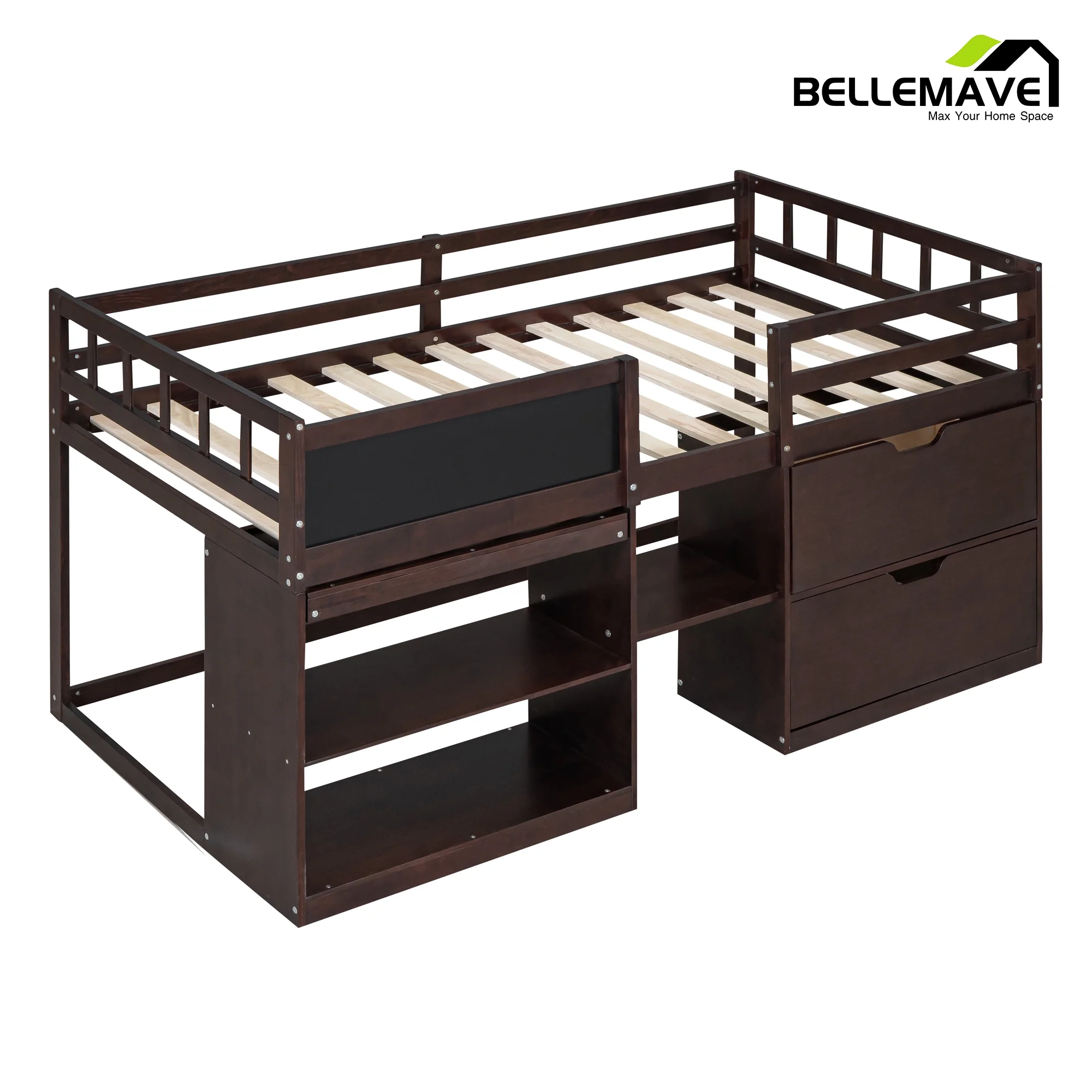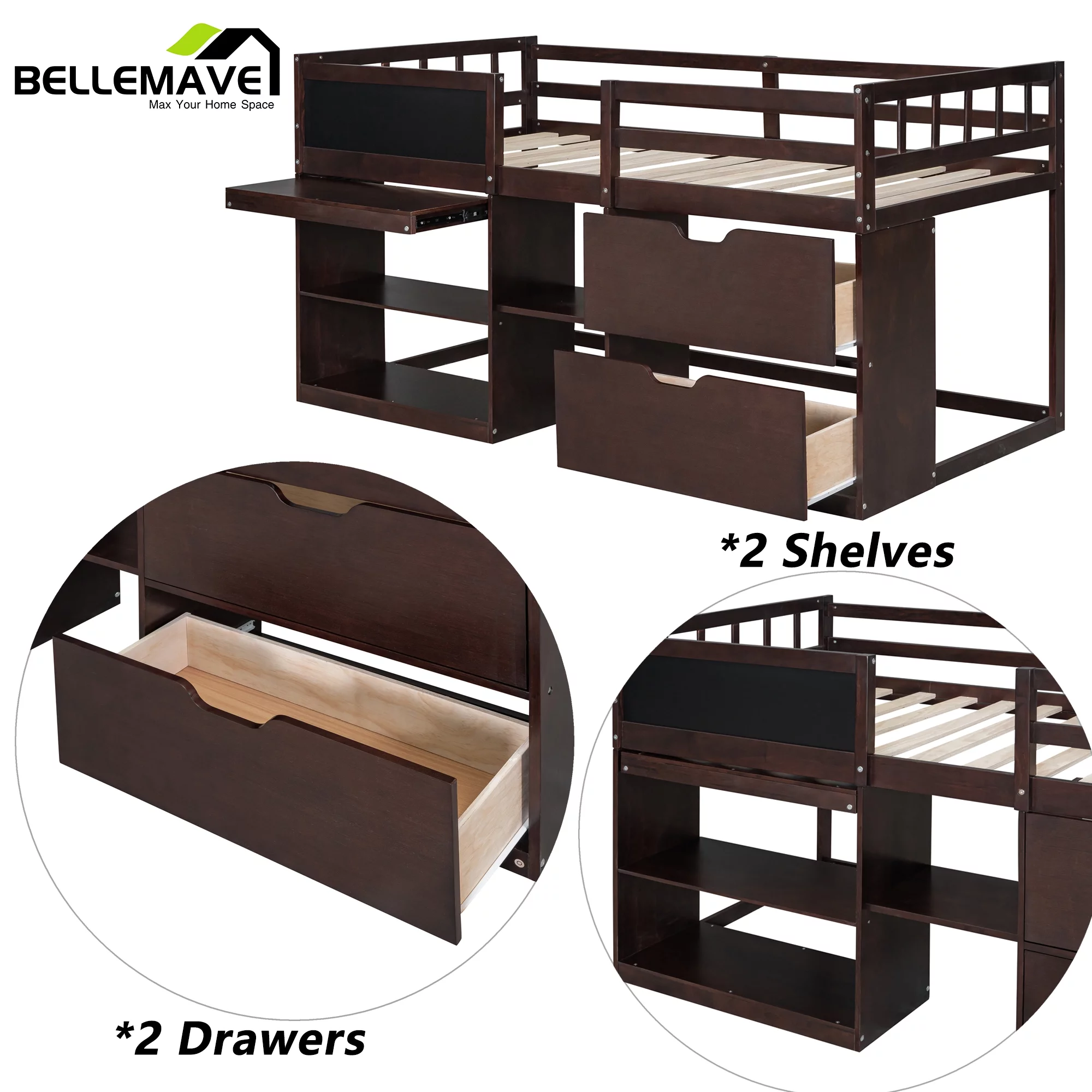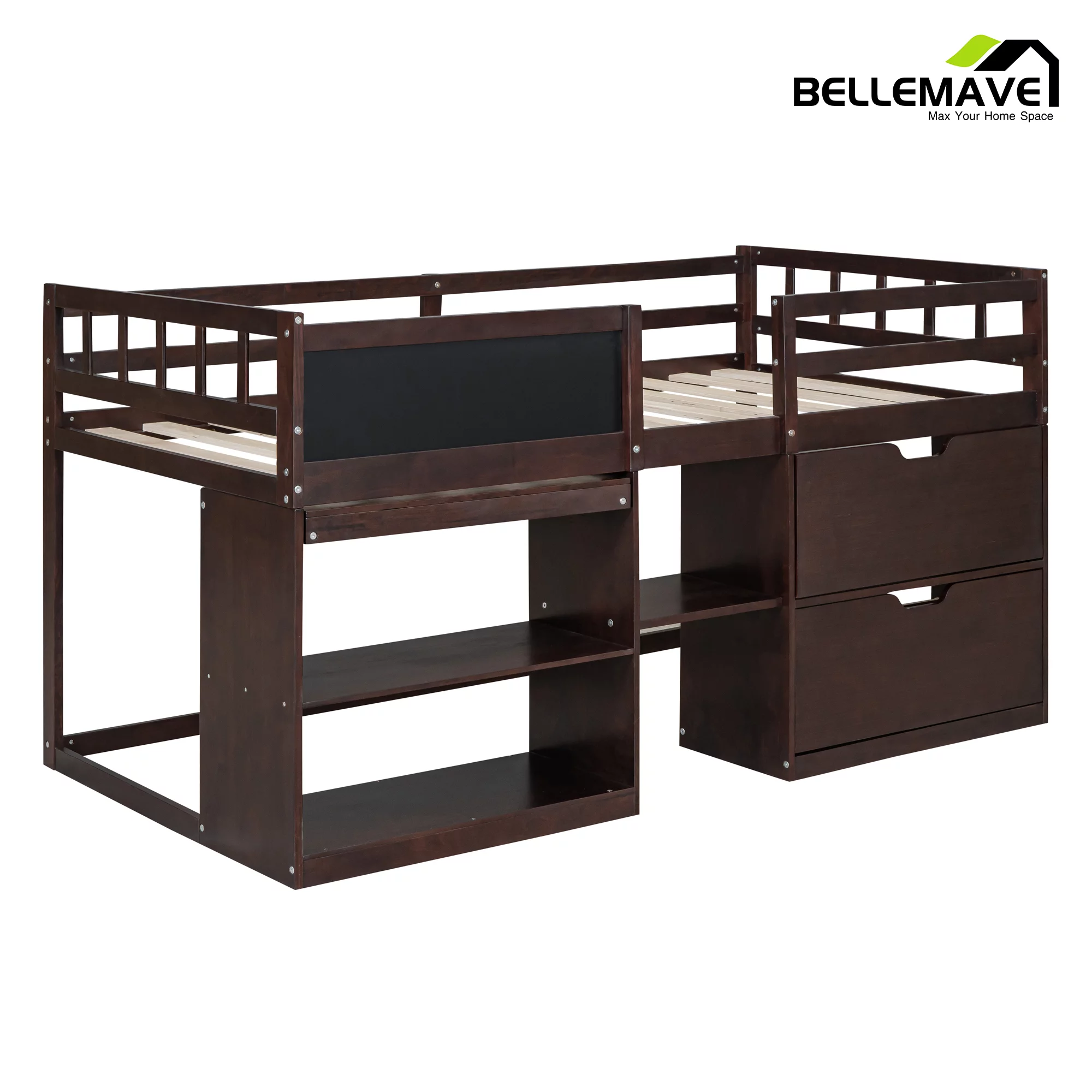 Euroco Wood Twin Loft Bed with Desk & Storage Shelves for Kids Bedroom, Espresso