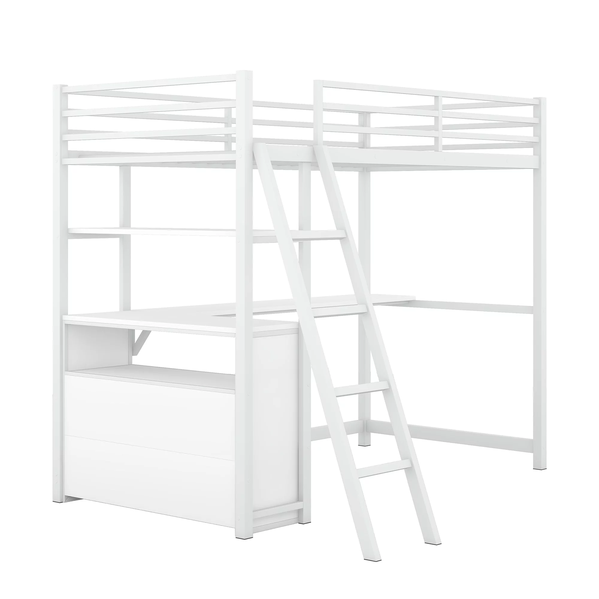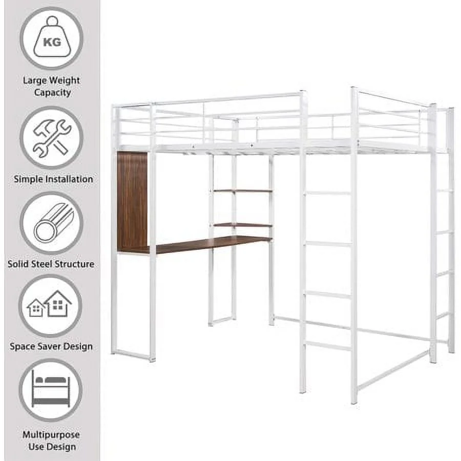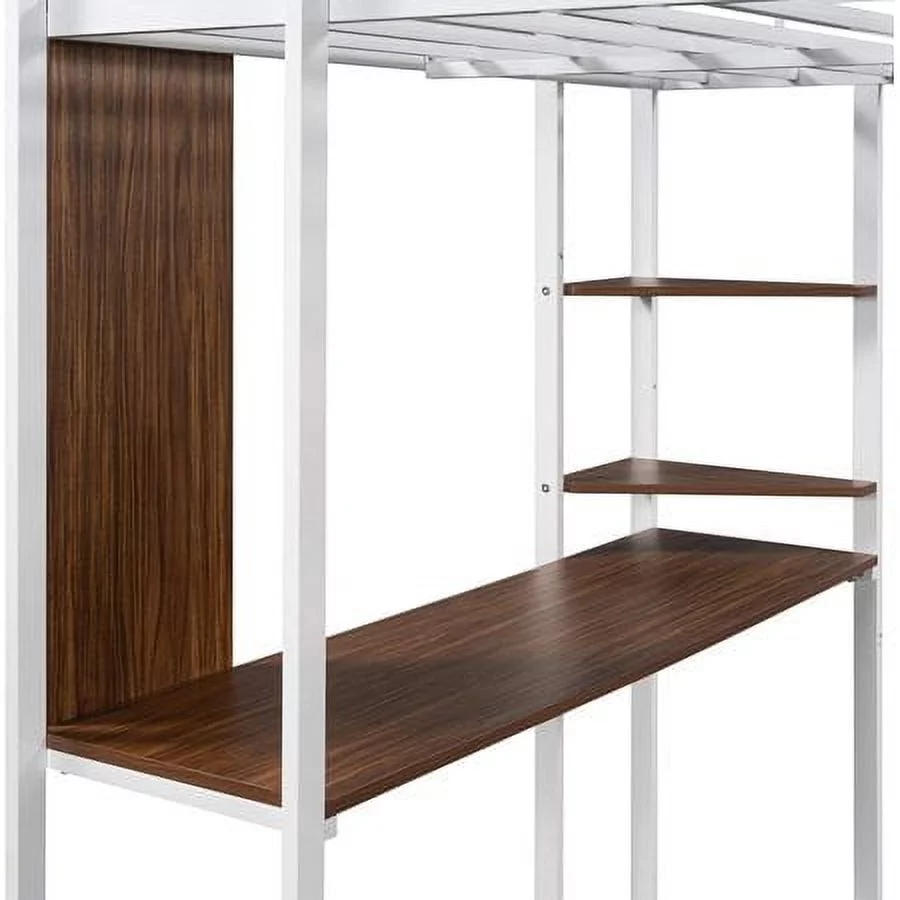 Nestfair White Twin Size Metal Loft Bed with Desk, Shelves and 2 Drawers
