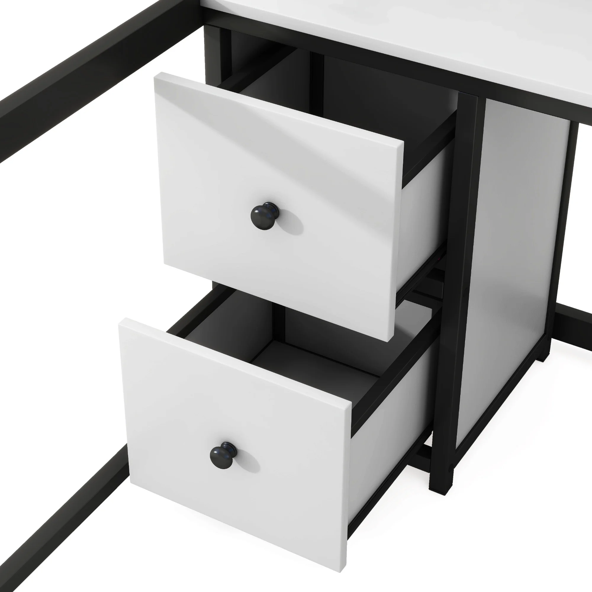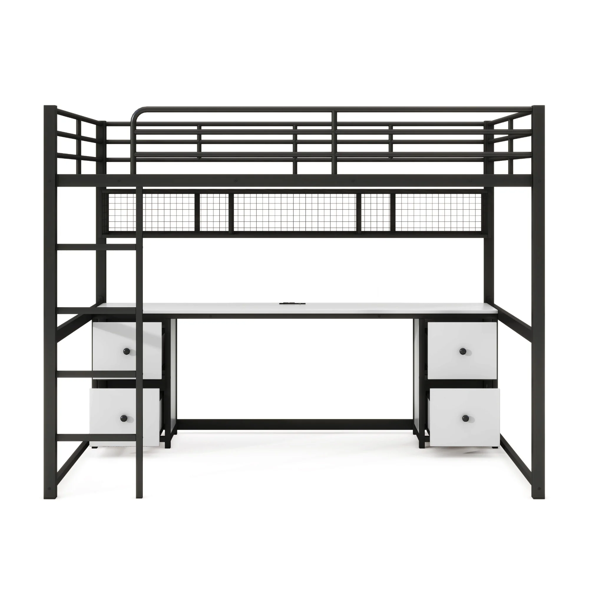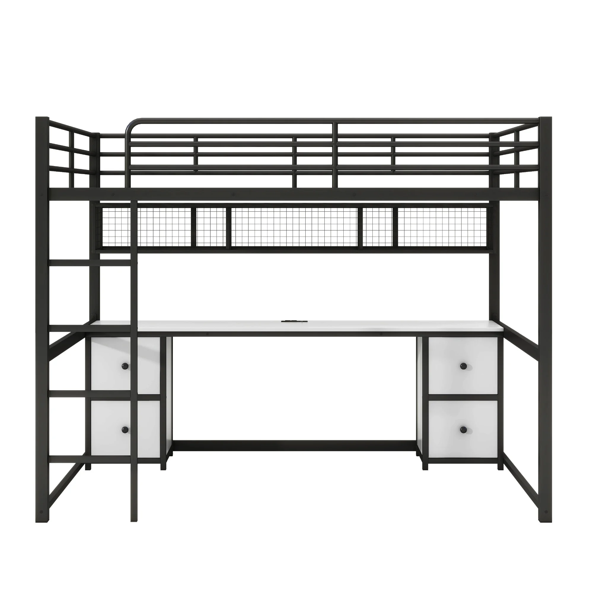 Nestfair White Twin Size Metal Loft Bed with Desk, Shelves and 2 Drawers