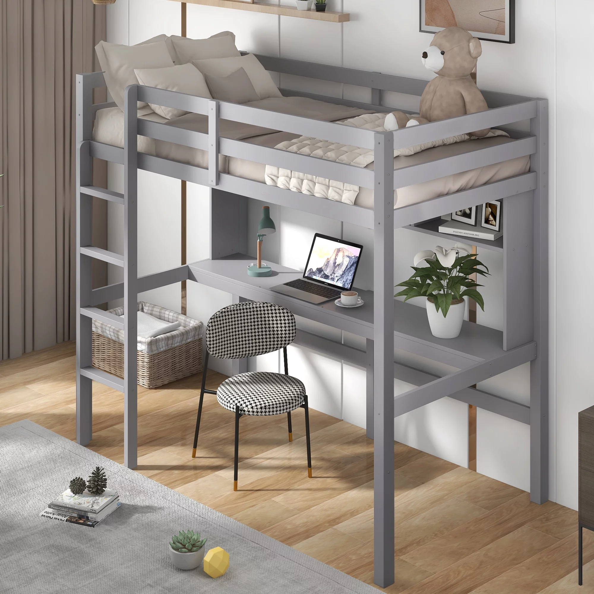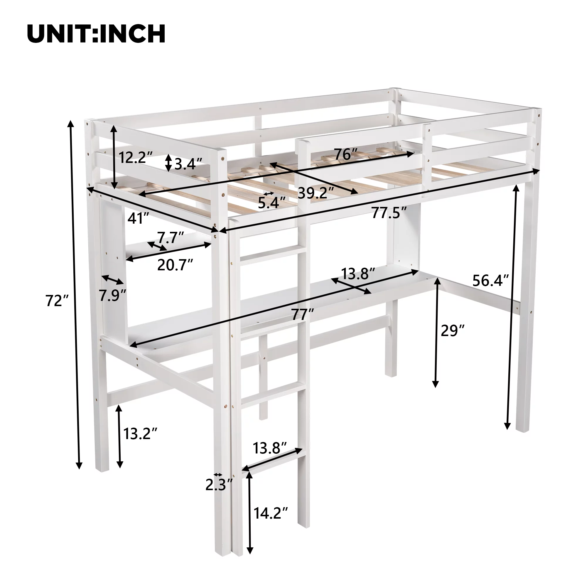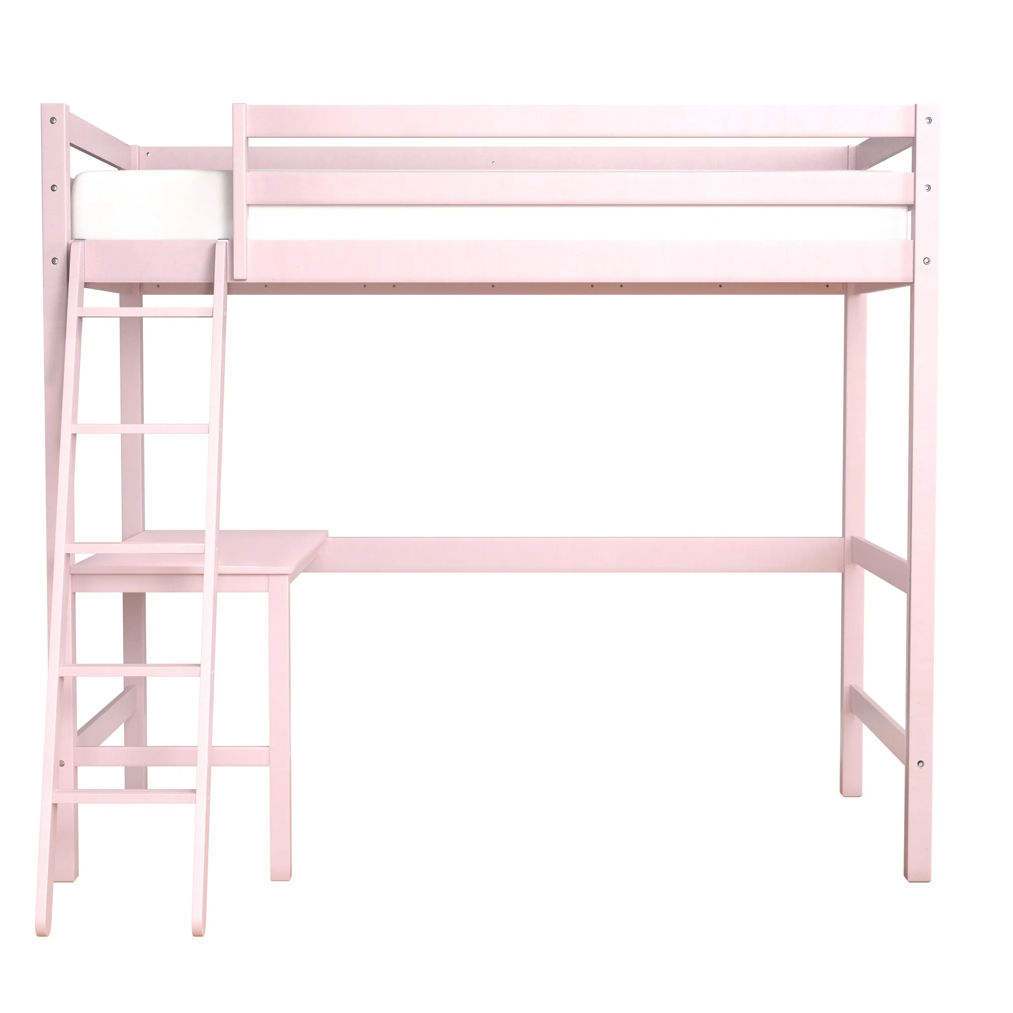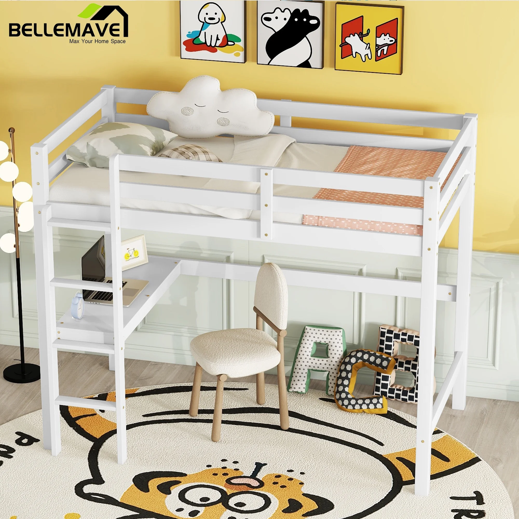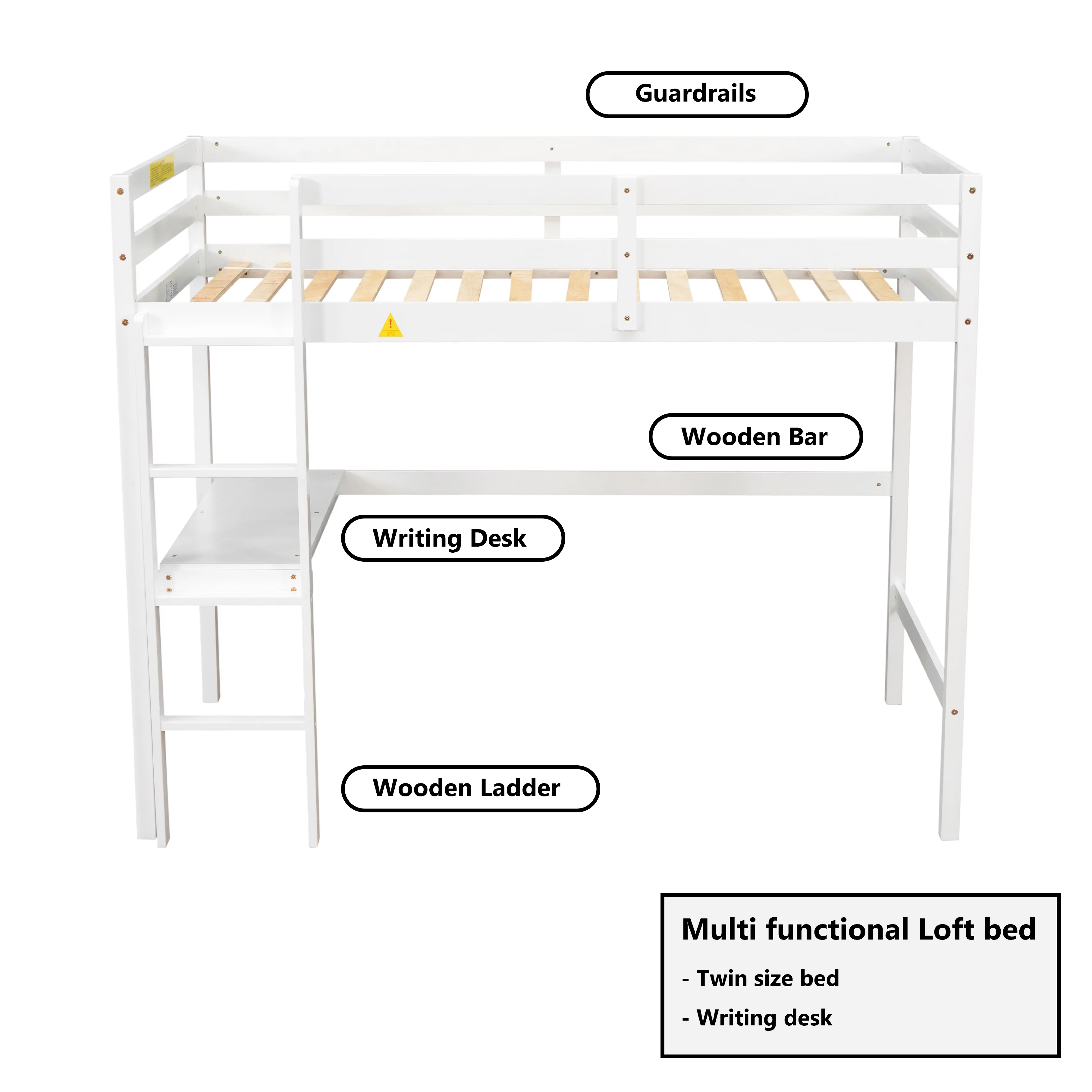 Gewnee Pine Wood Twin Size Loft Bed with Built-in Desk and Ladder for Kids Room,White