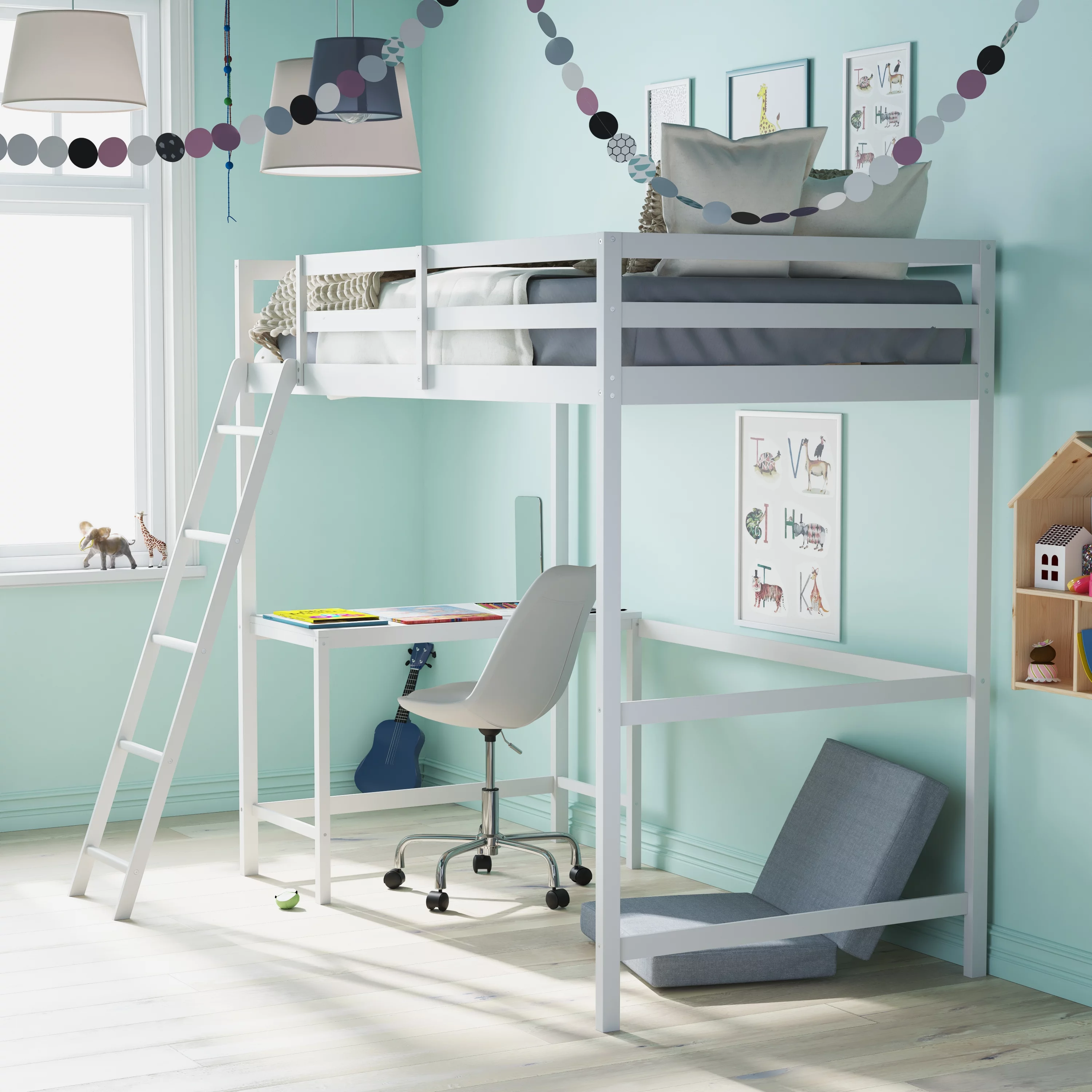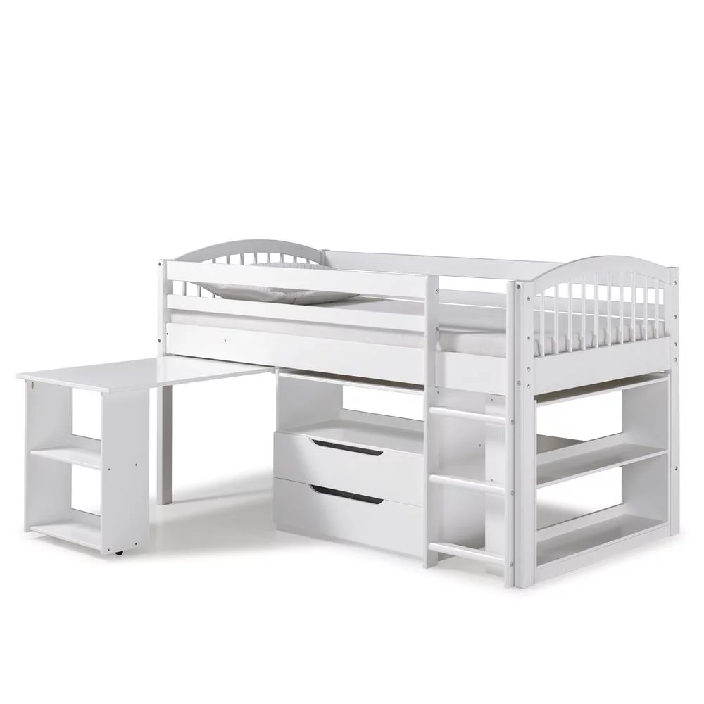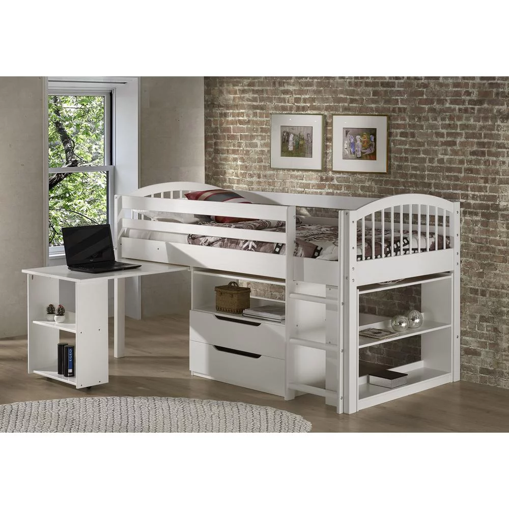 Addison Wood Junior Loft Bed with Storage Drawers, Bookshelf, and Desk, White