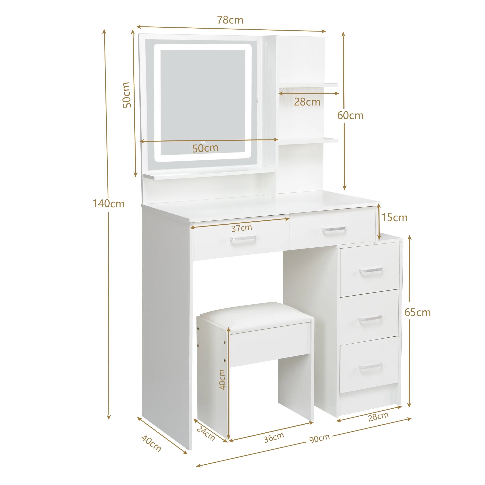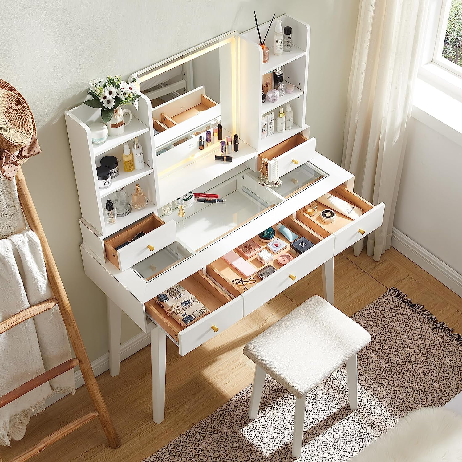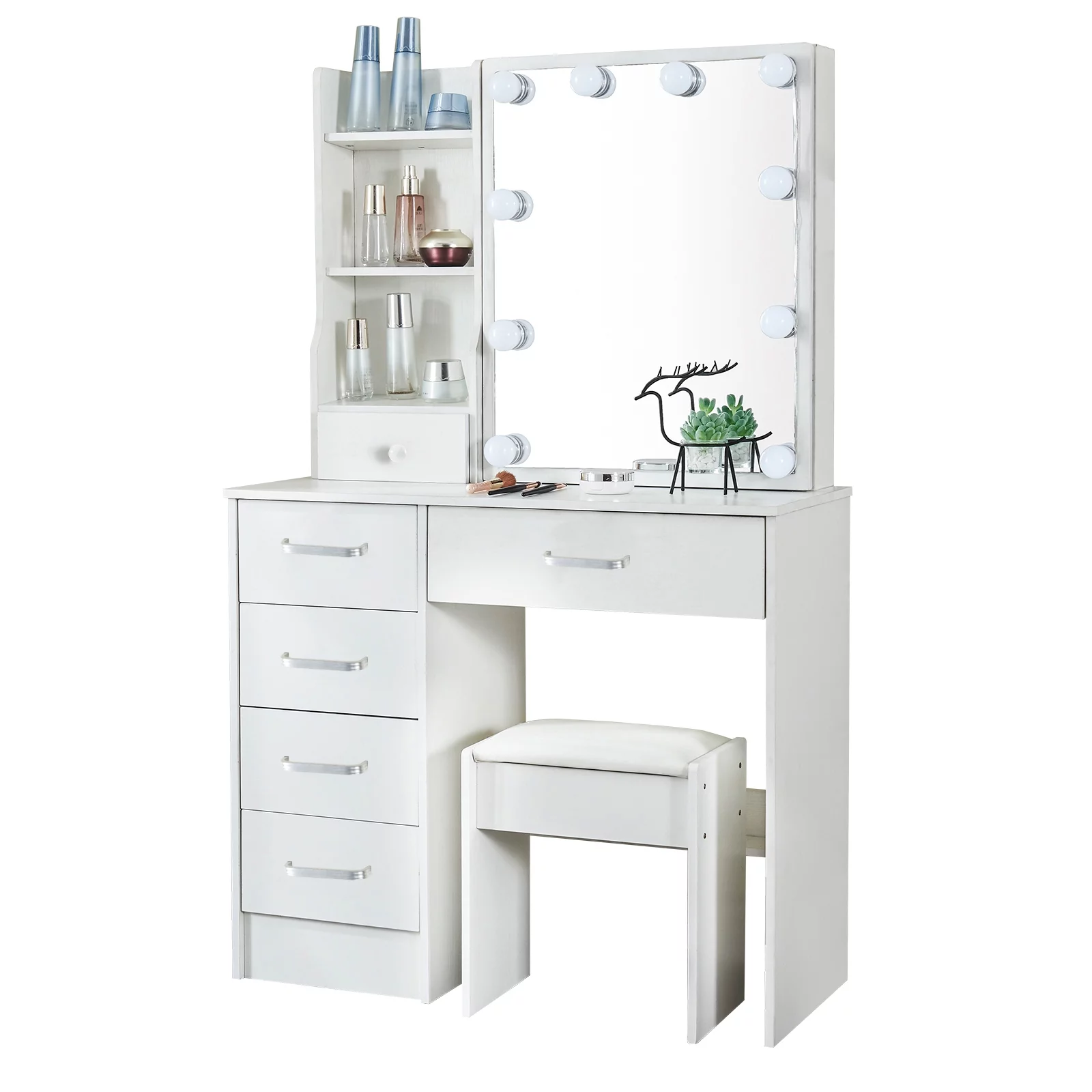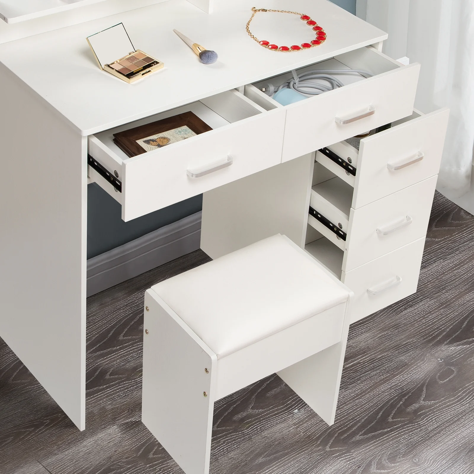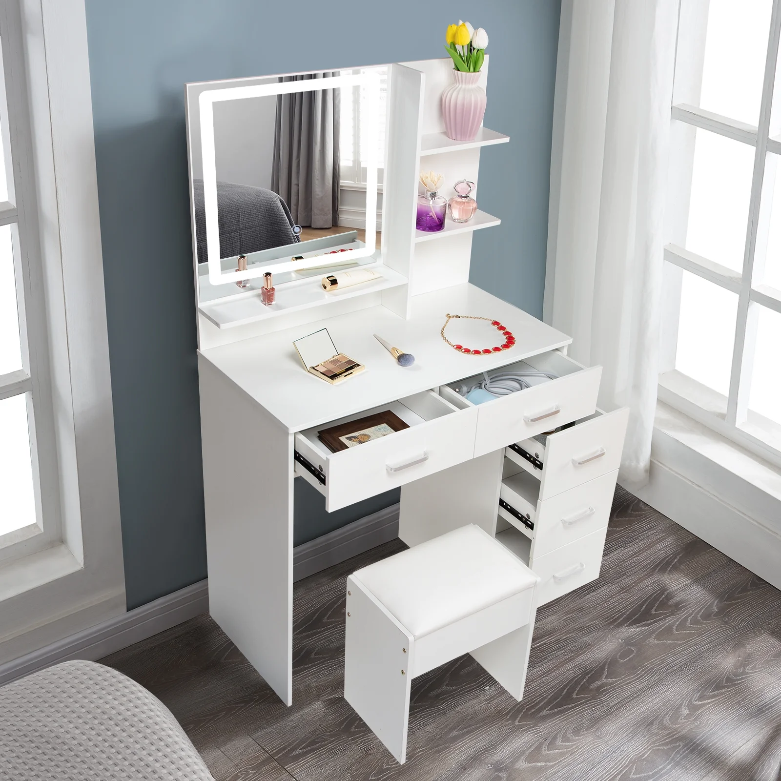 JBLCC Modern Vanity Set with Lighted Mirror, Makeup Table with Drawers, Dressing Table Makeup Desk with Stool, White