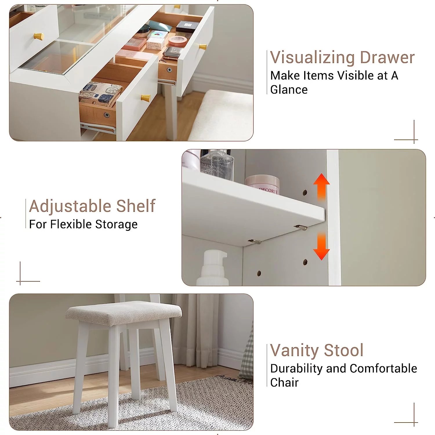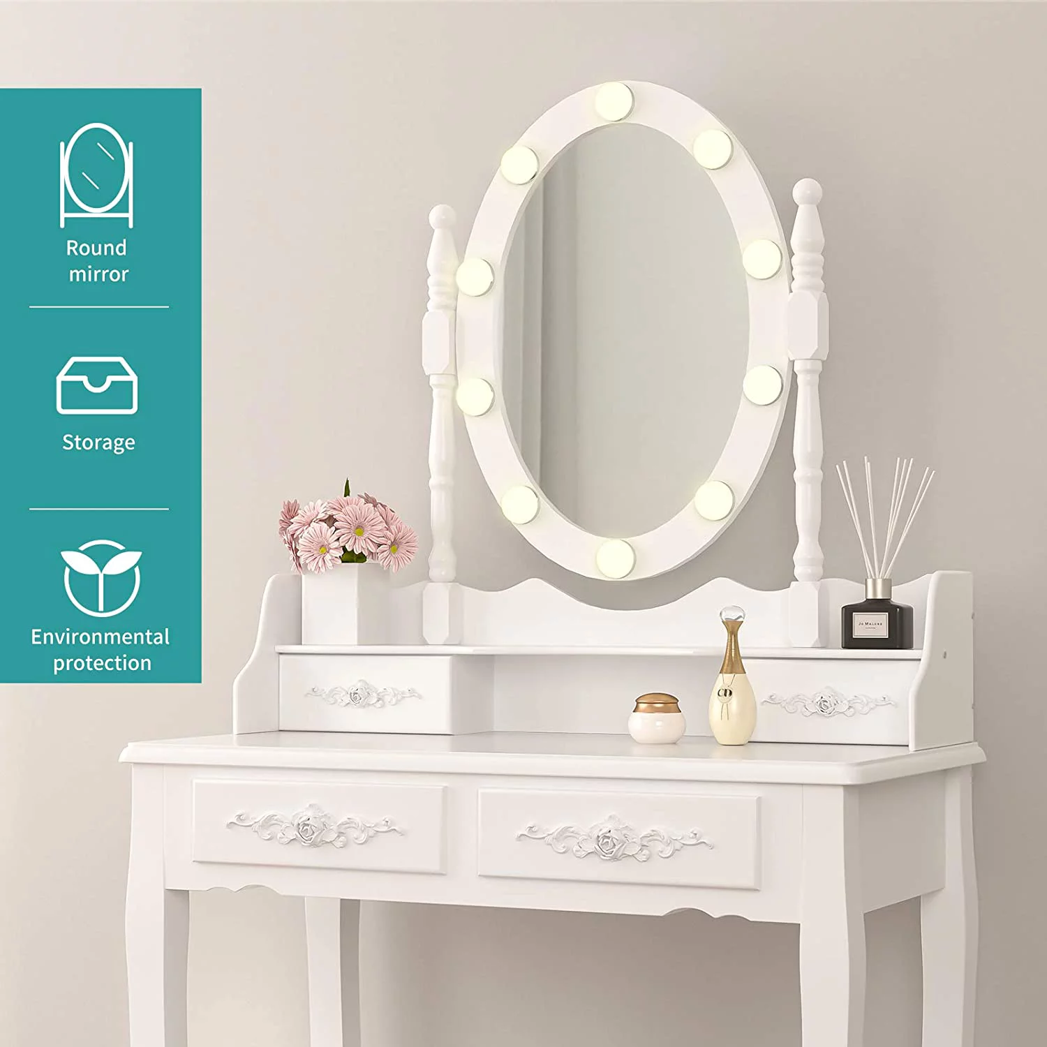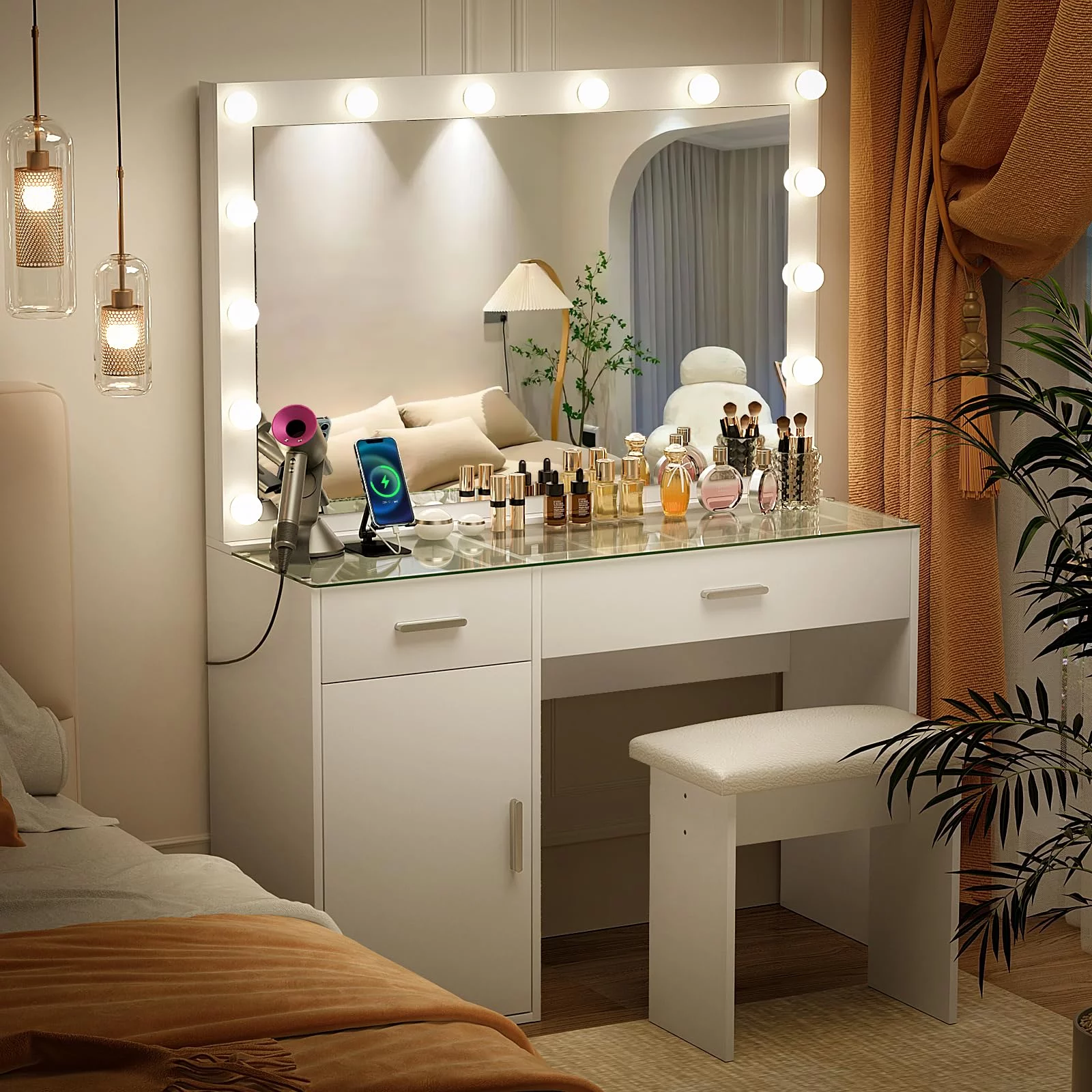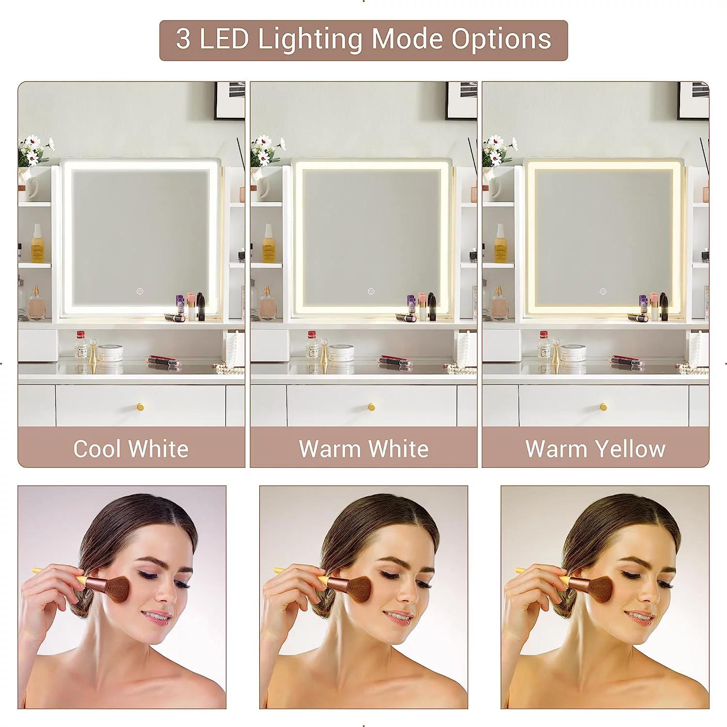 JBLCC Modern Vanity Set with Lighted Mirror, Makeup Table with Drawers, Dressing Table Makeup Desk with Stool, White