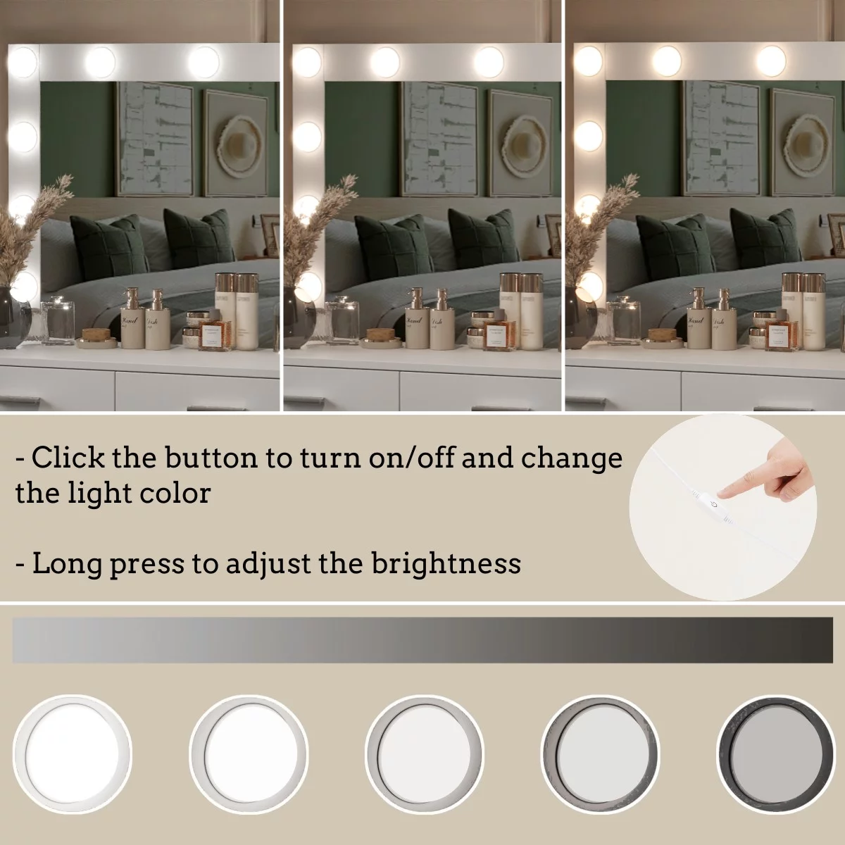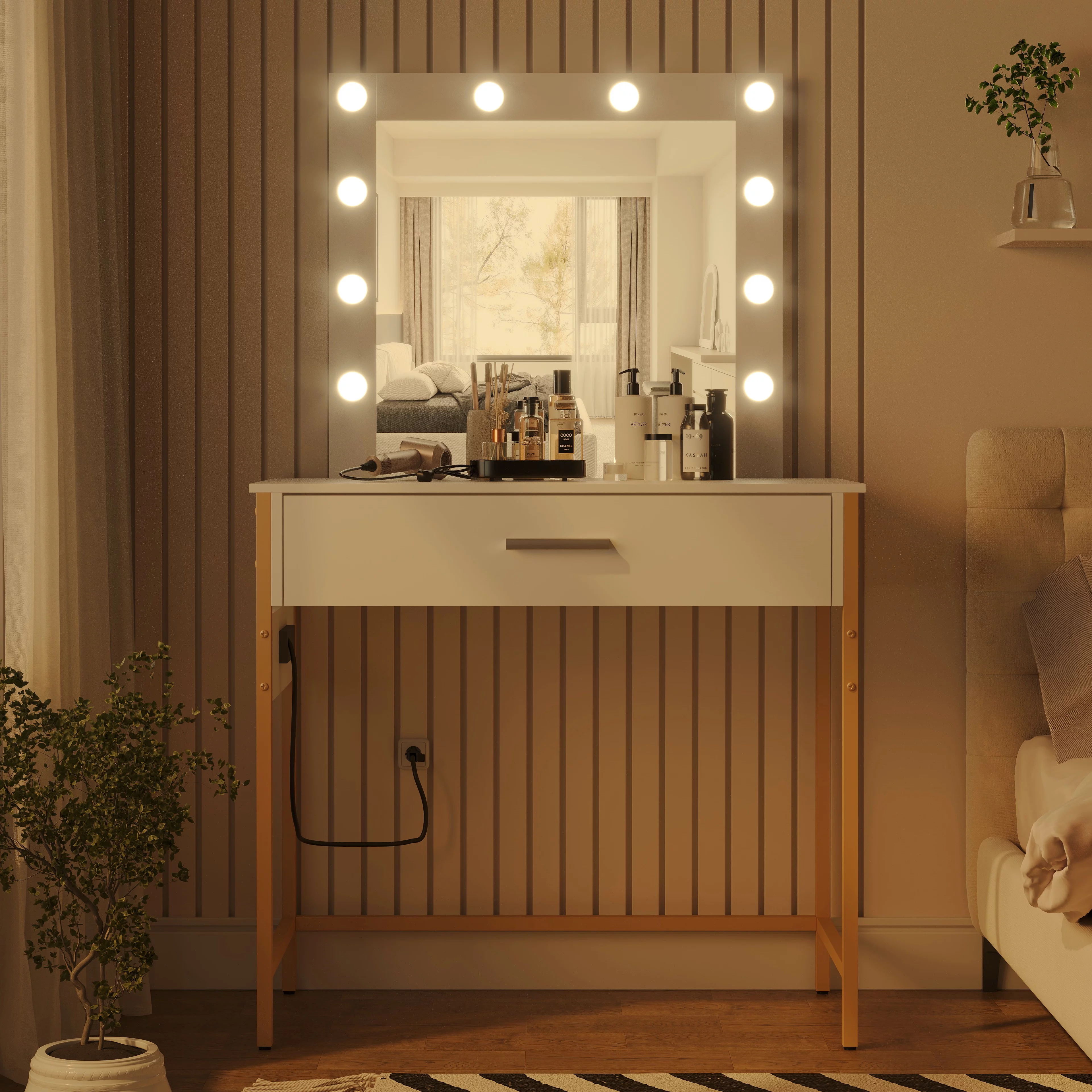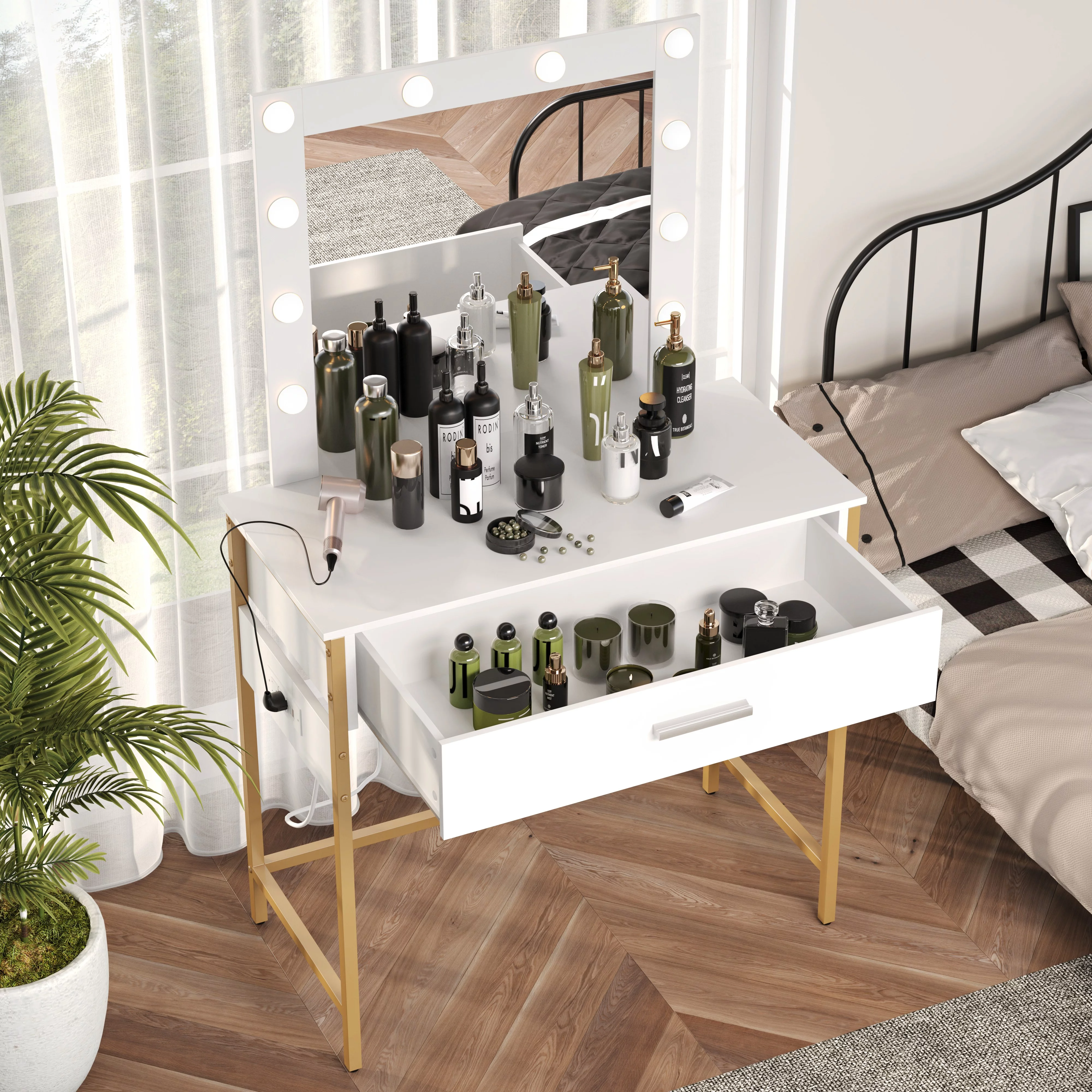 RichYa Makeup Vanity Desk Glass Table Top with Mirror and Lights Power Strip LED Bulbs White