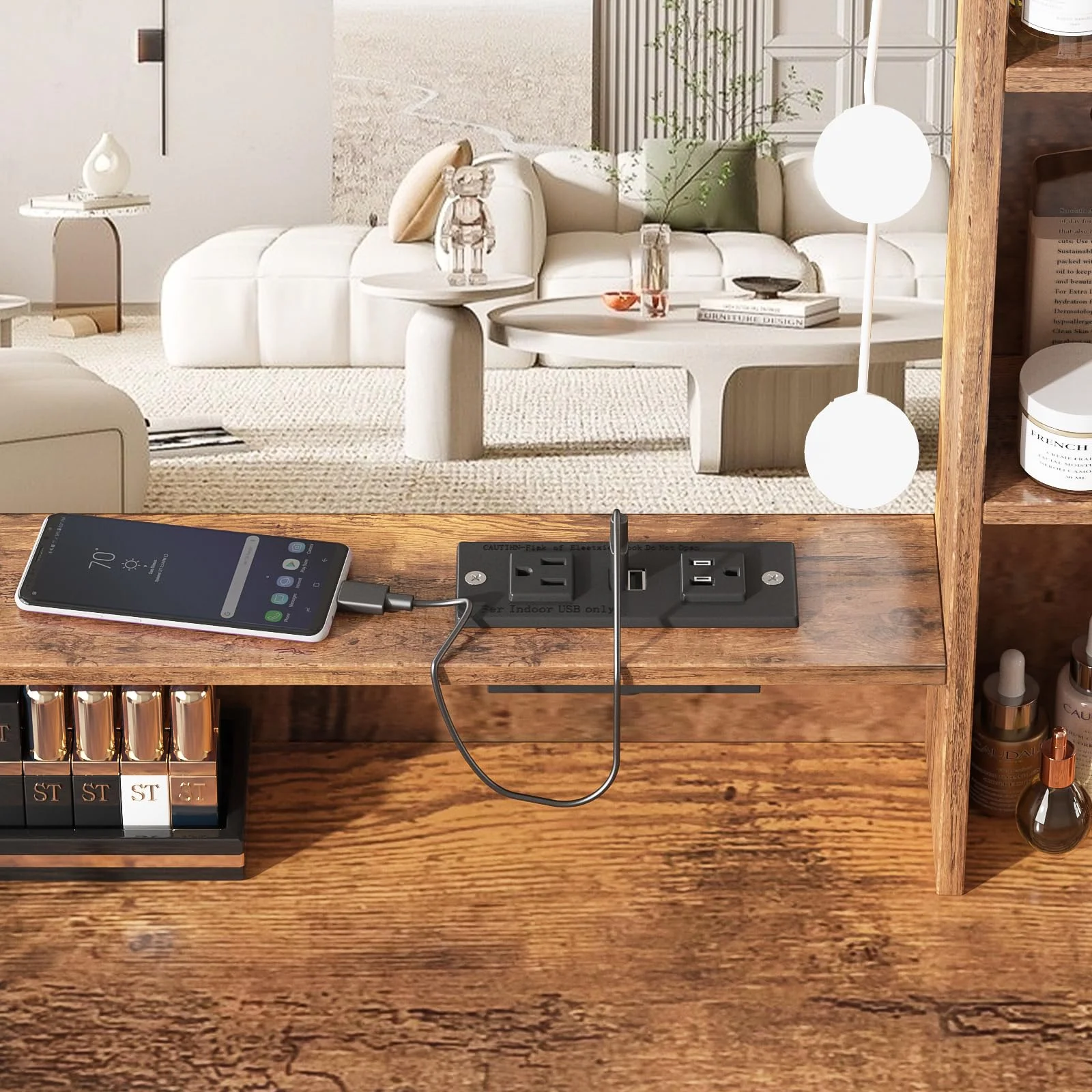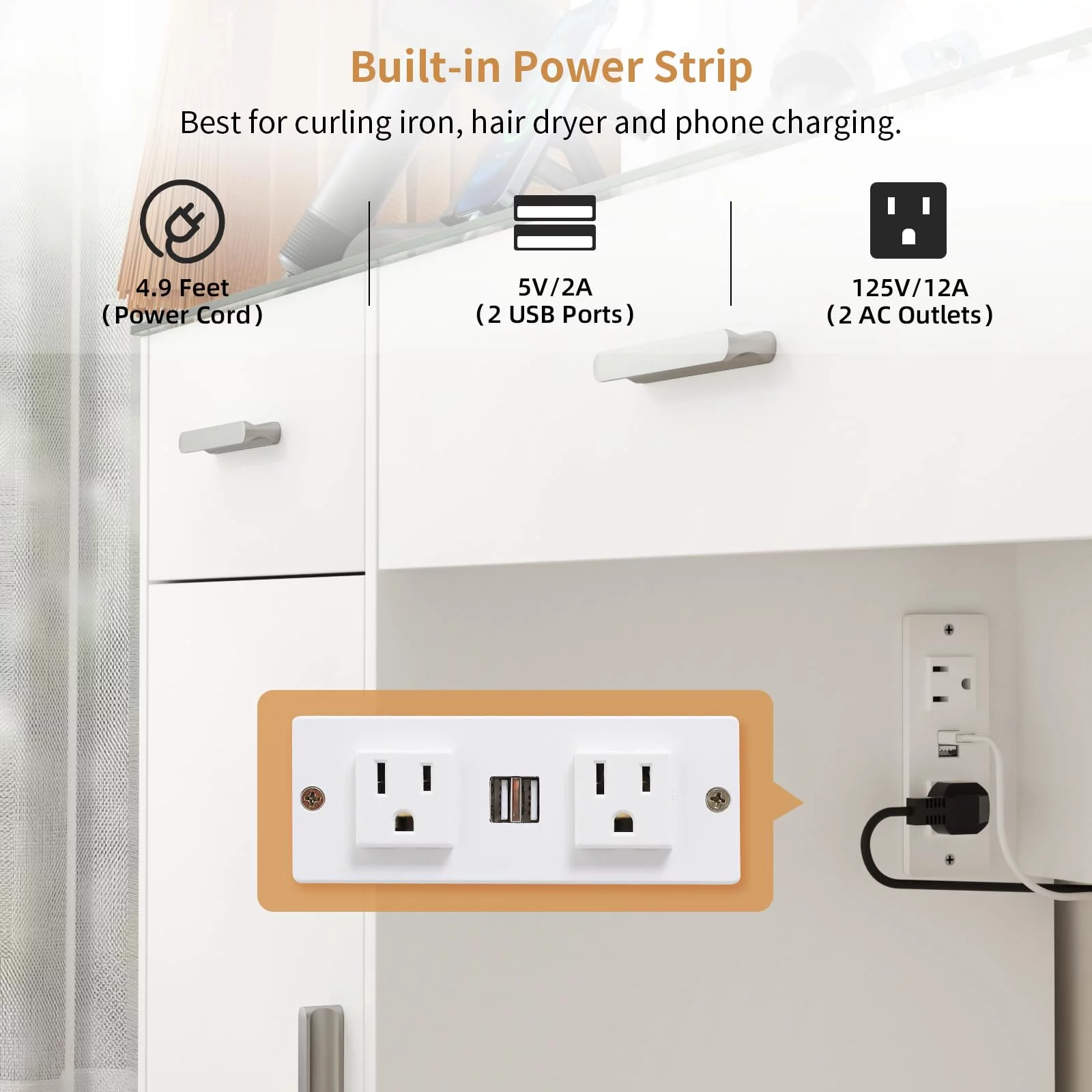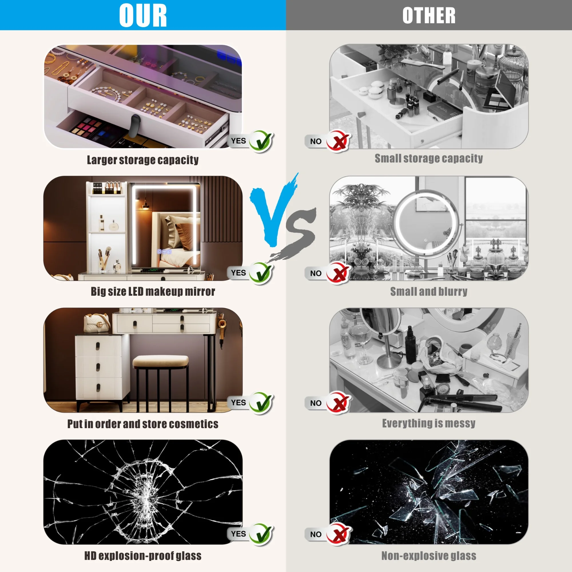 RichYa Makeup Vanity Desk Glass Table Top with Mirror and Lights Power Strip LED Bulbs White