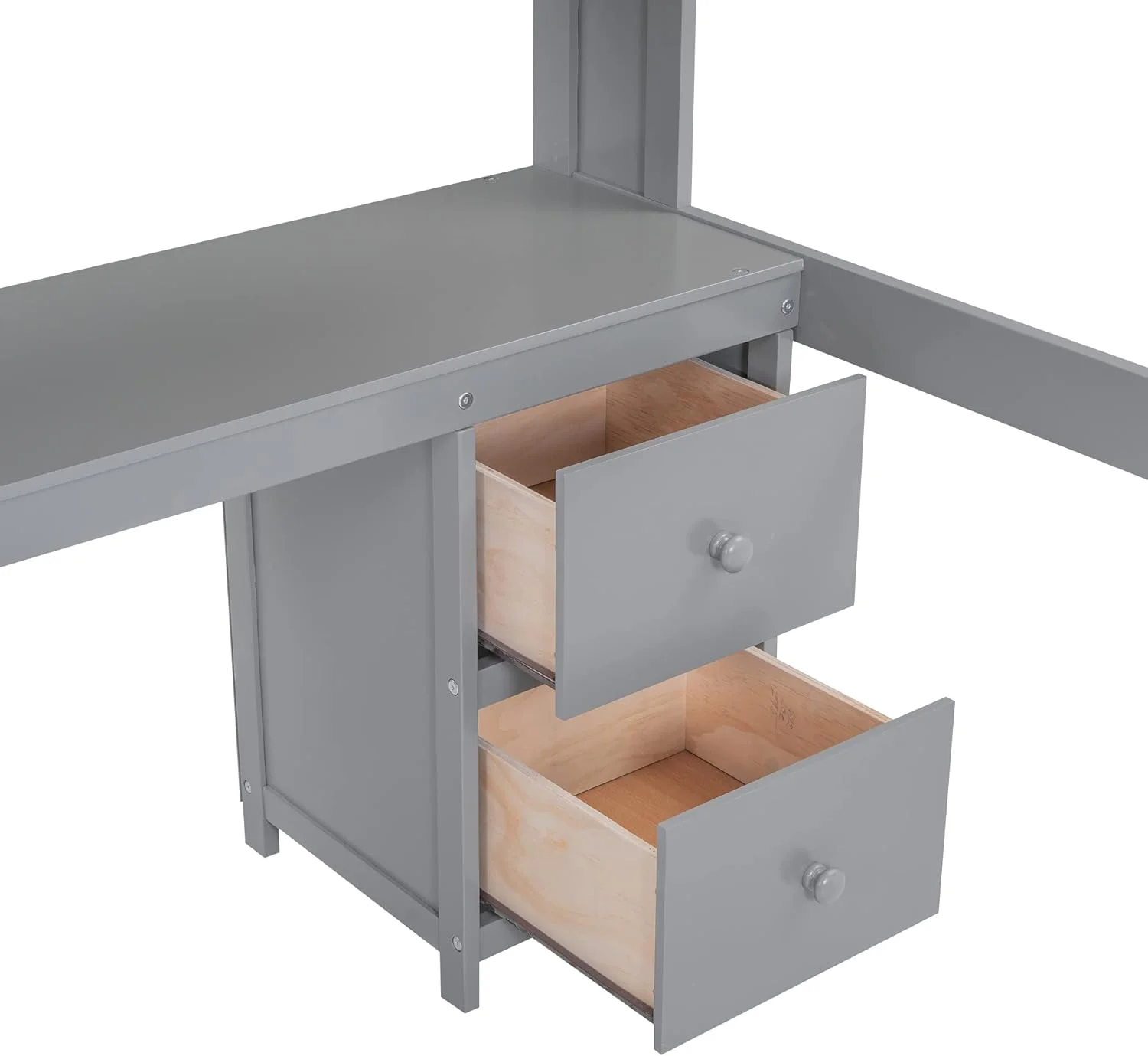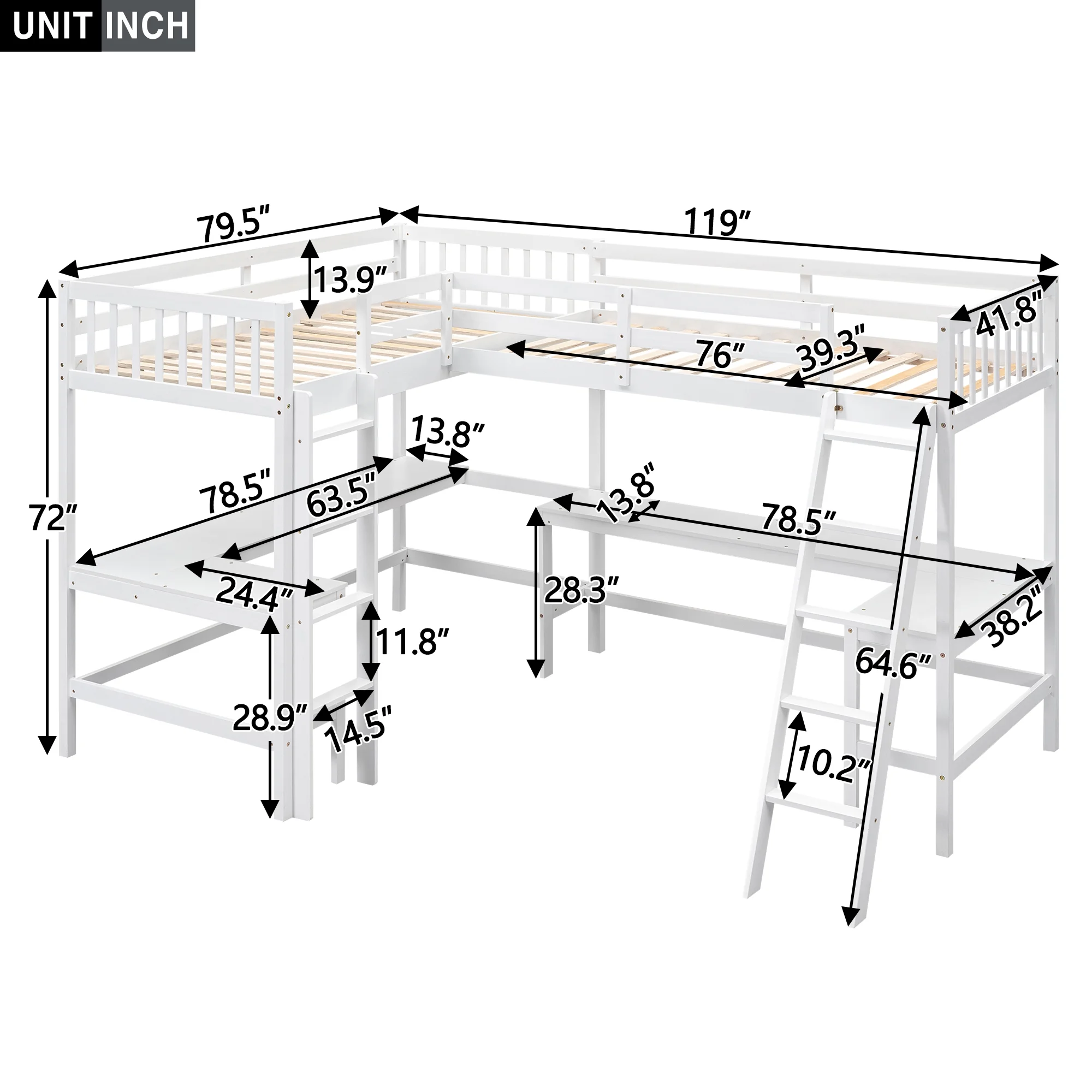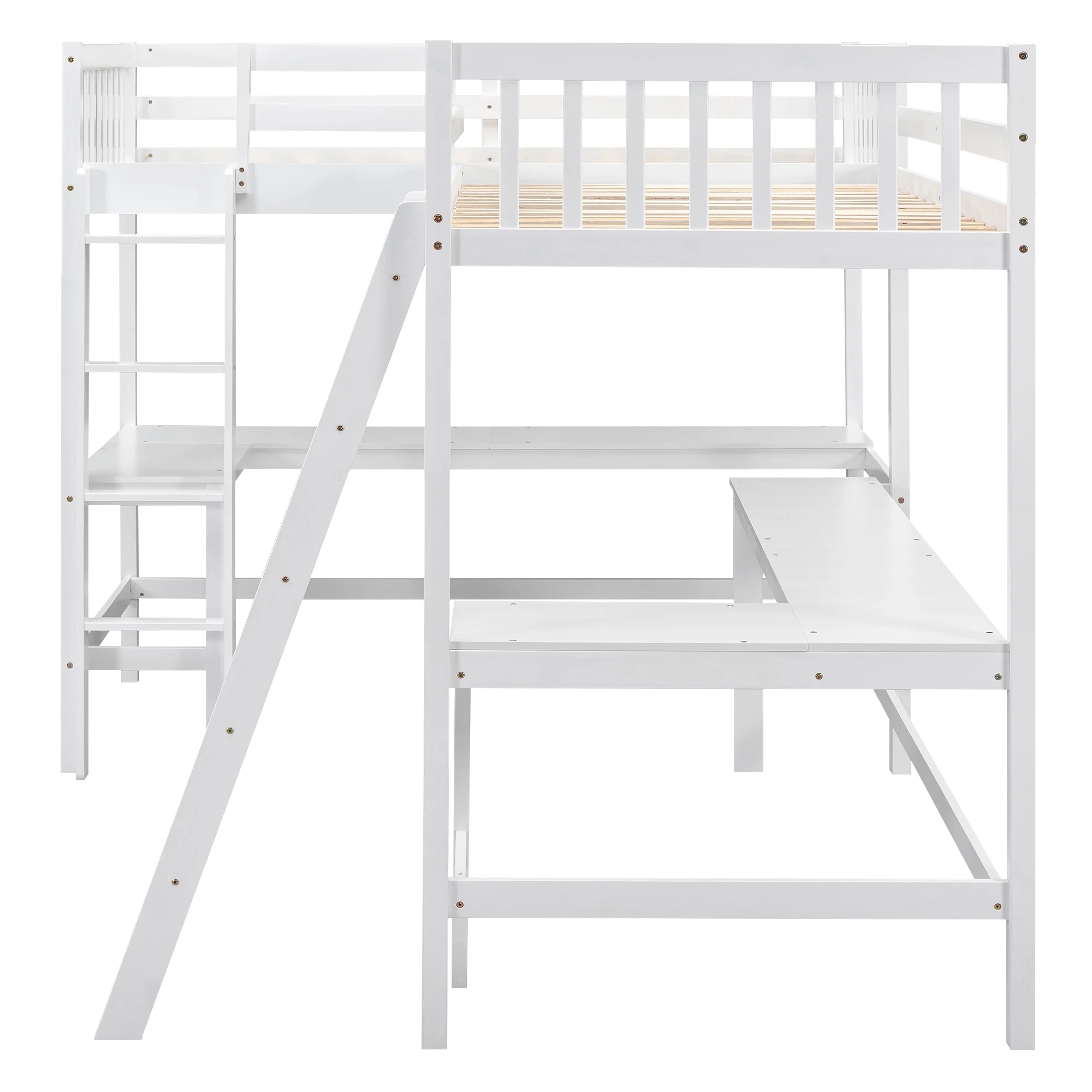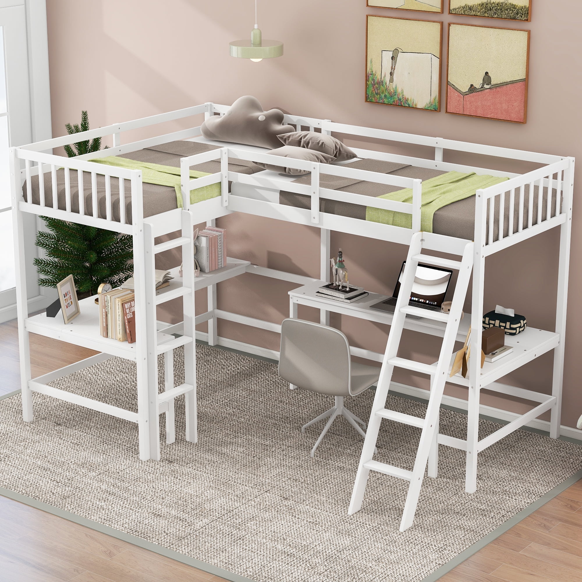 Euroco Twin Size L-Shaped Wood Loft Bed with Built-in Desks, 2-in-1 Loft Bed for Kids Teens Adults, White