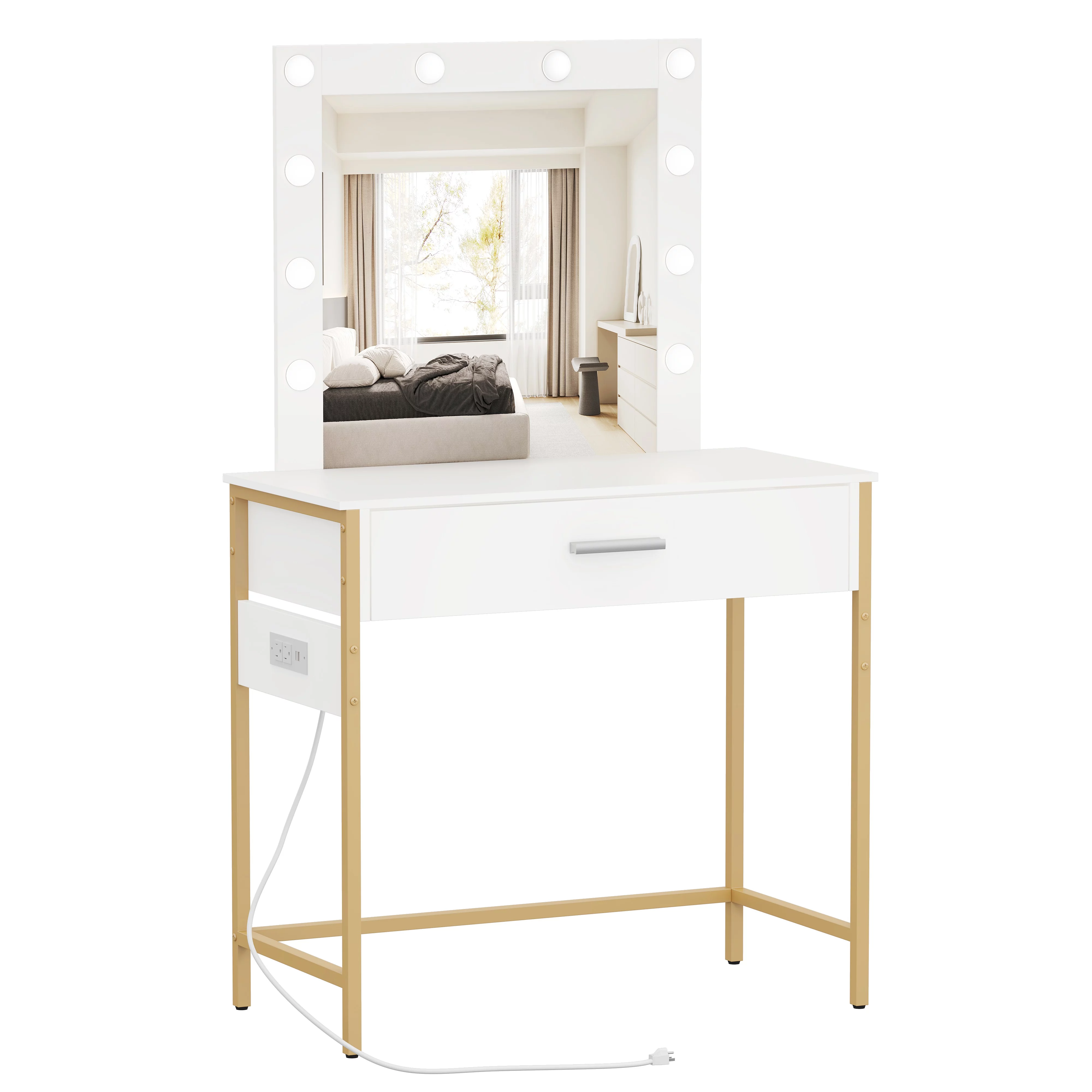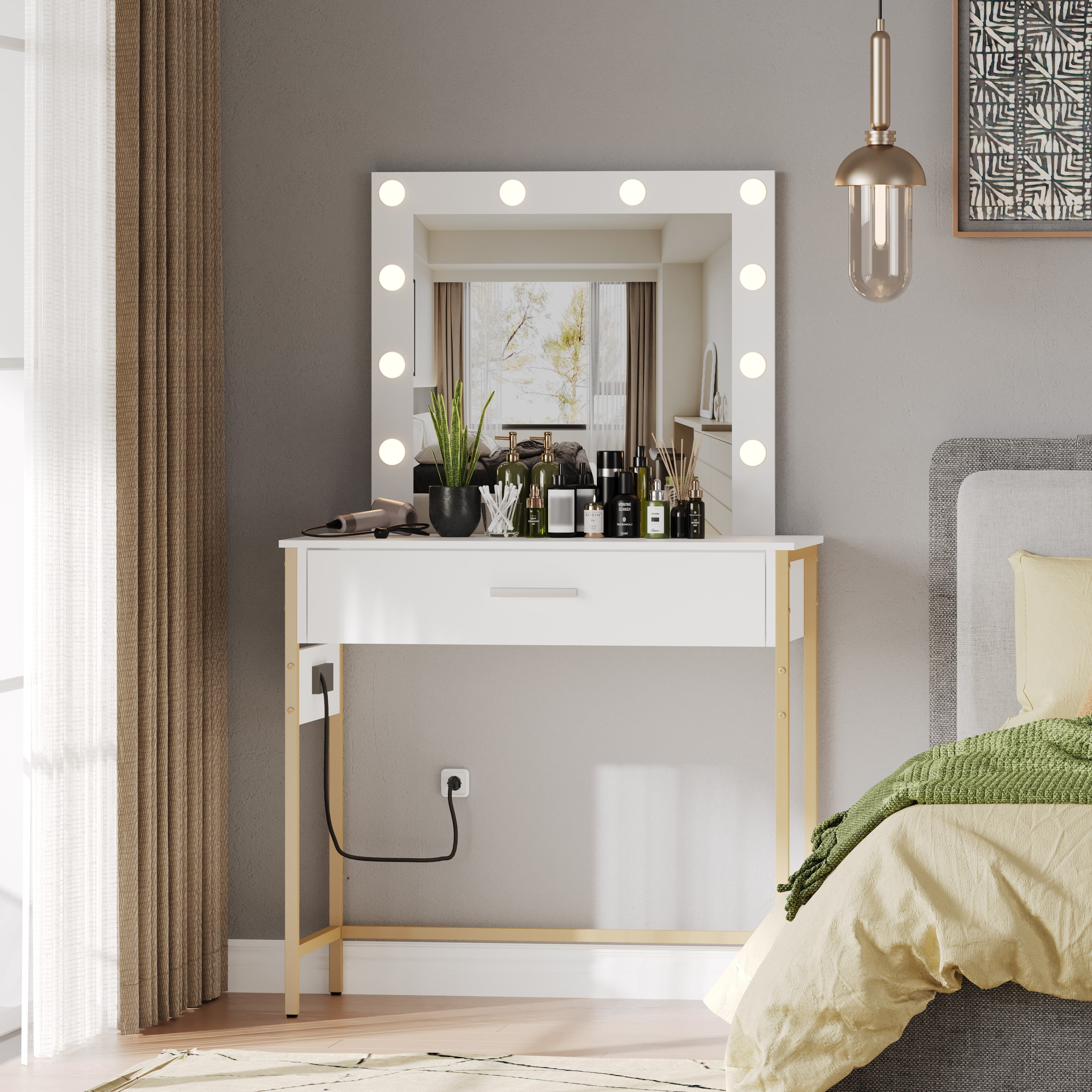 Vanity Table with Lighted Mirror, Makeup Vanity Dressing Table, Bedroom Makeup Desk with Charging Station, White