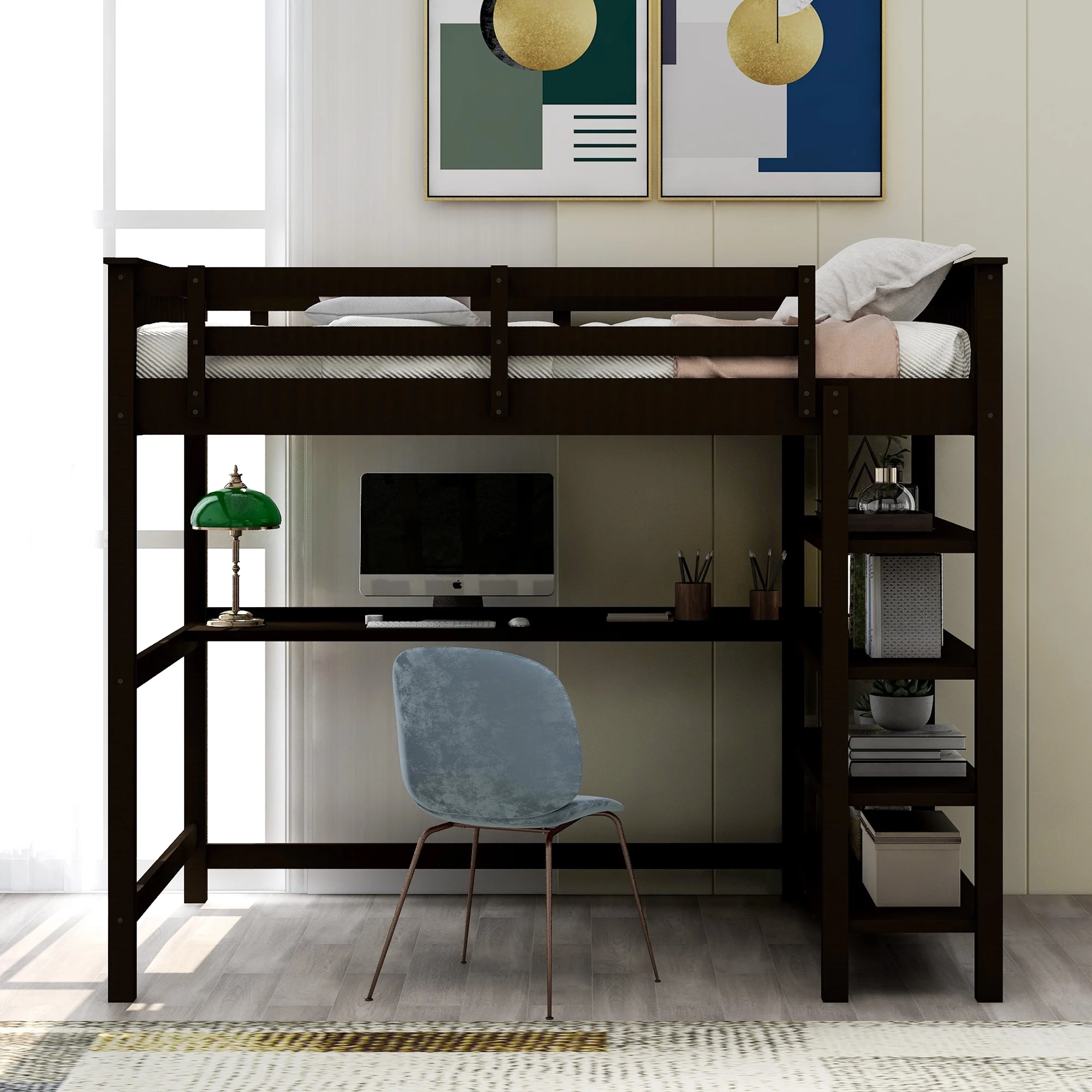 Max & Lily Twin Loft Bed, Modern Solid Wood High Loft Bed with Desk and Storage Shelves for Kids, Clay