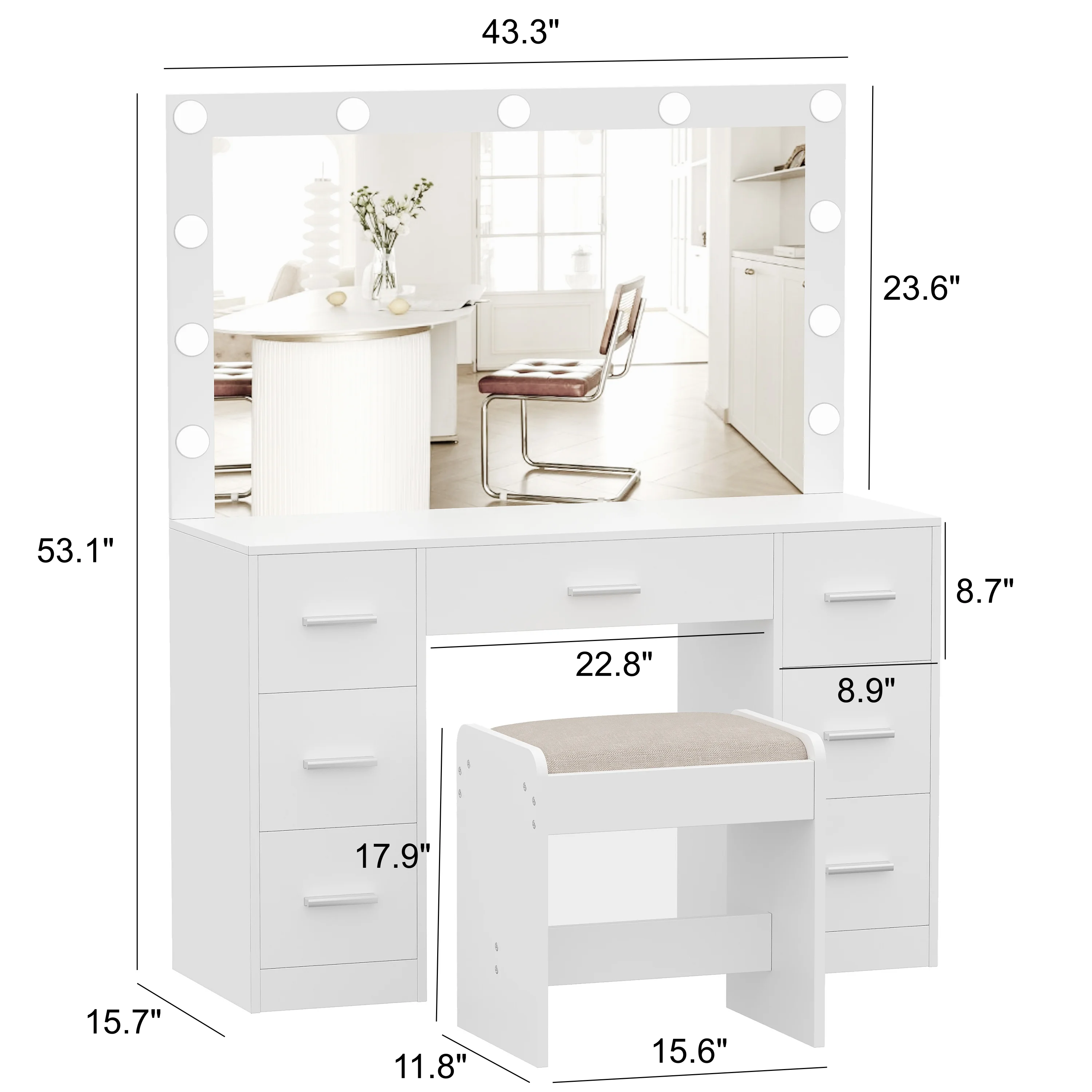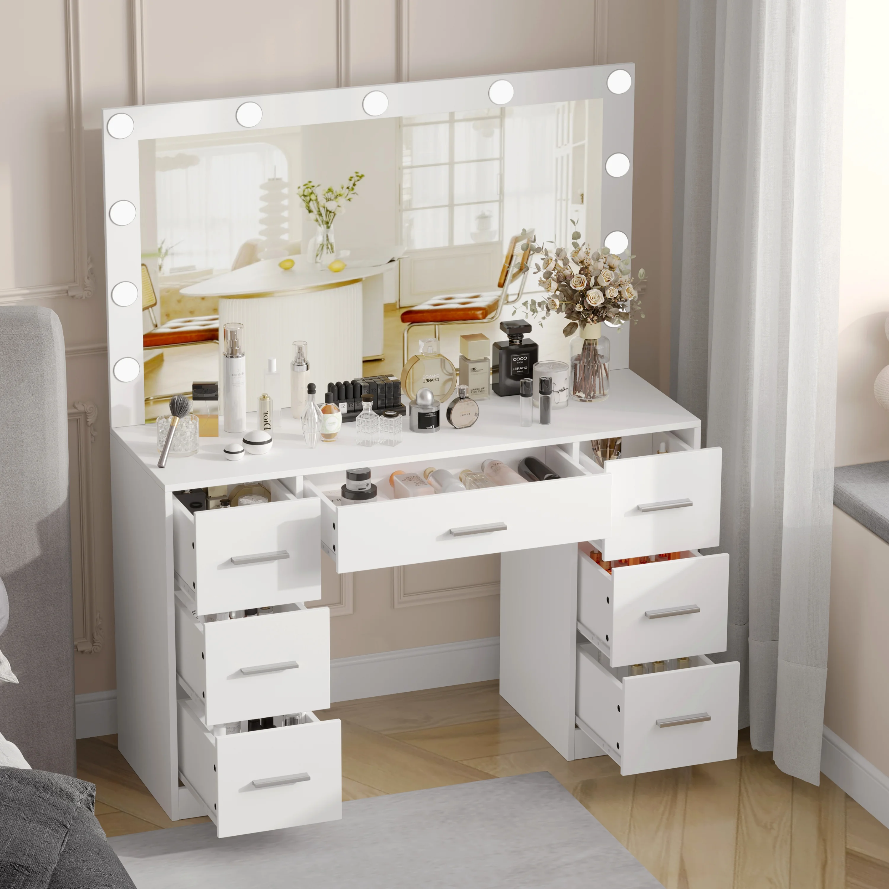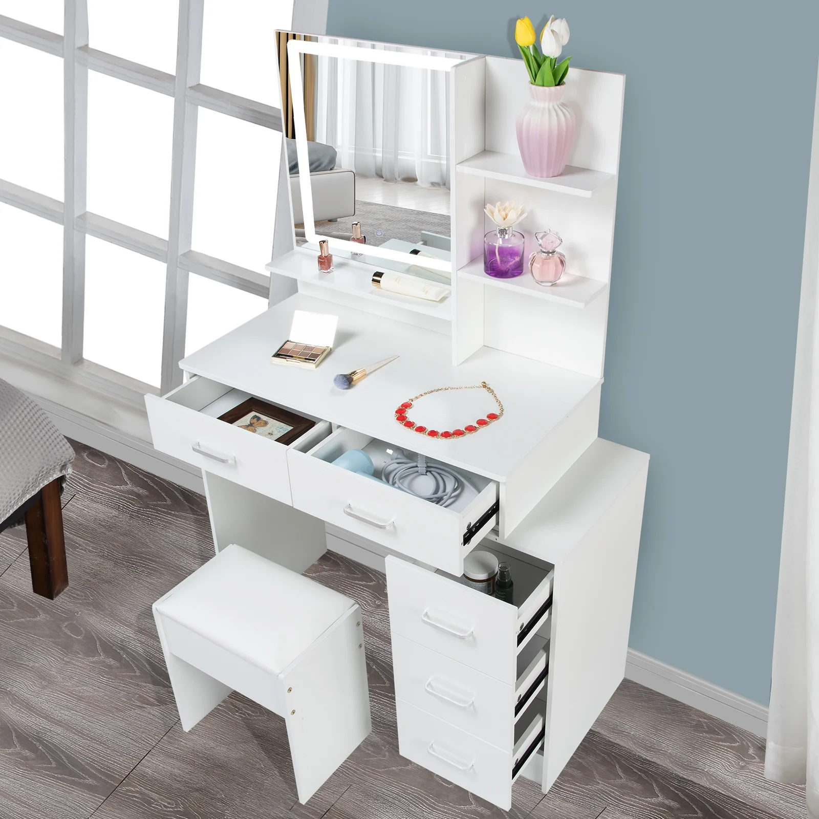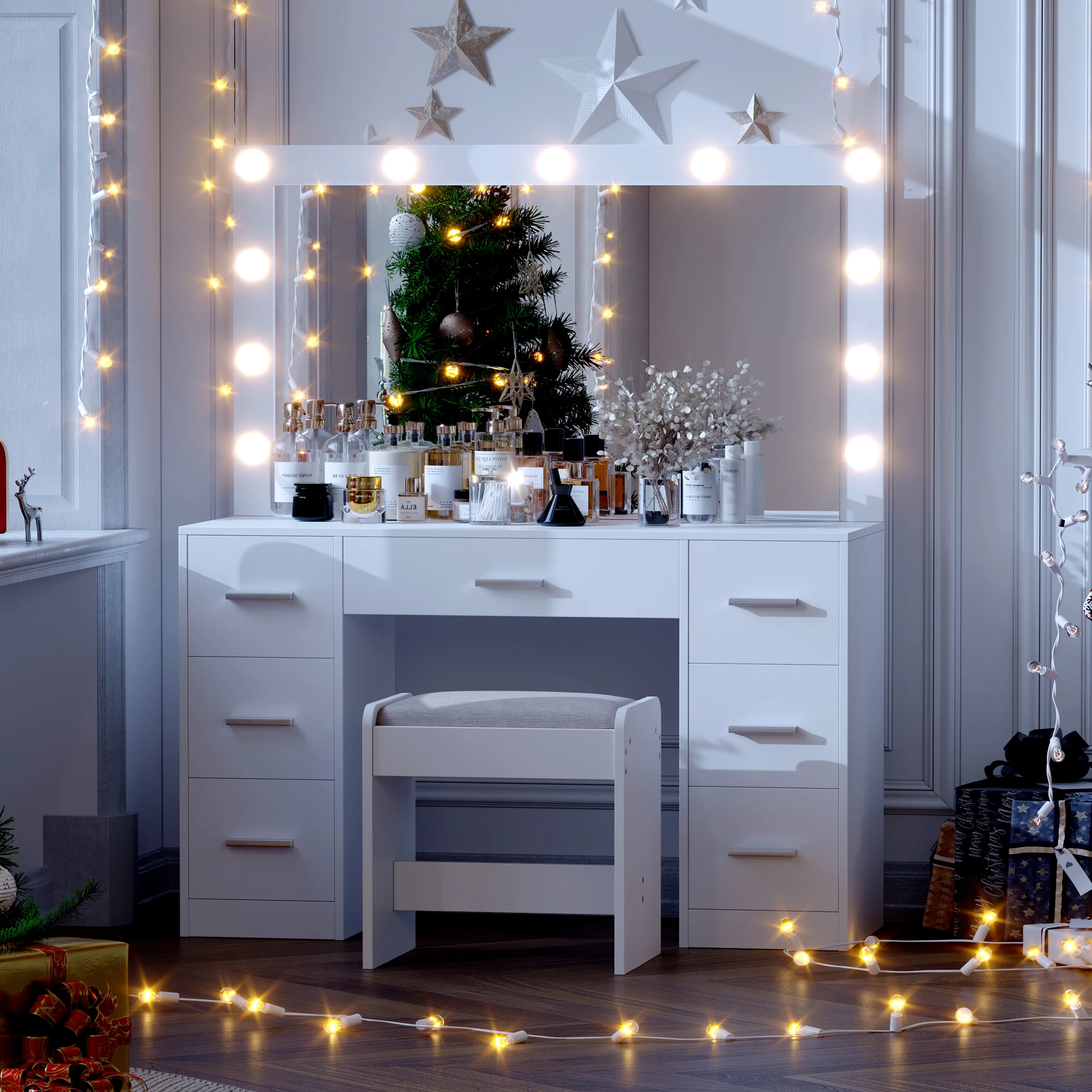 Vanity Desk Set with 3 Color Adjustable Lighted Large Mirror & Cushioned Stool, Bedroom Dressing Table with 7 Drawers