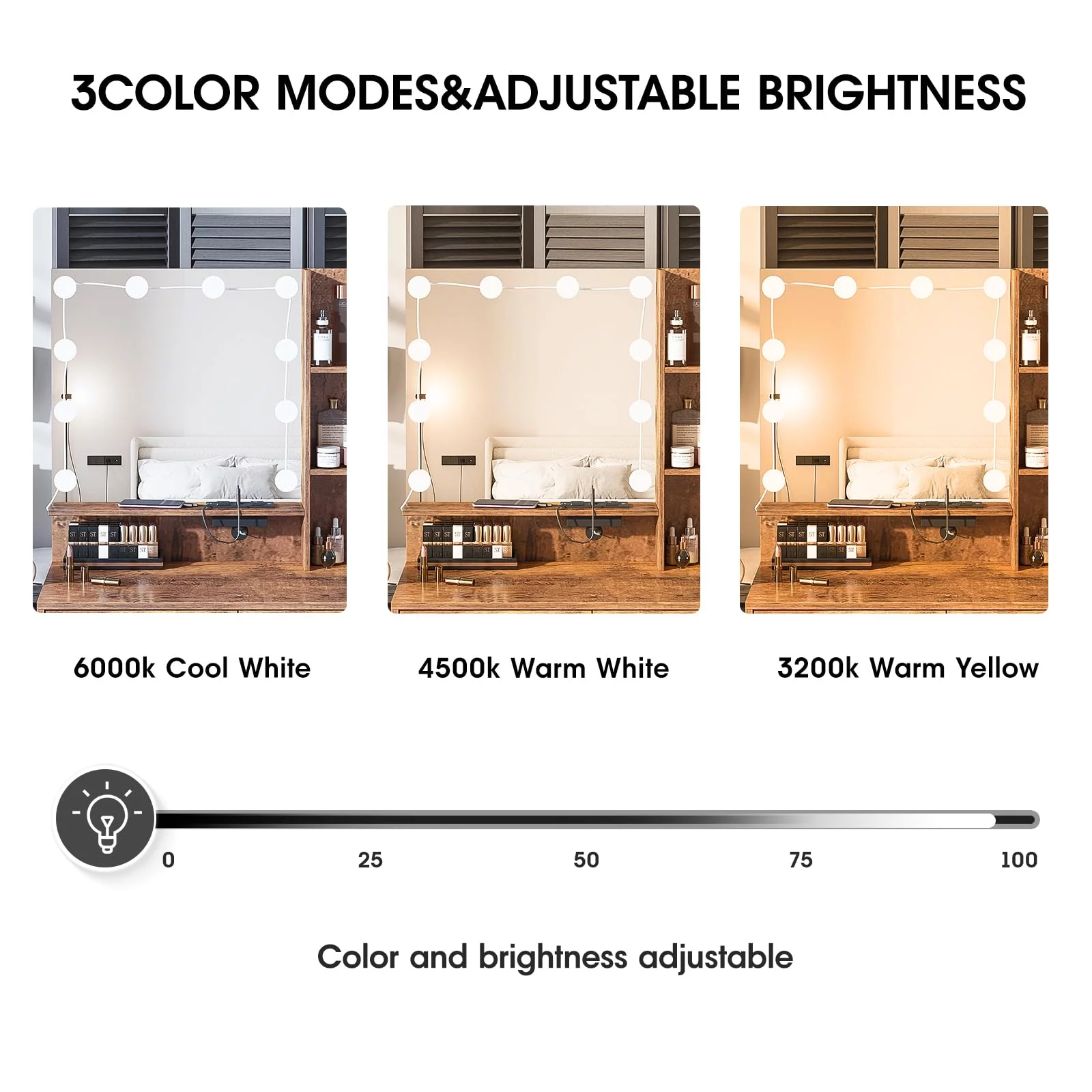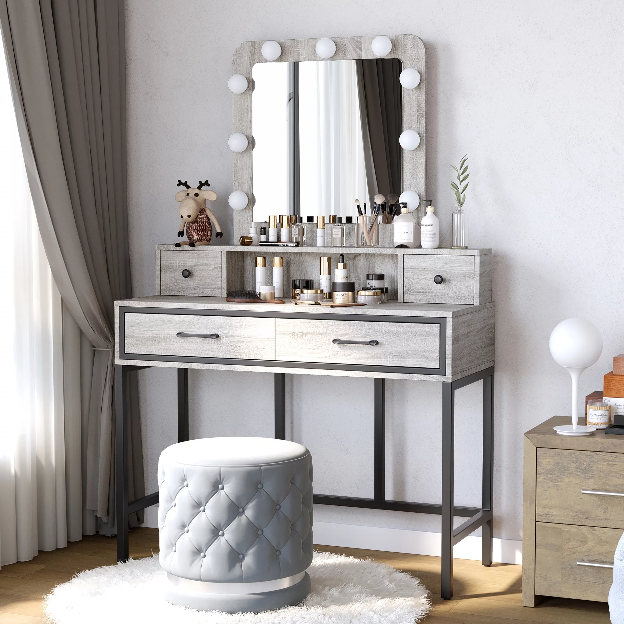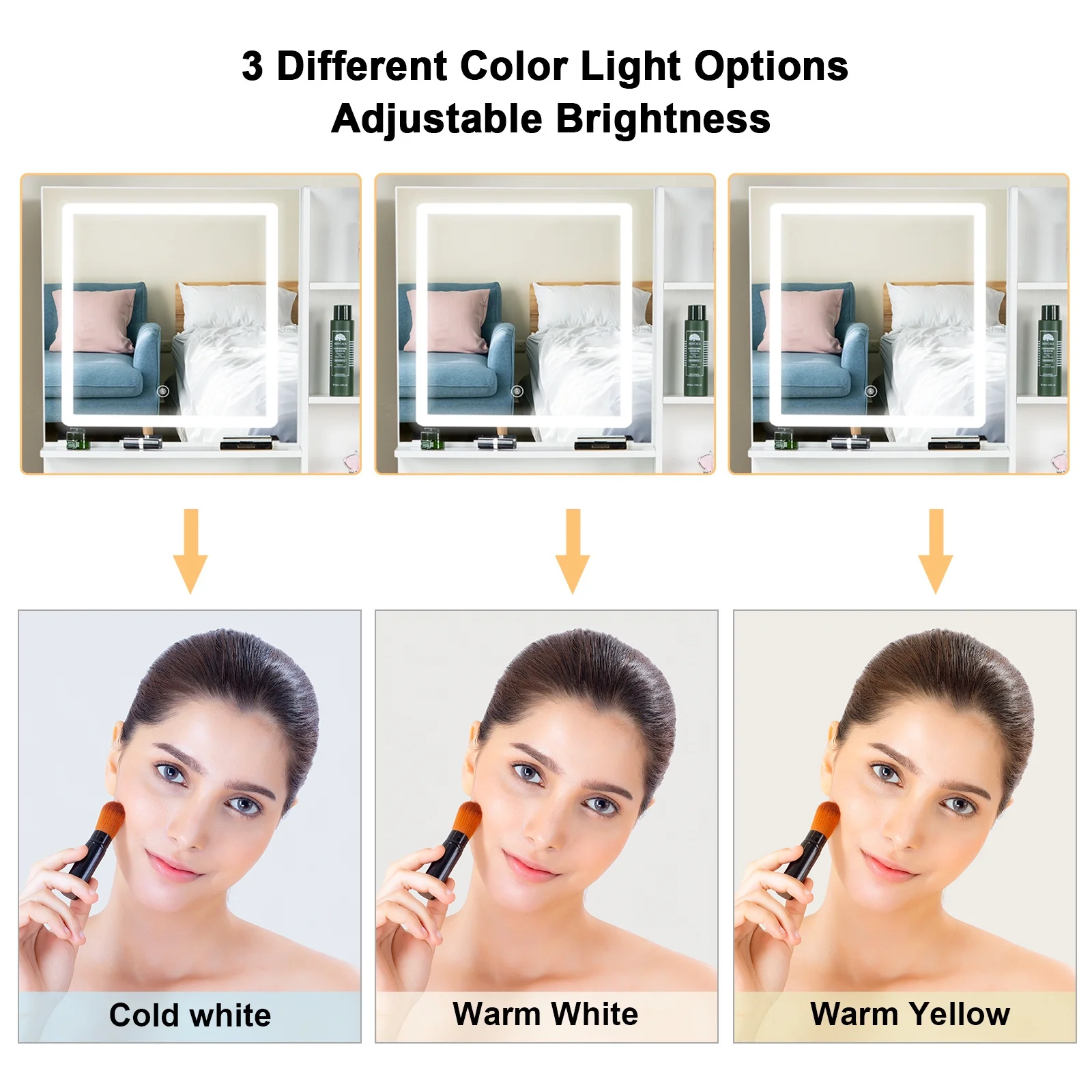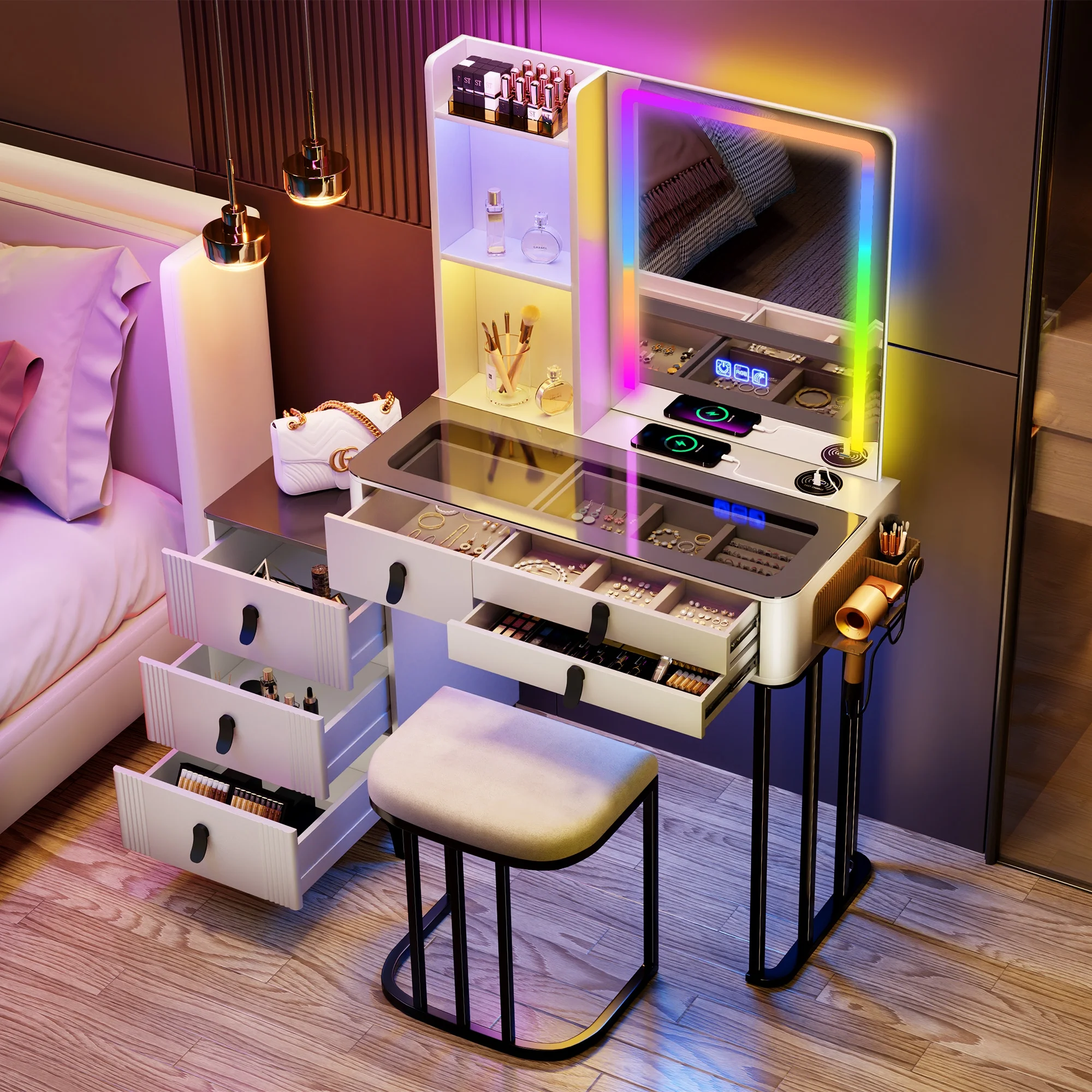 Vanity Desk Set with 3 Color Adjustable Lighted Large Mirror & Cushioned Stool, Bedroom Dressing Table with 7 Drawers