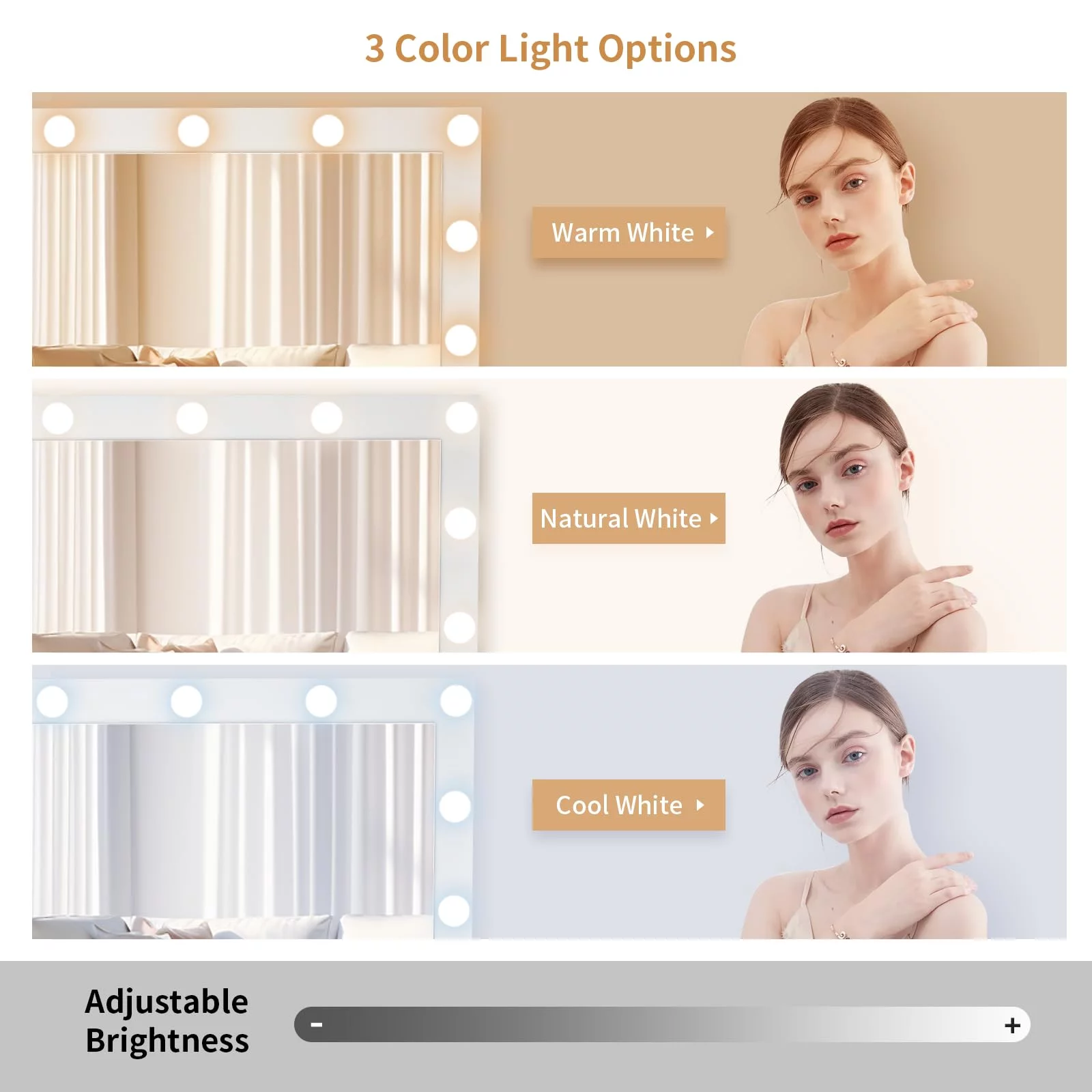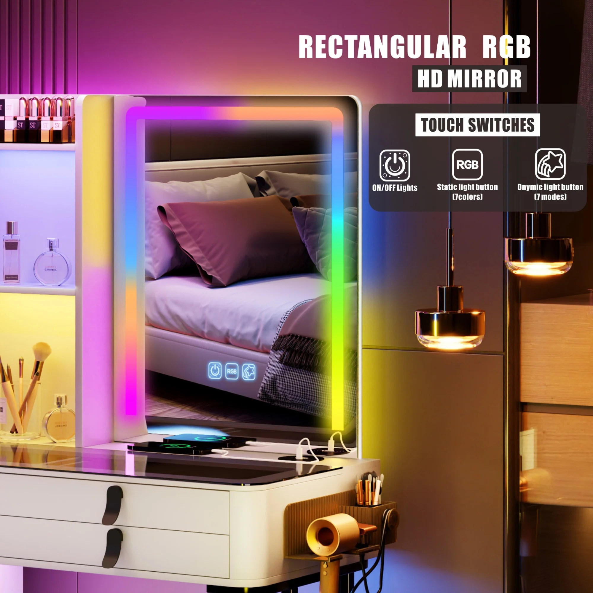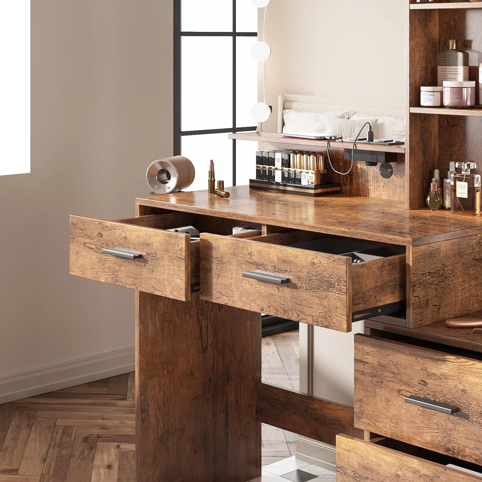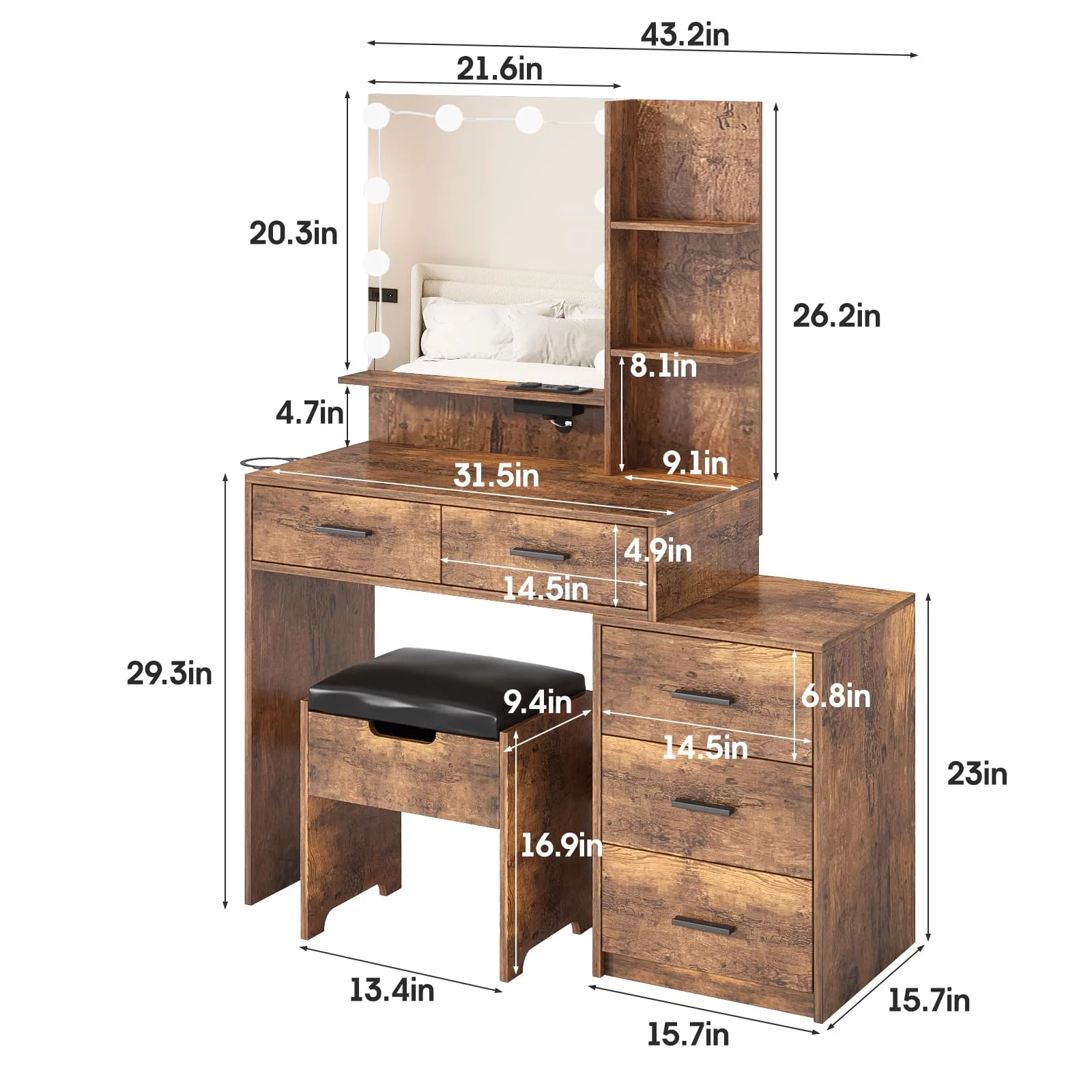 Vanity Desk Set with 3 Color Adjustable Lighted Large Mirror & Cushioned Stool, Bedroom Dressing Table with 7 Drawers