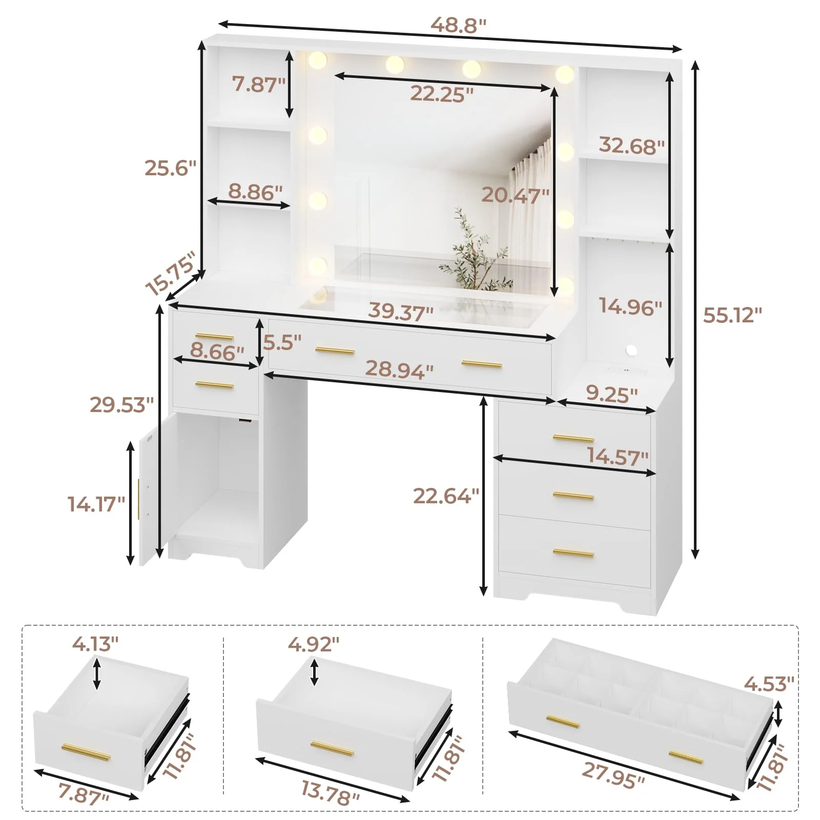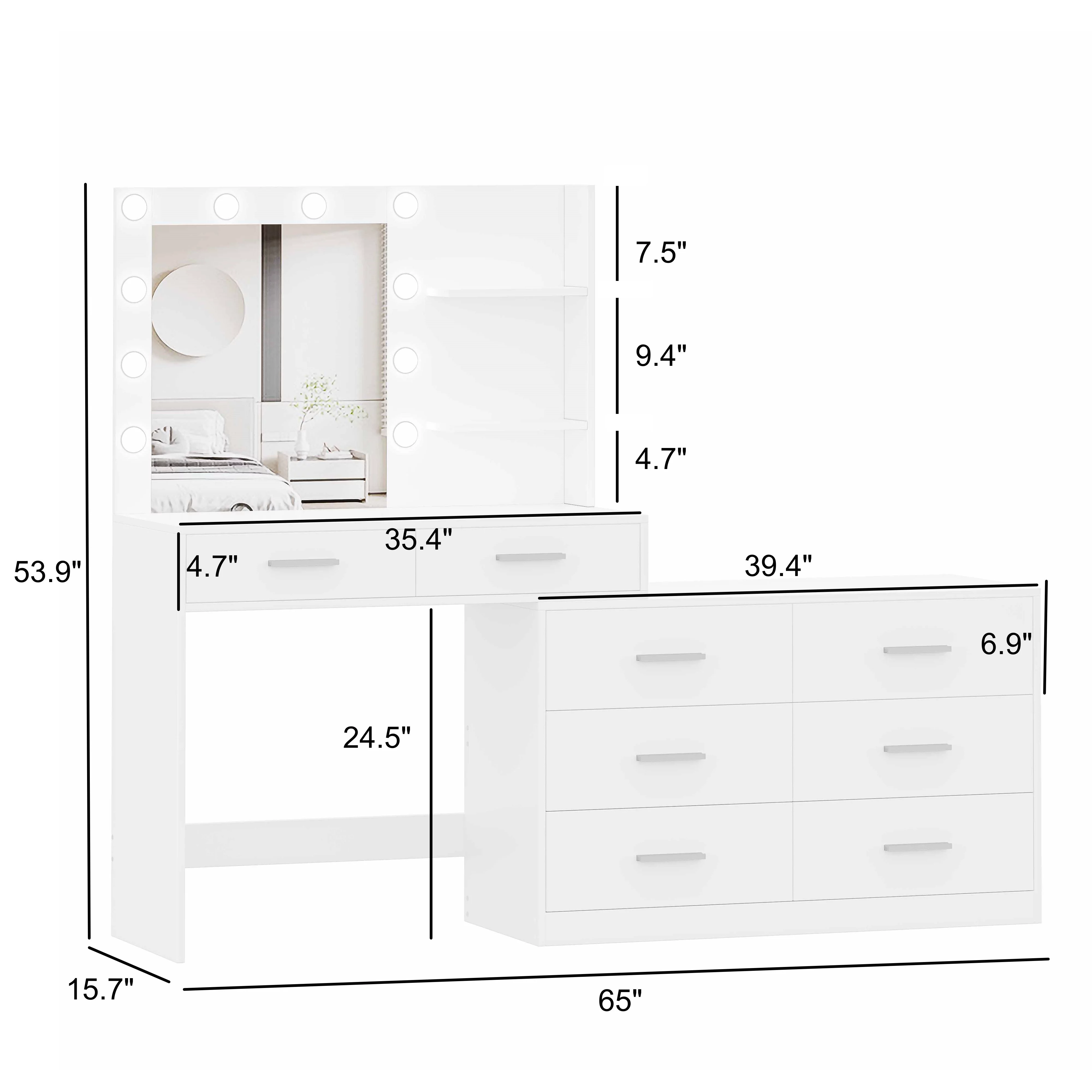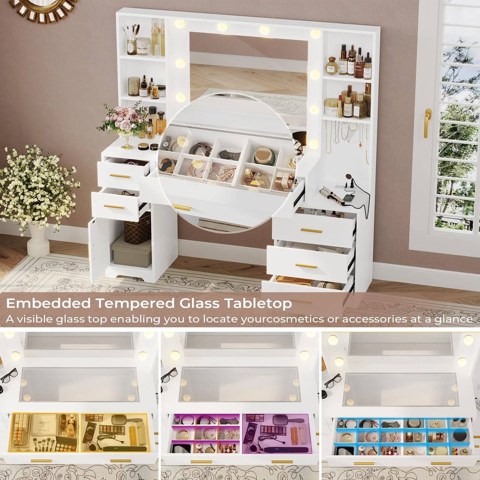 Weiplehoom 48.8'' Vanity Desk with Lighted Mirror, Power Outlet, 6 Drawers, 4 Shelves, Glass Tabletop, White