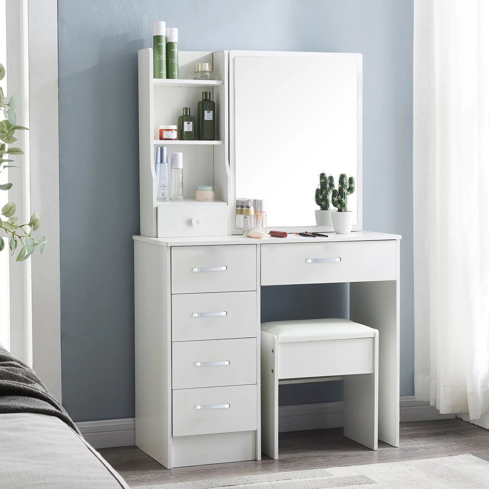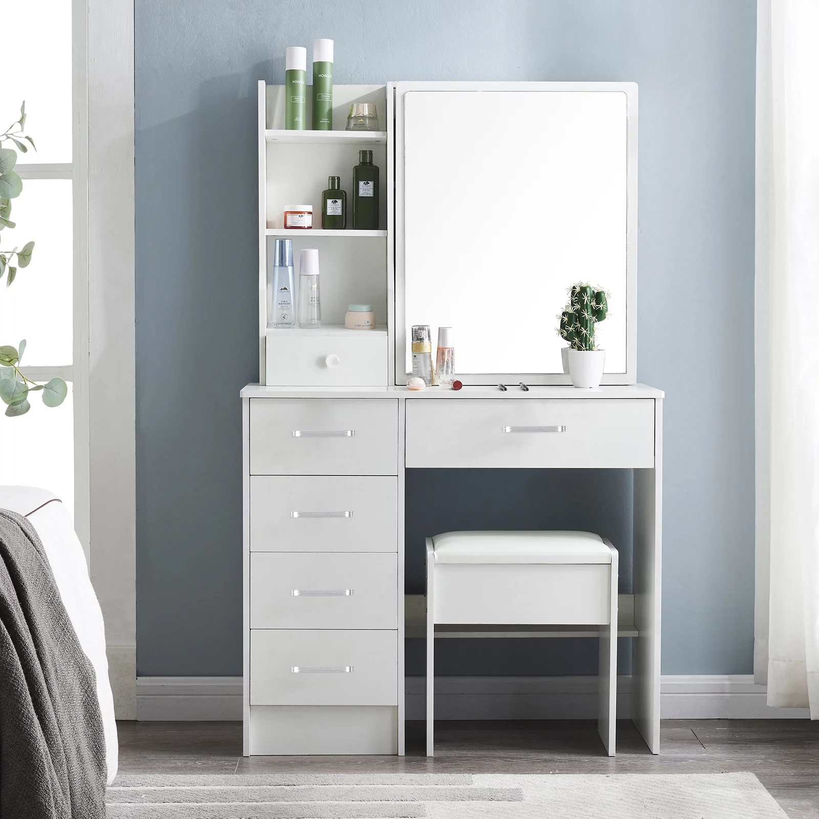 Zimtown Tri Folding White Vanity Makeup Dressing Table Set w/Stool 5 Drawer & Mirror Wood Desk,White