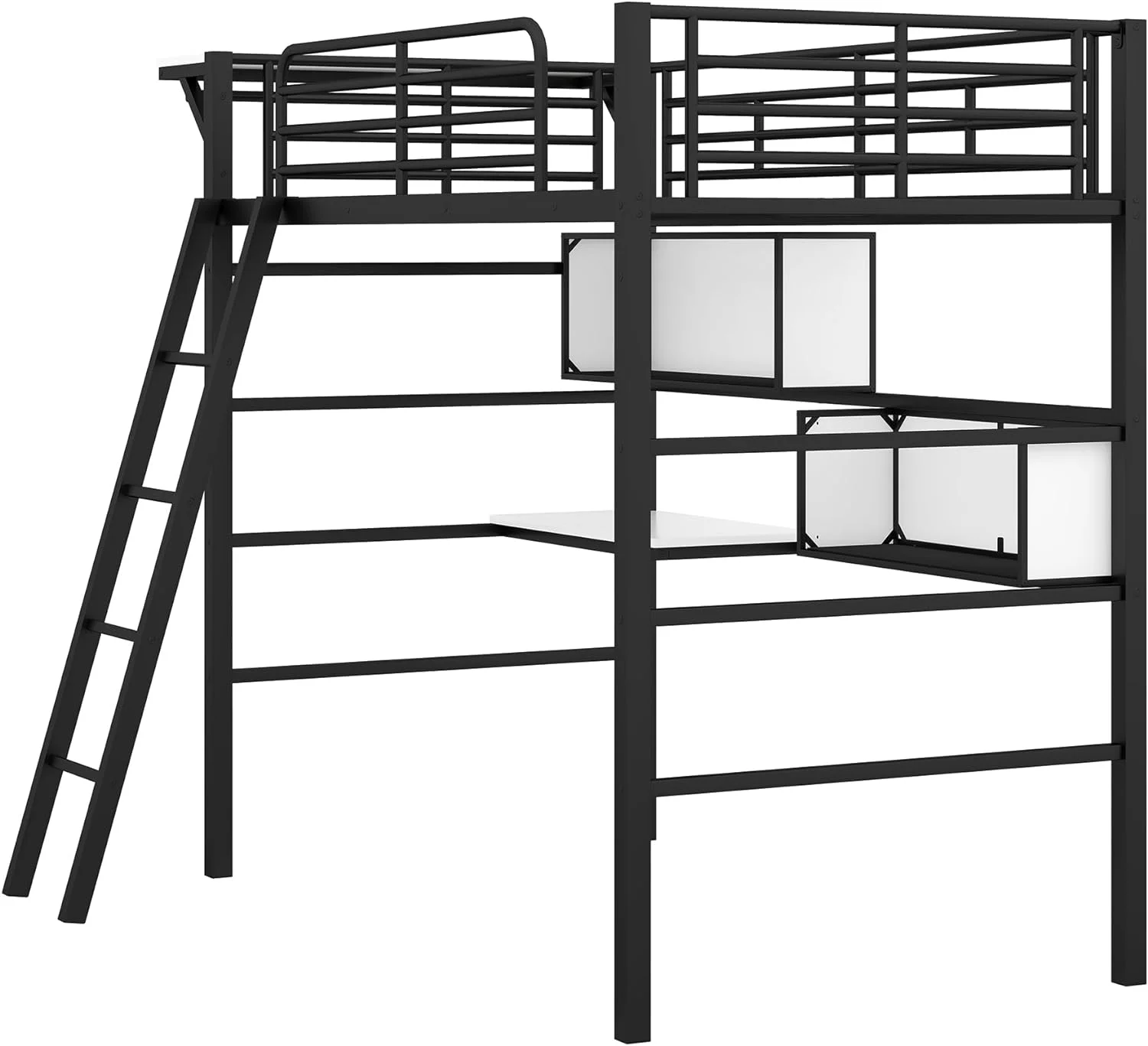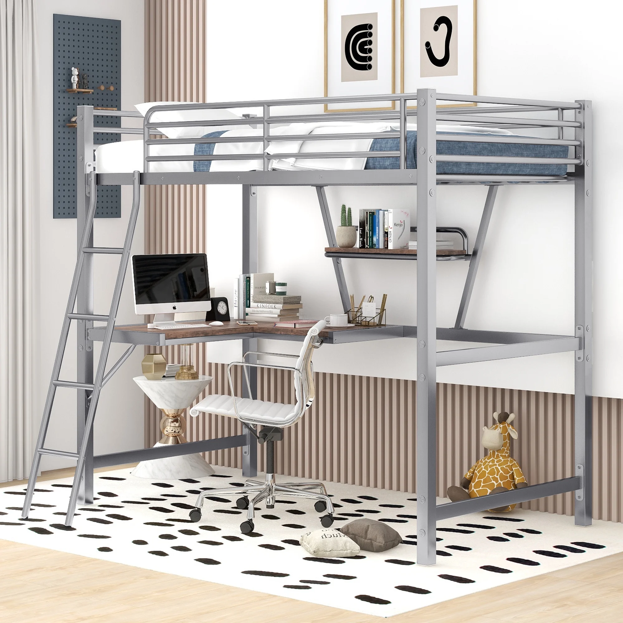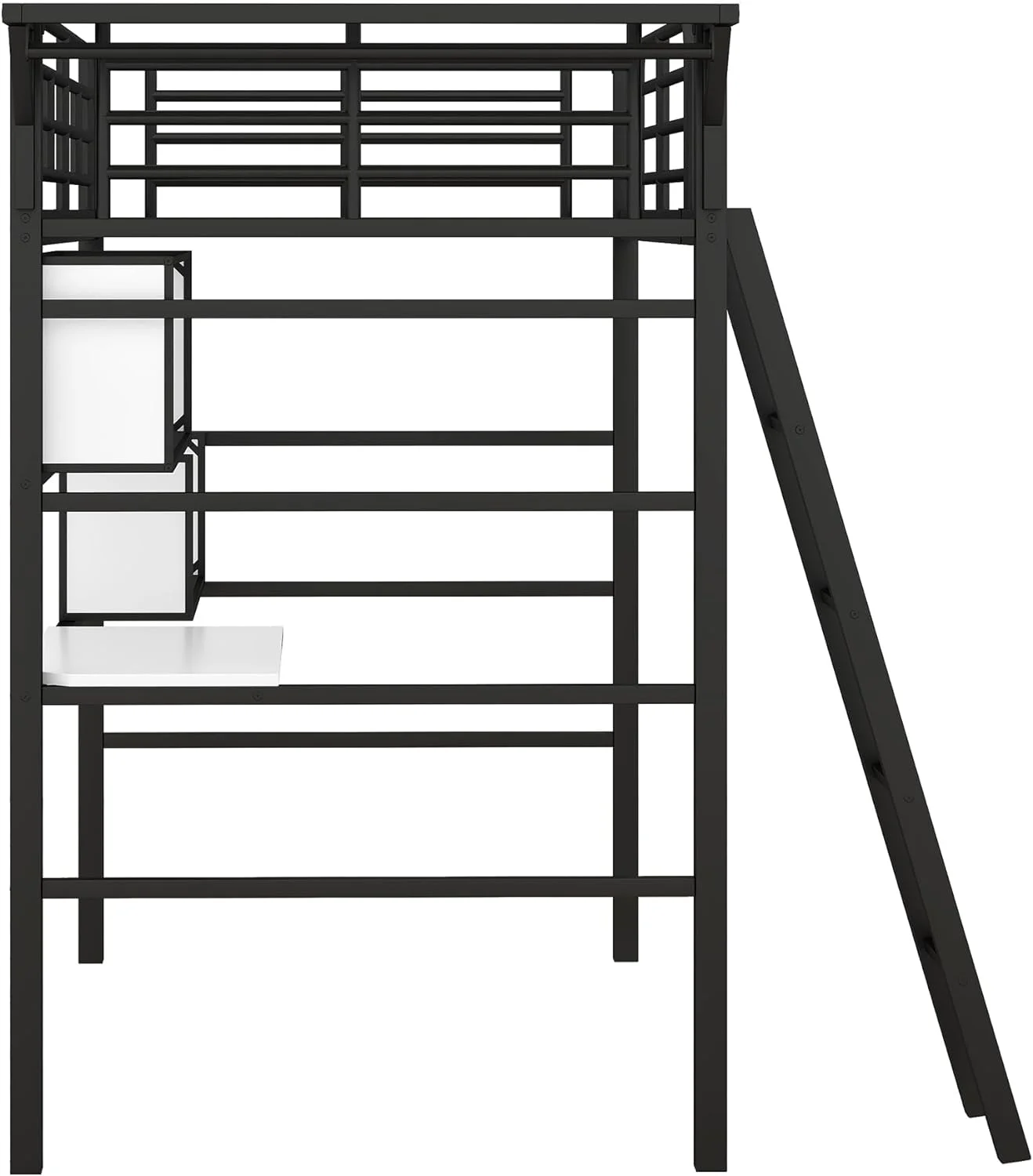 Emma + Oliver Twin Size Loft Bed Frame with Desk, Protective Guard Rails and Ladder in Gray Steel for Kids and Teens
