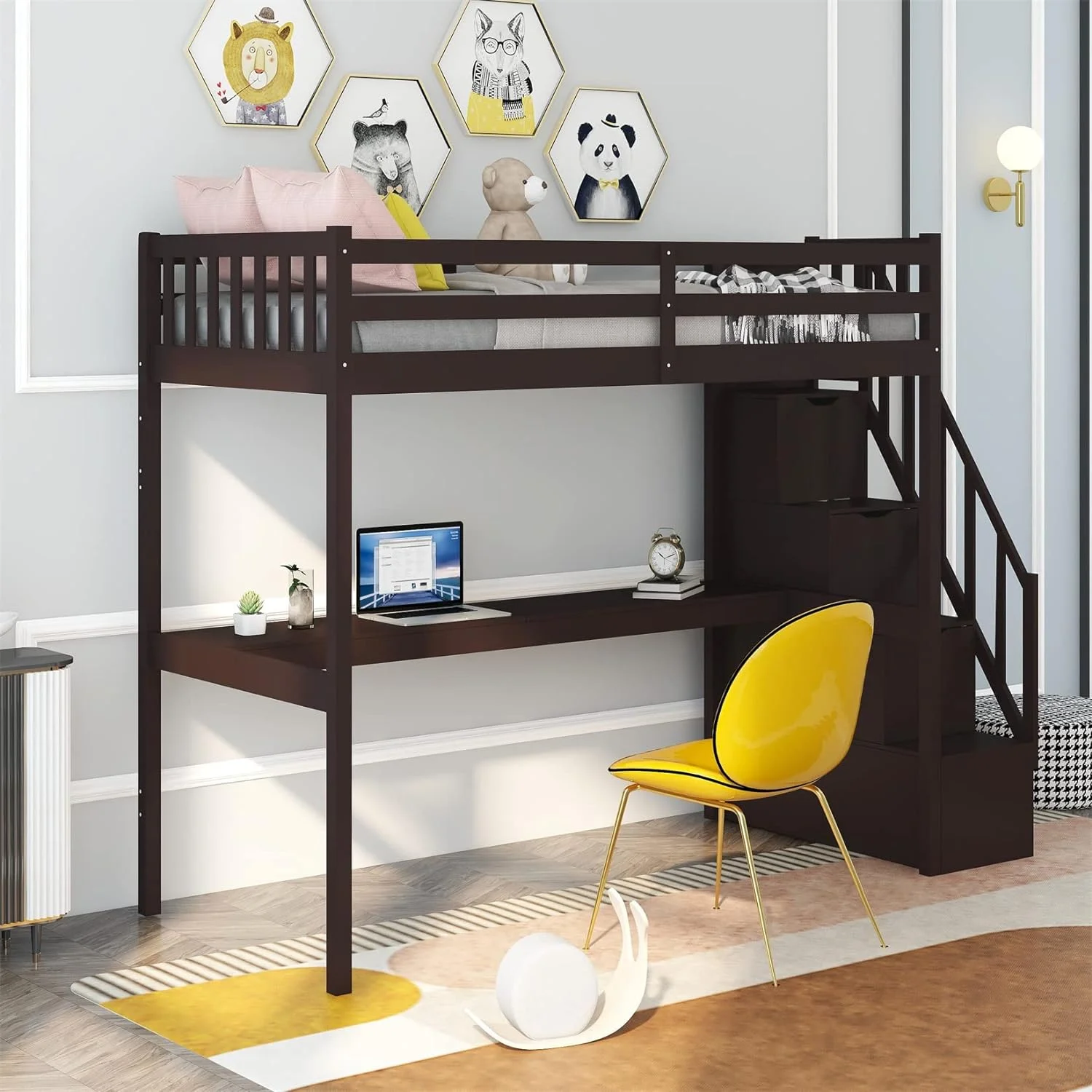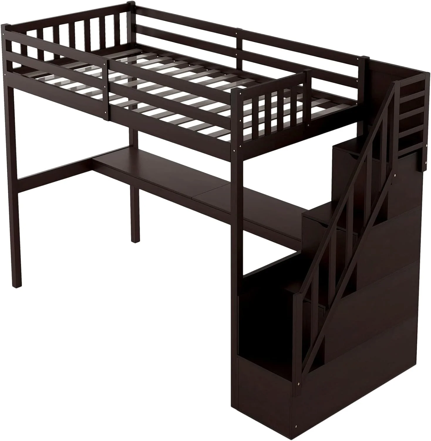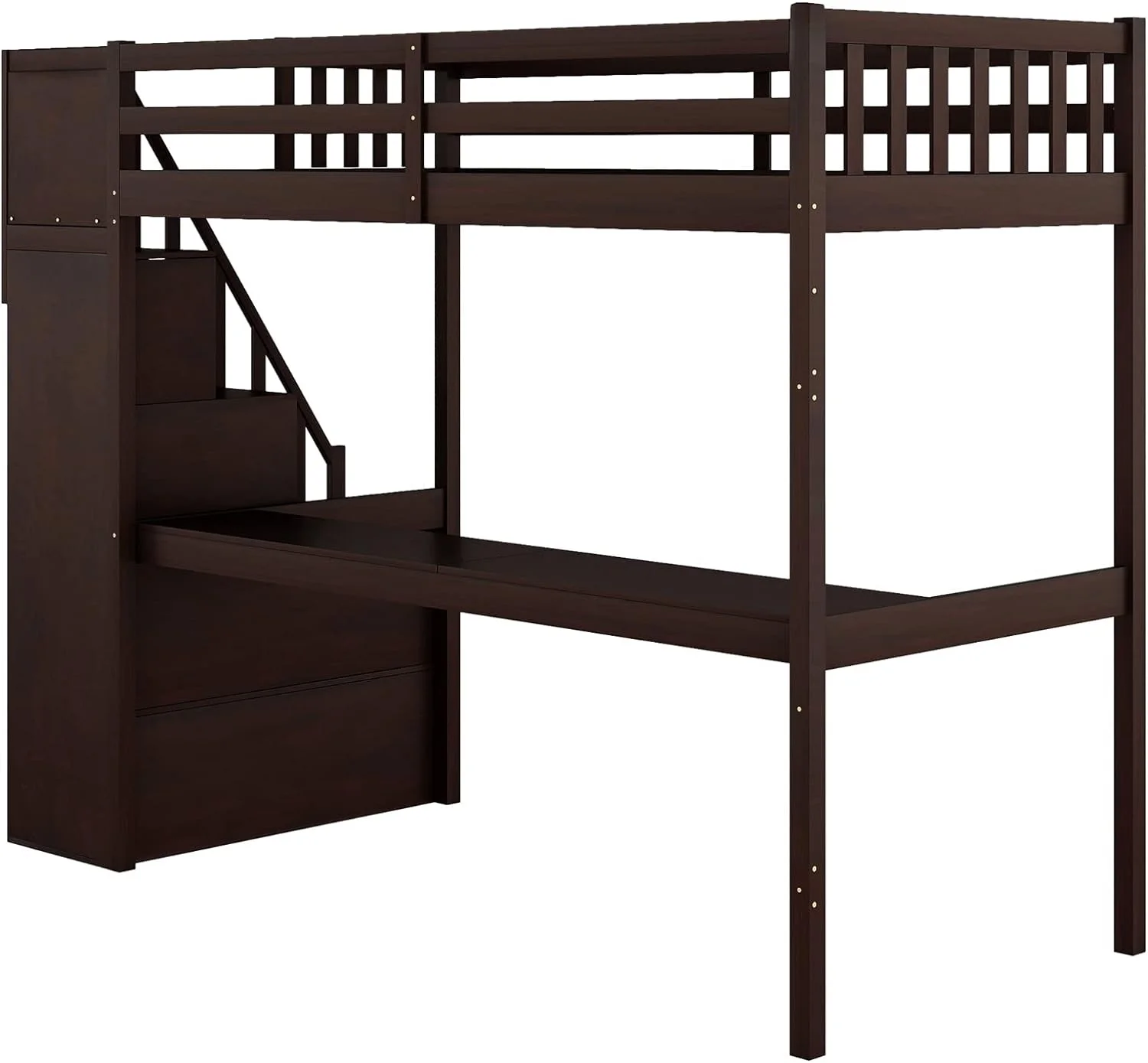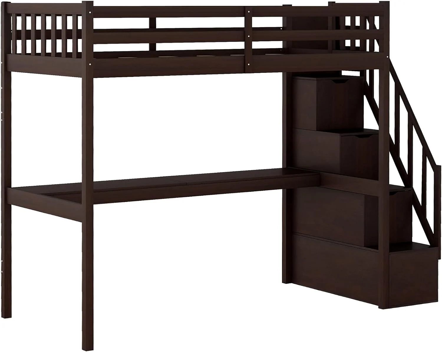 Loft Bed With Desk And Storage Wood Loft Bed Frame With Staircase Storage Loft Bed For Kids Boys Girls Teens, Espresso