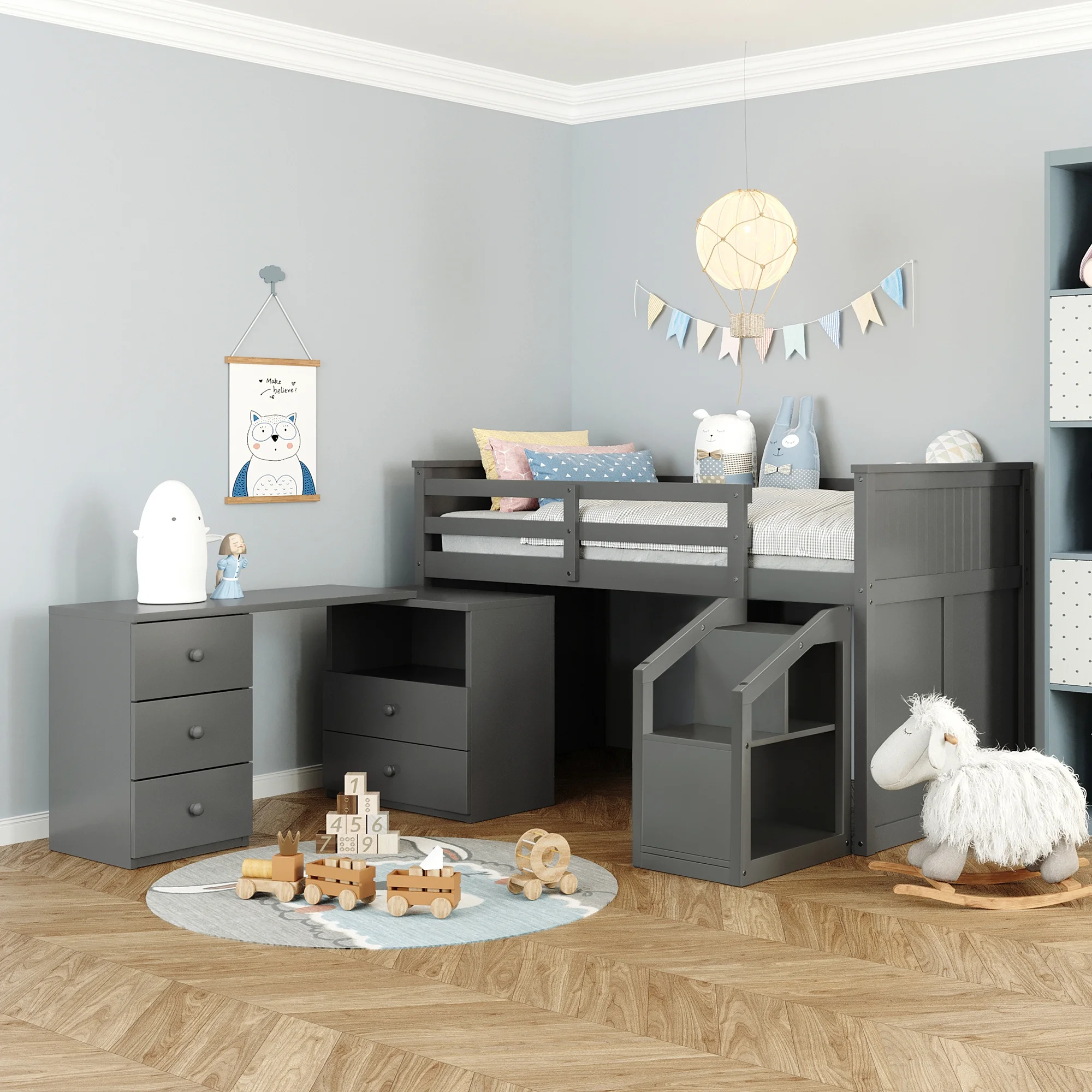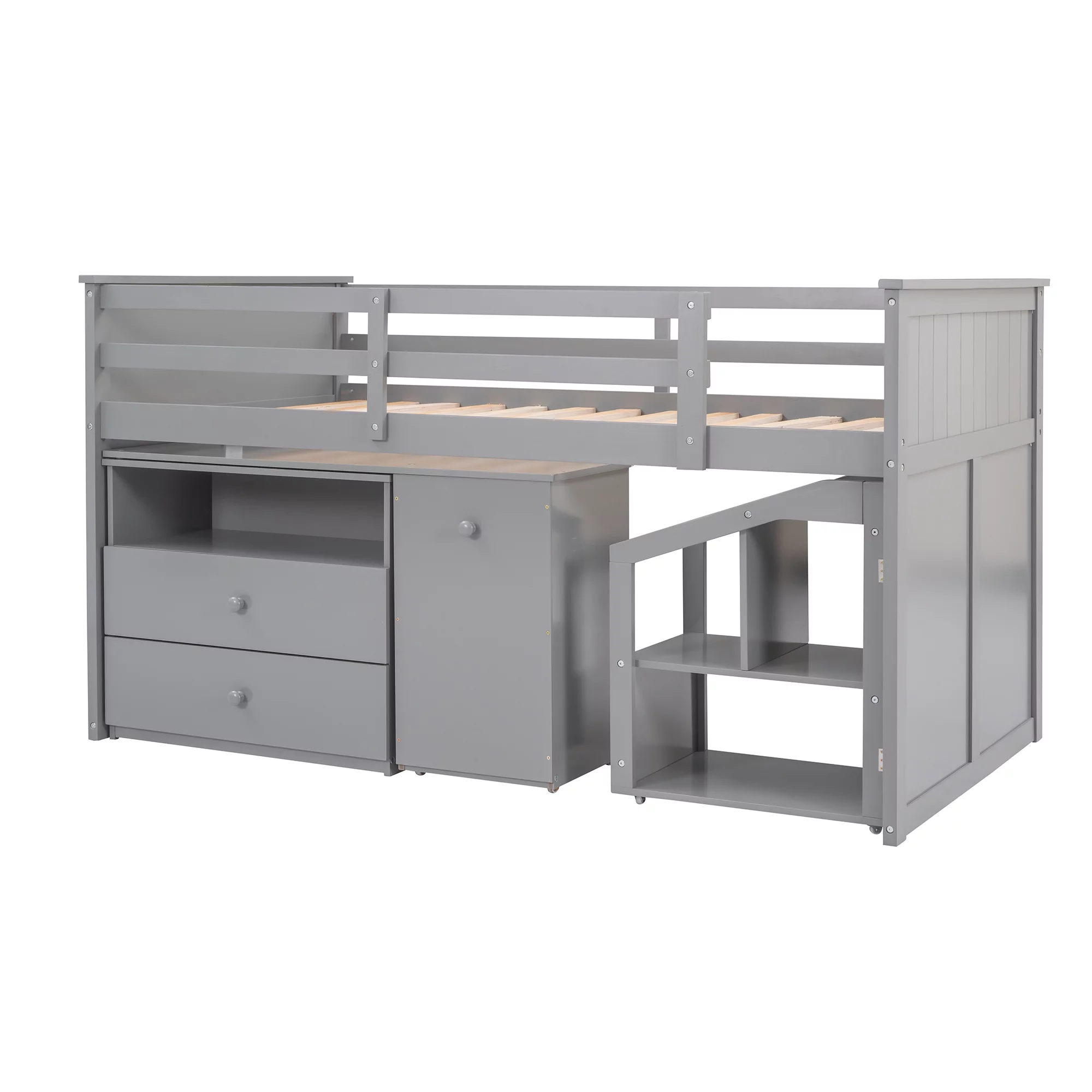Gray Low Study Full Loft Bed with Cabinet, Shelves, and Rolling Portable Desk - Multifunctional Style
