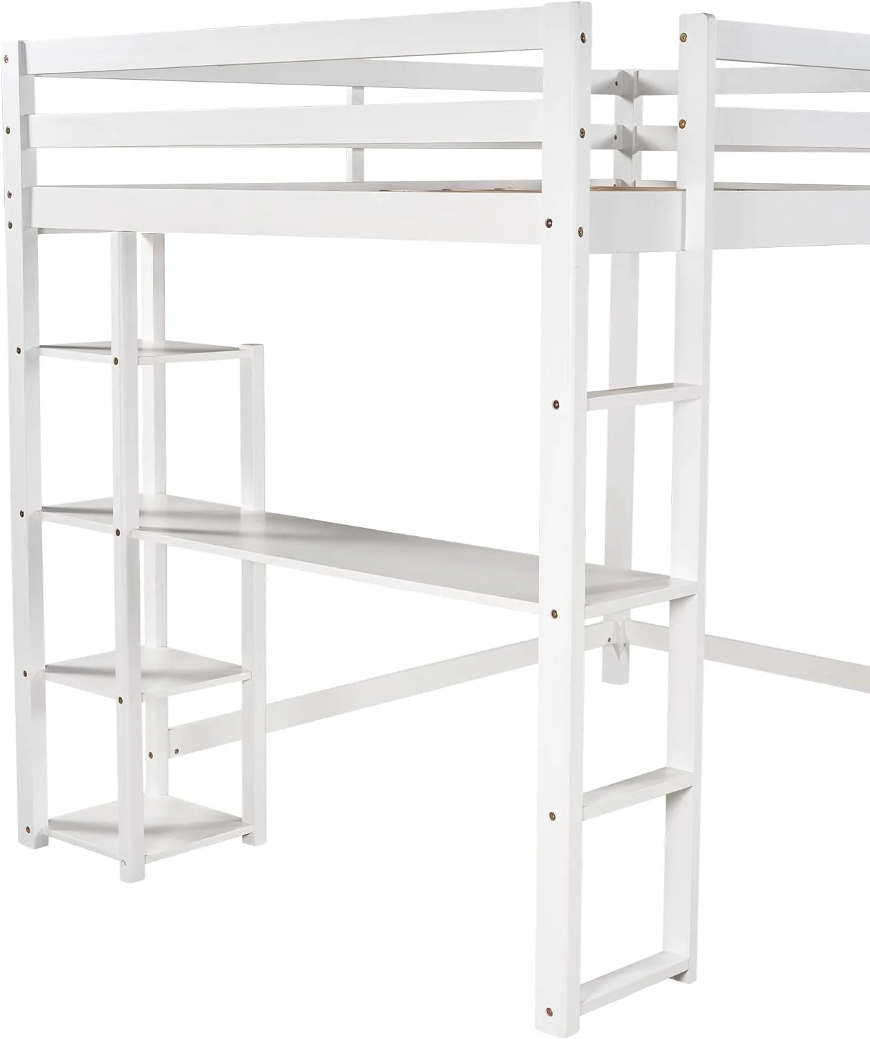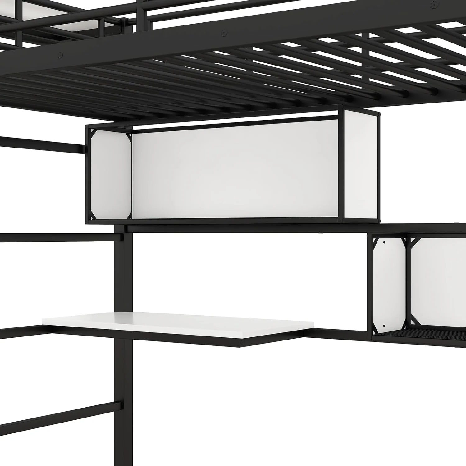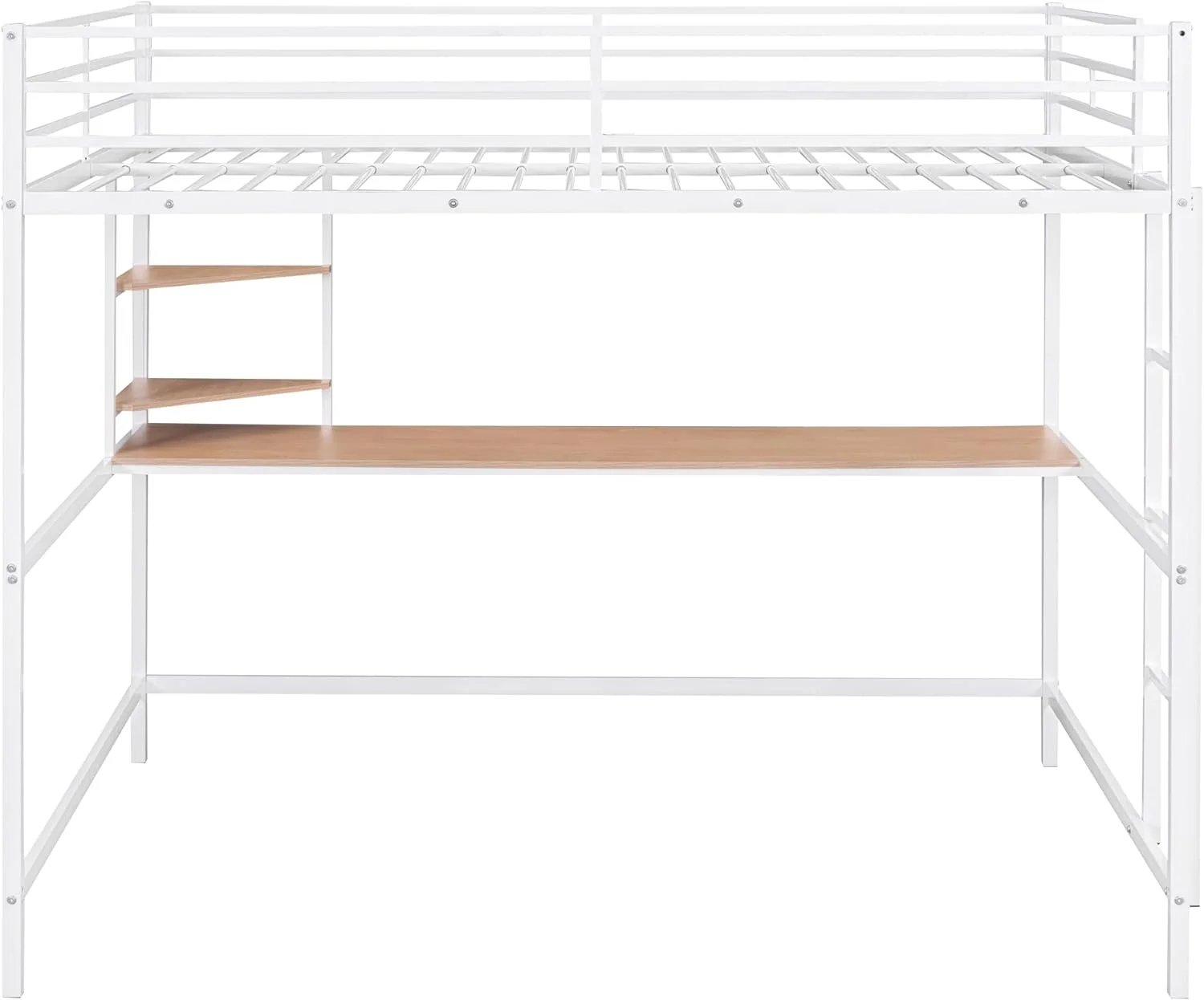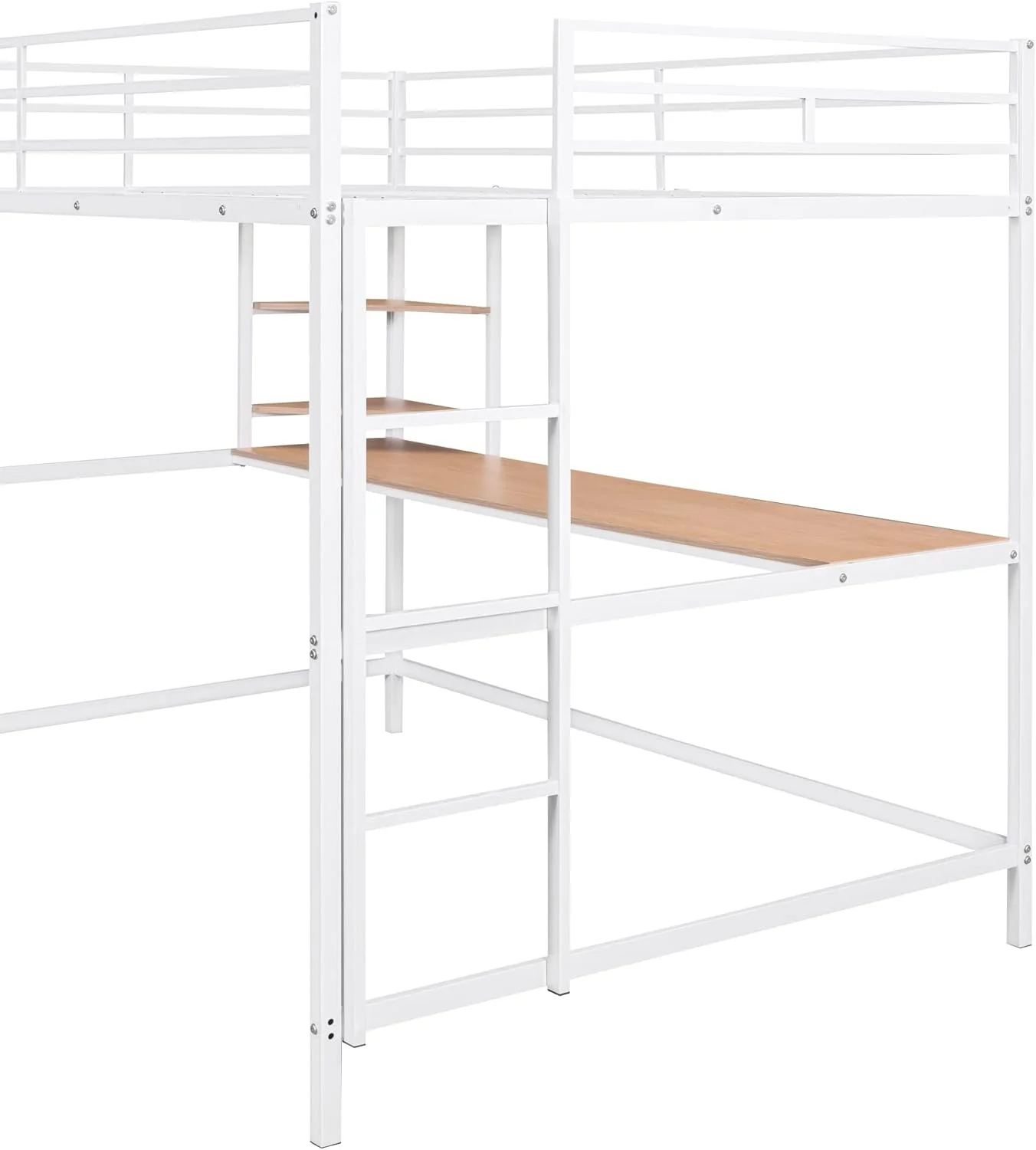 Full Size Metal Loft Bed With Long Desk, Shelves And Full Length Guardrails, Space-Saving Full Loft Bed For Bedroom, White