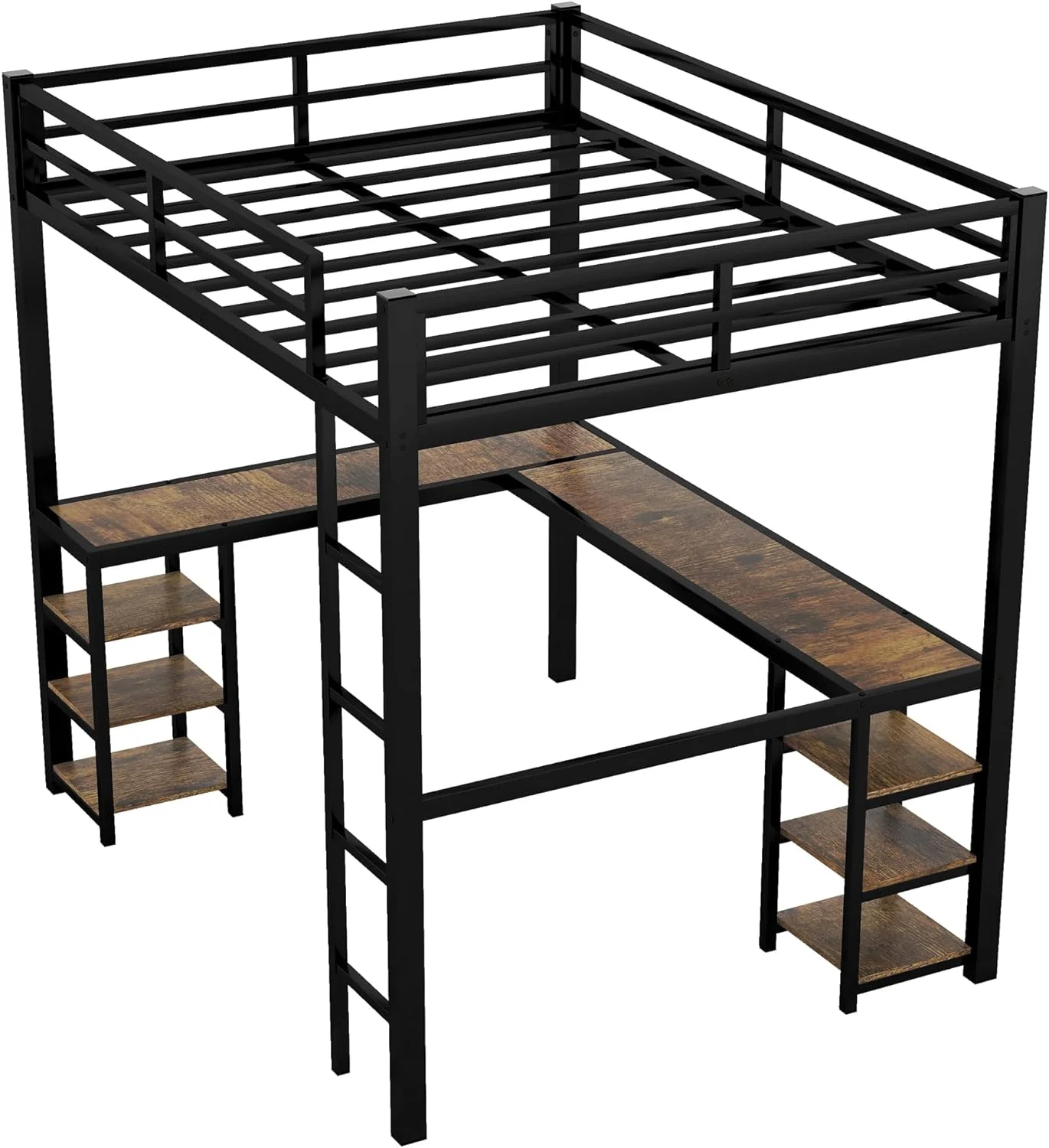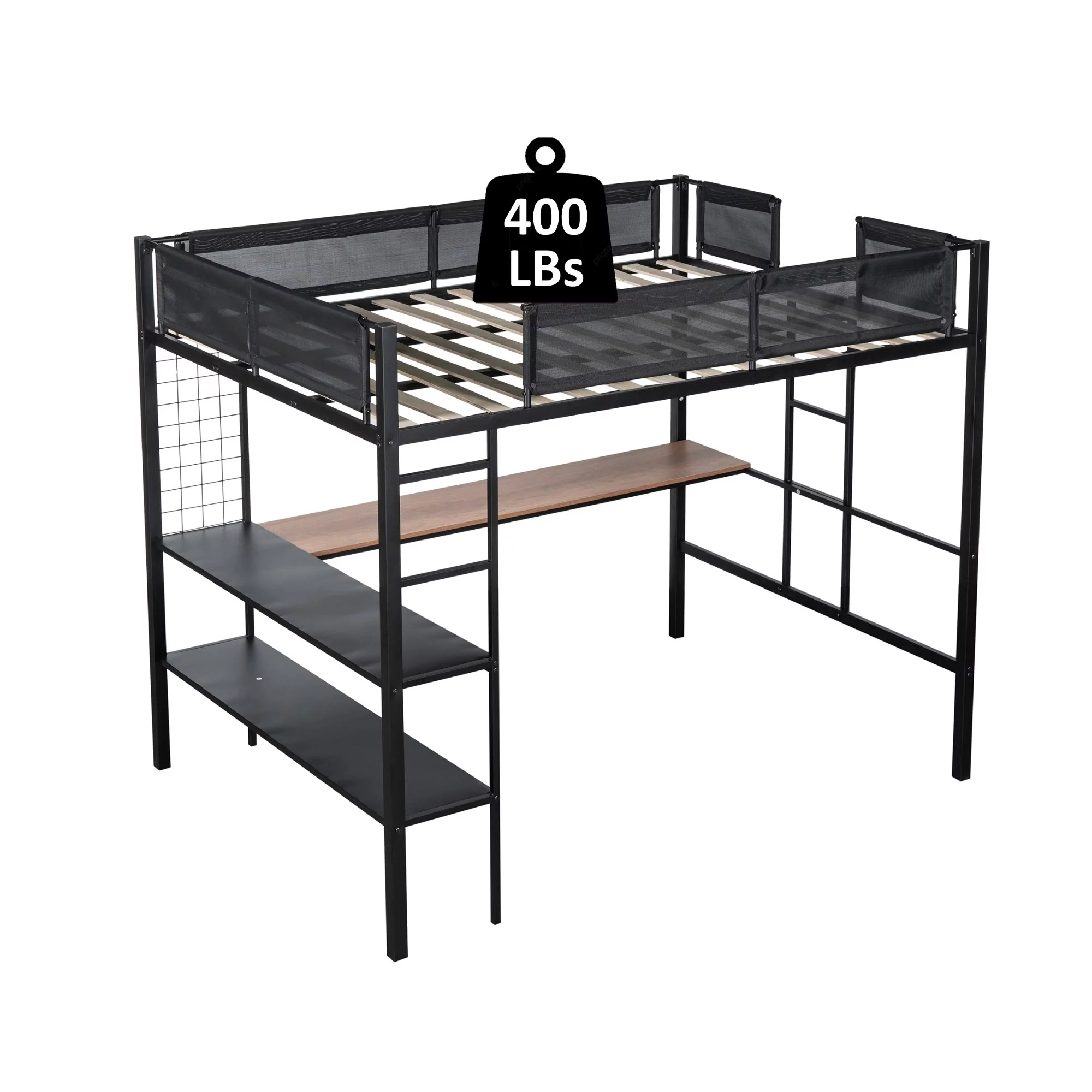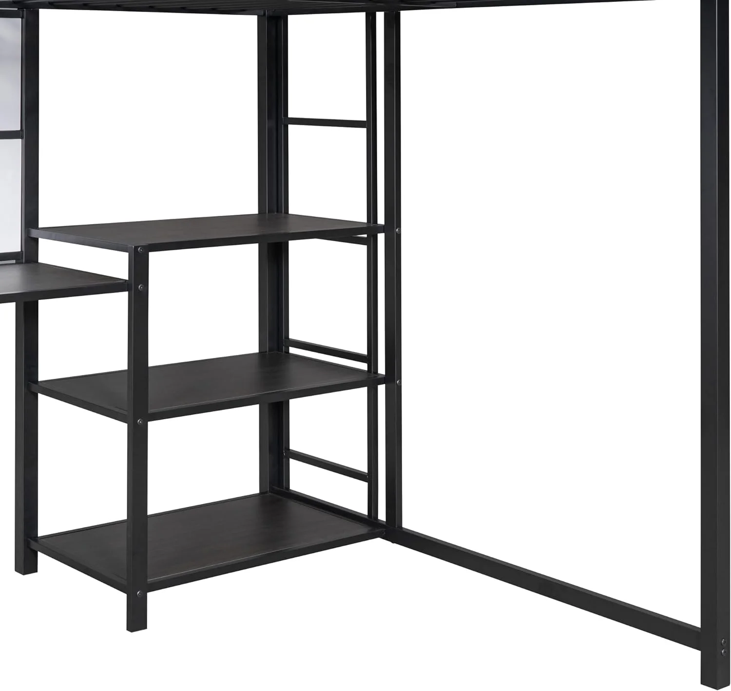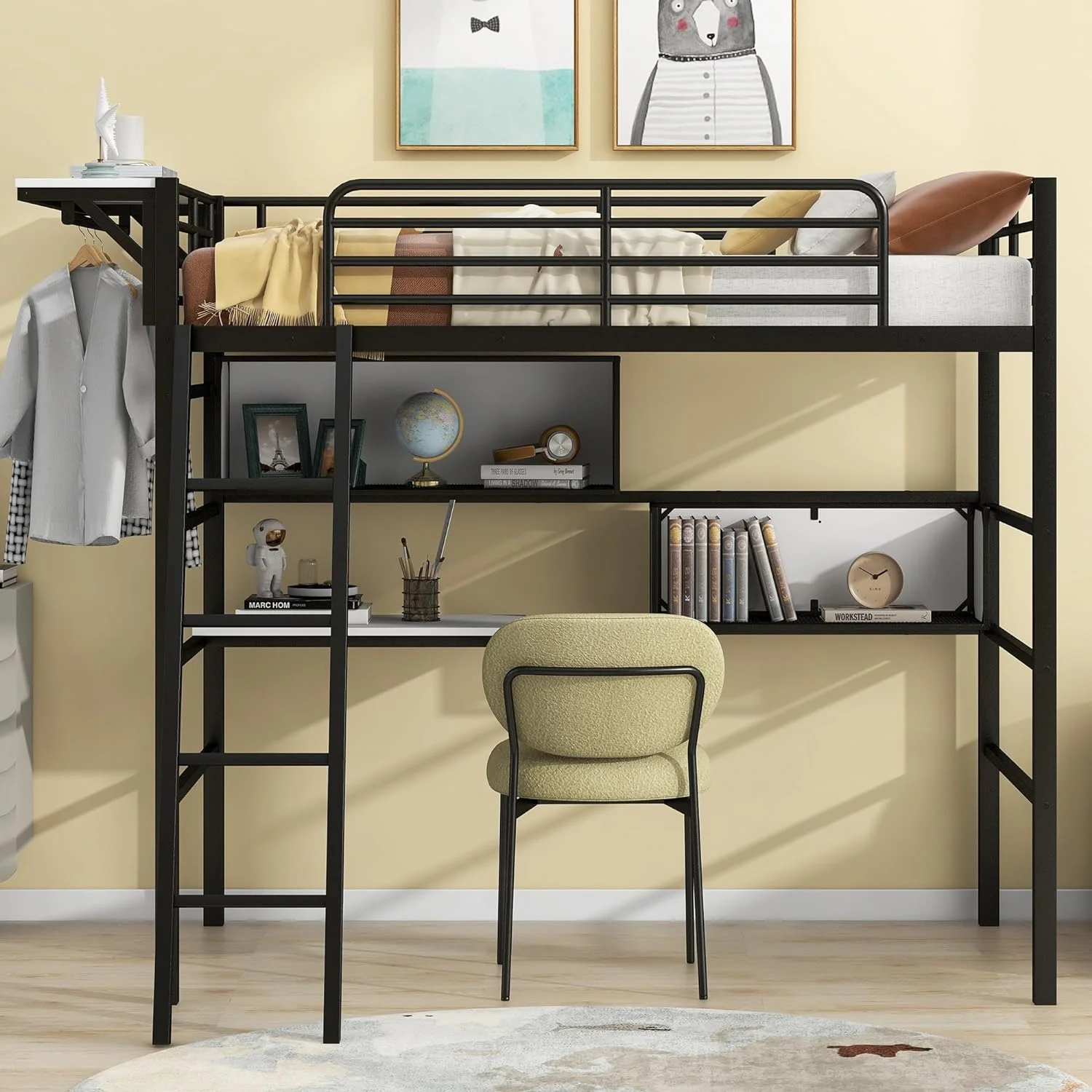 Full Size Metal Loft Bed With Long Desk, Shelves And Full Length Guardrails, Space-Saving Full Loft Bed For Bedroom, White