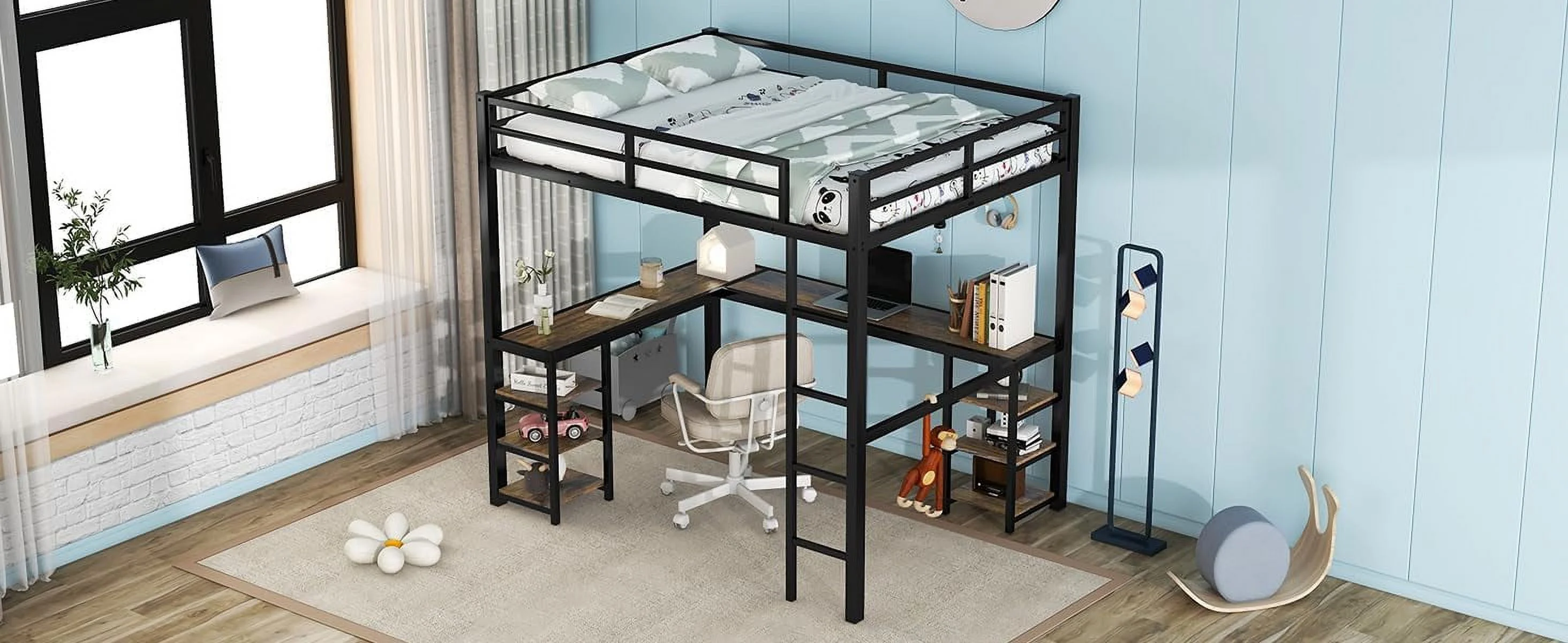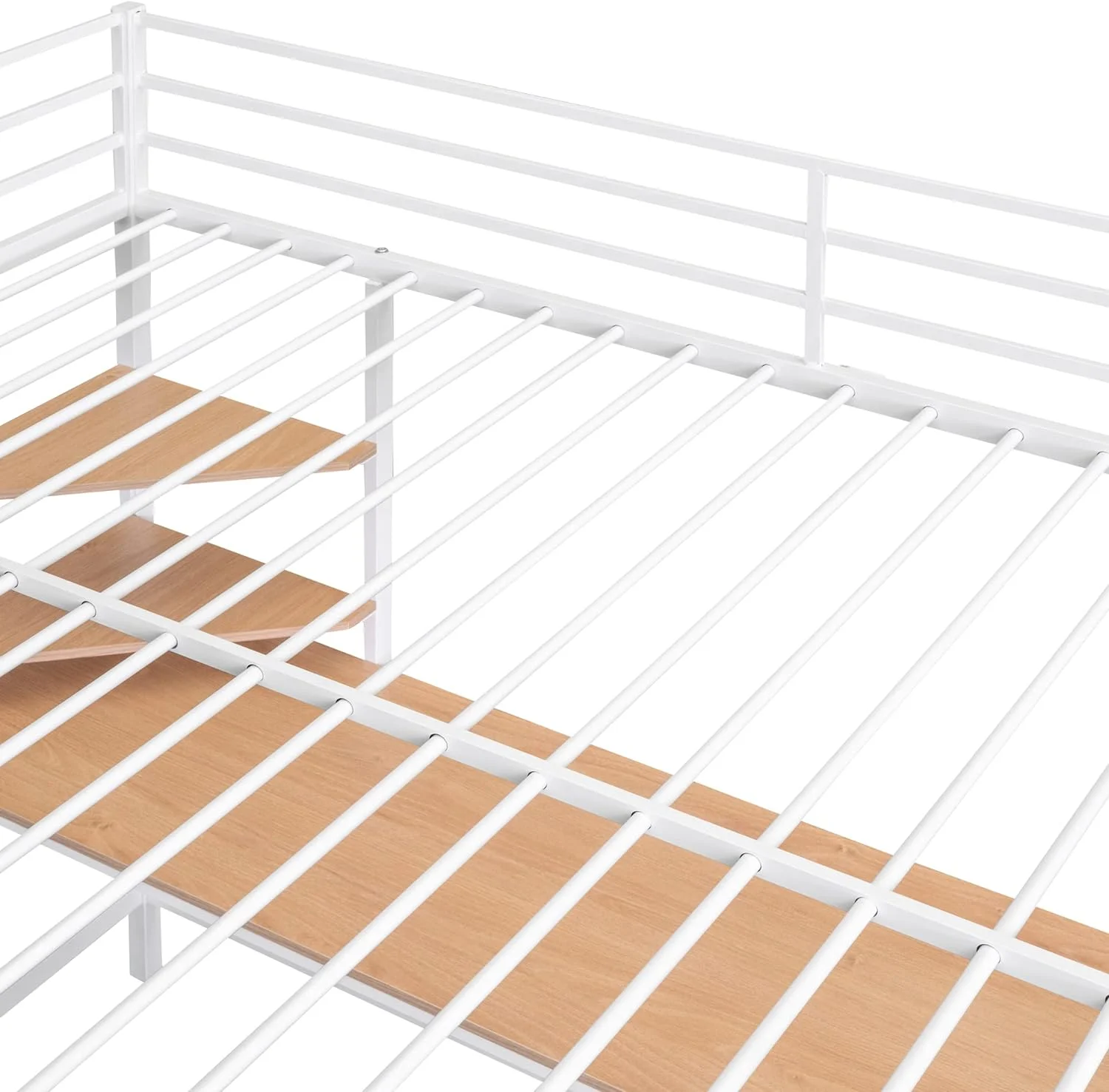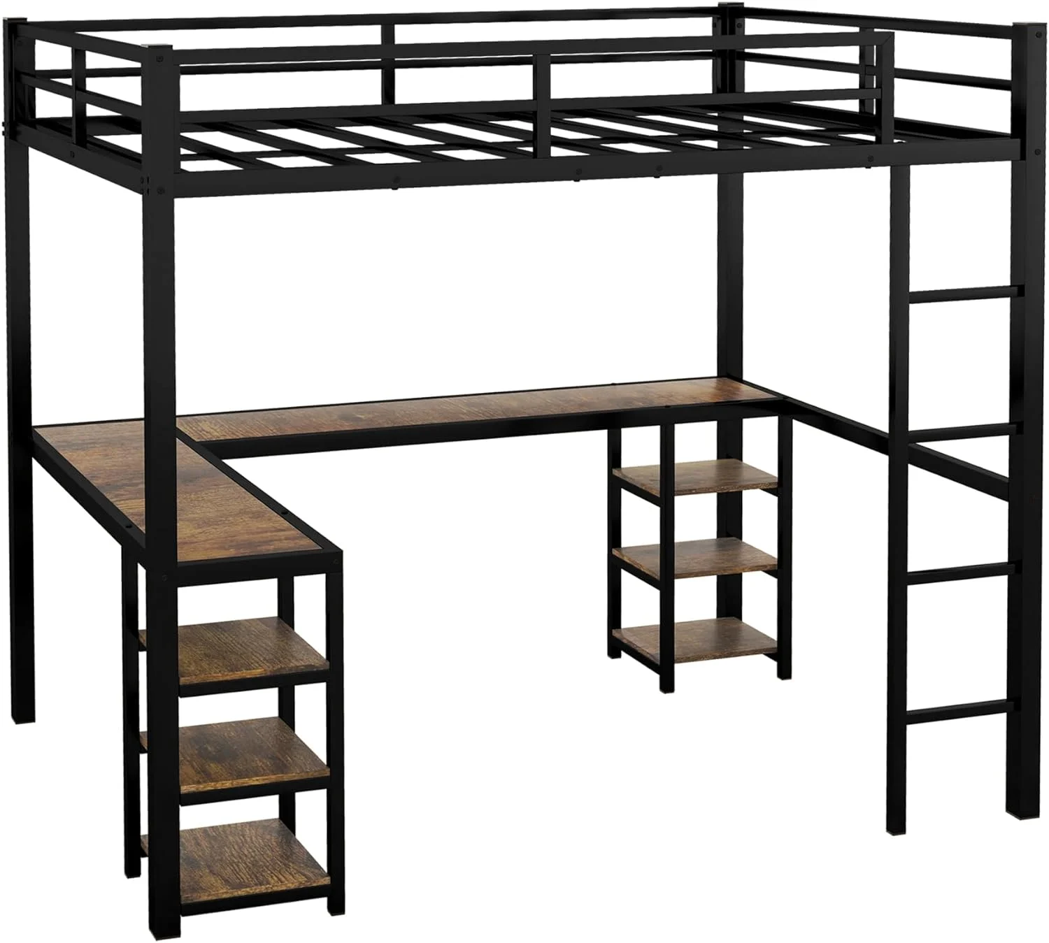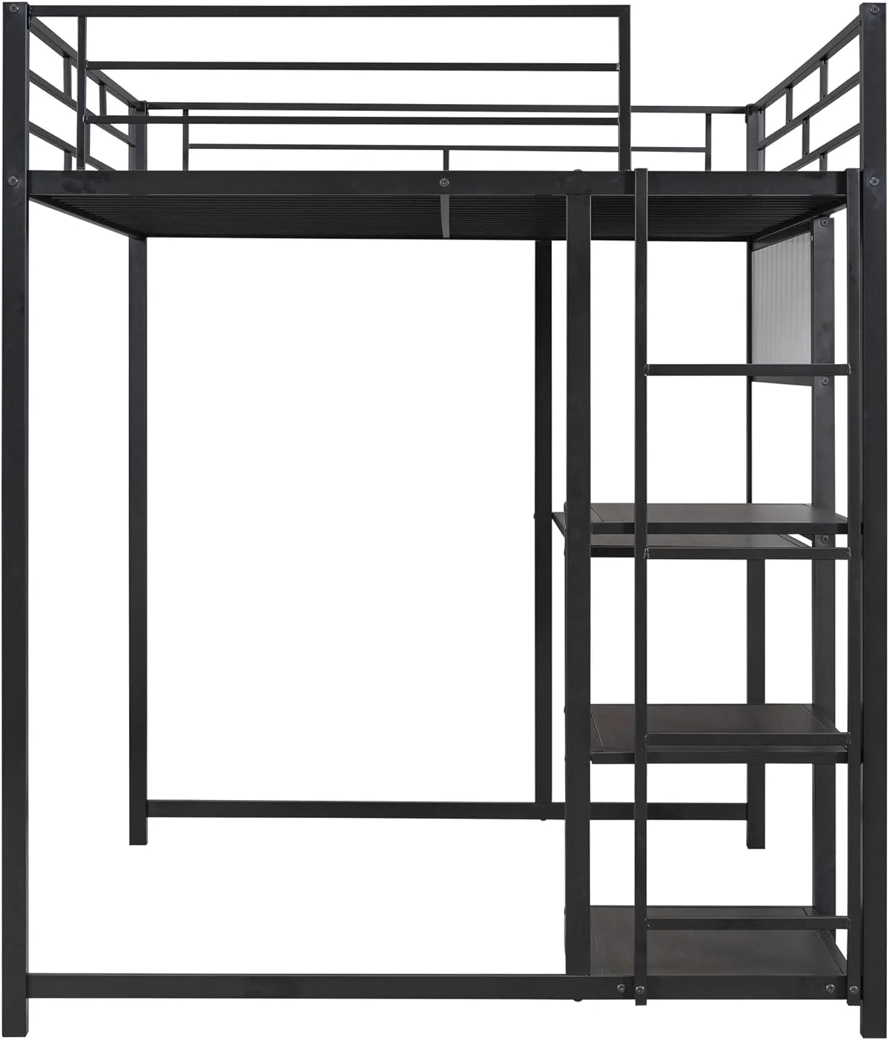 Full Size Metal Loft Bed With Long Desk, Shelves And Full Length Guardrails, Space-Saving Full Loft Bed For Bedroom, White