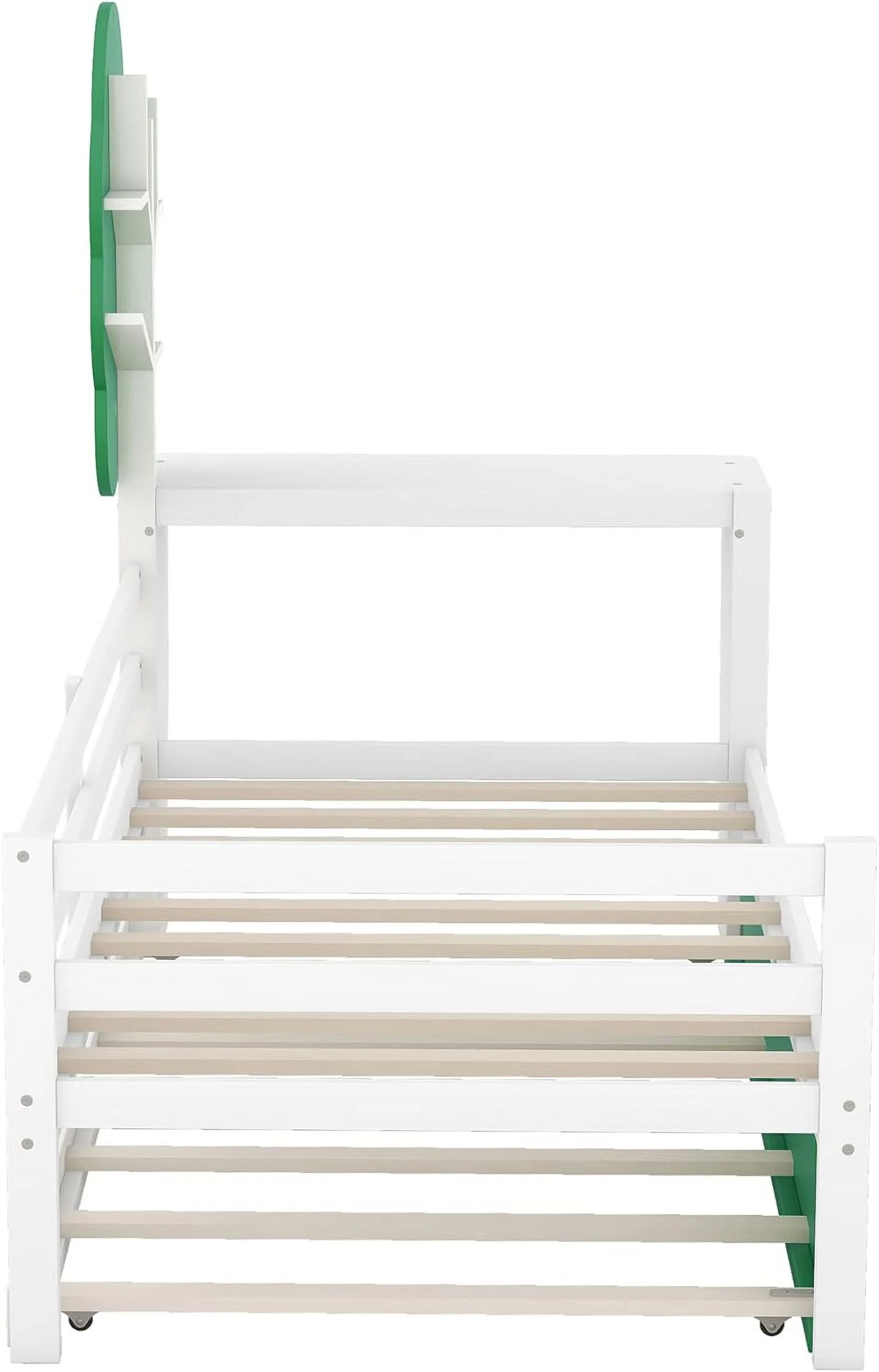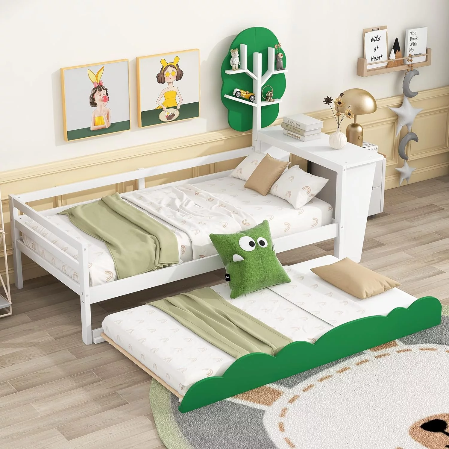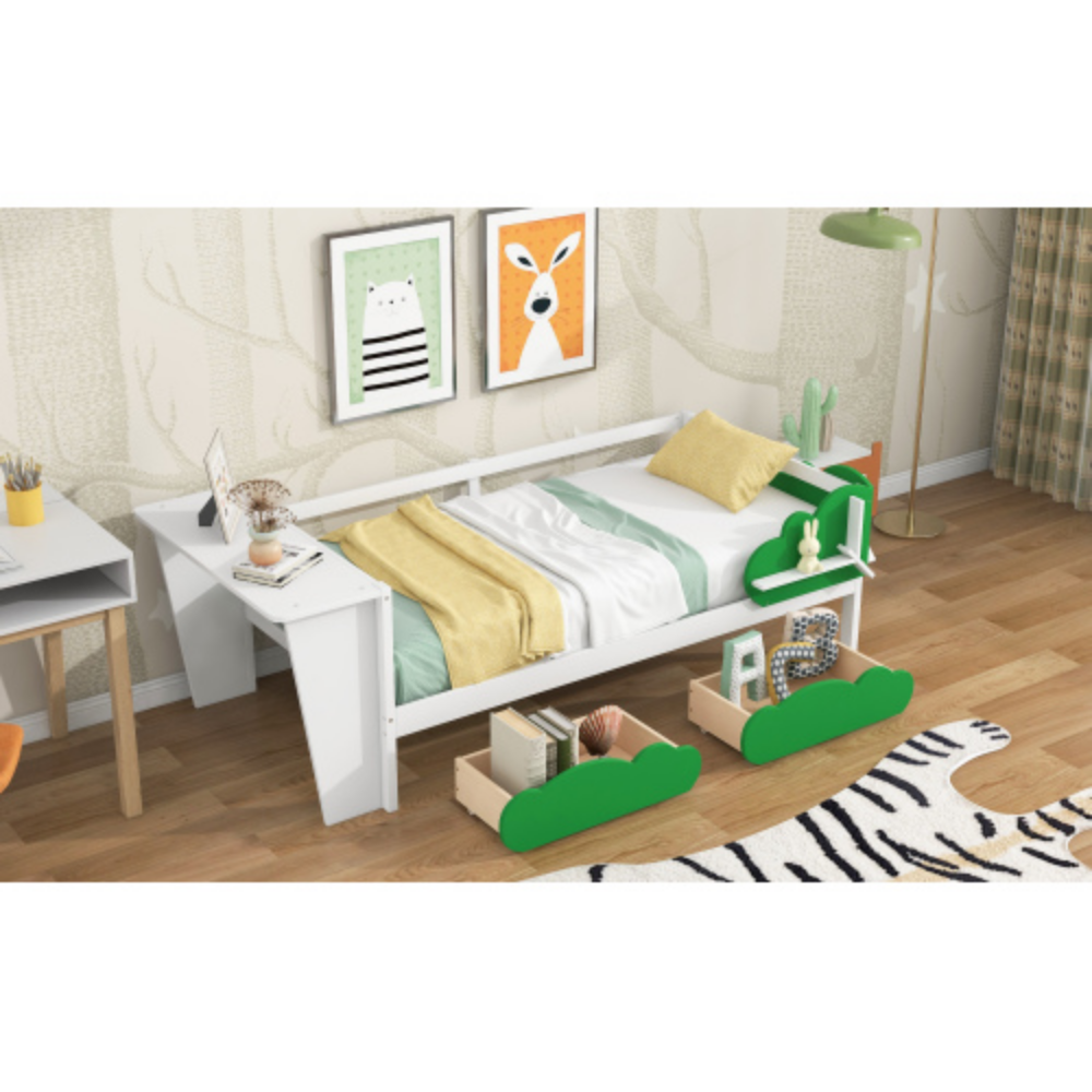 Twin Size Daybed with Desk, Green Leaf Shape Drawers and Shelves, White