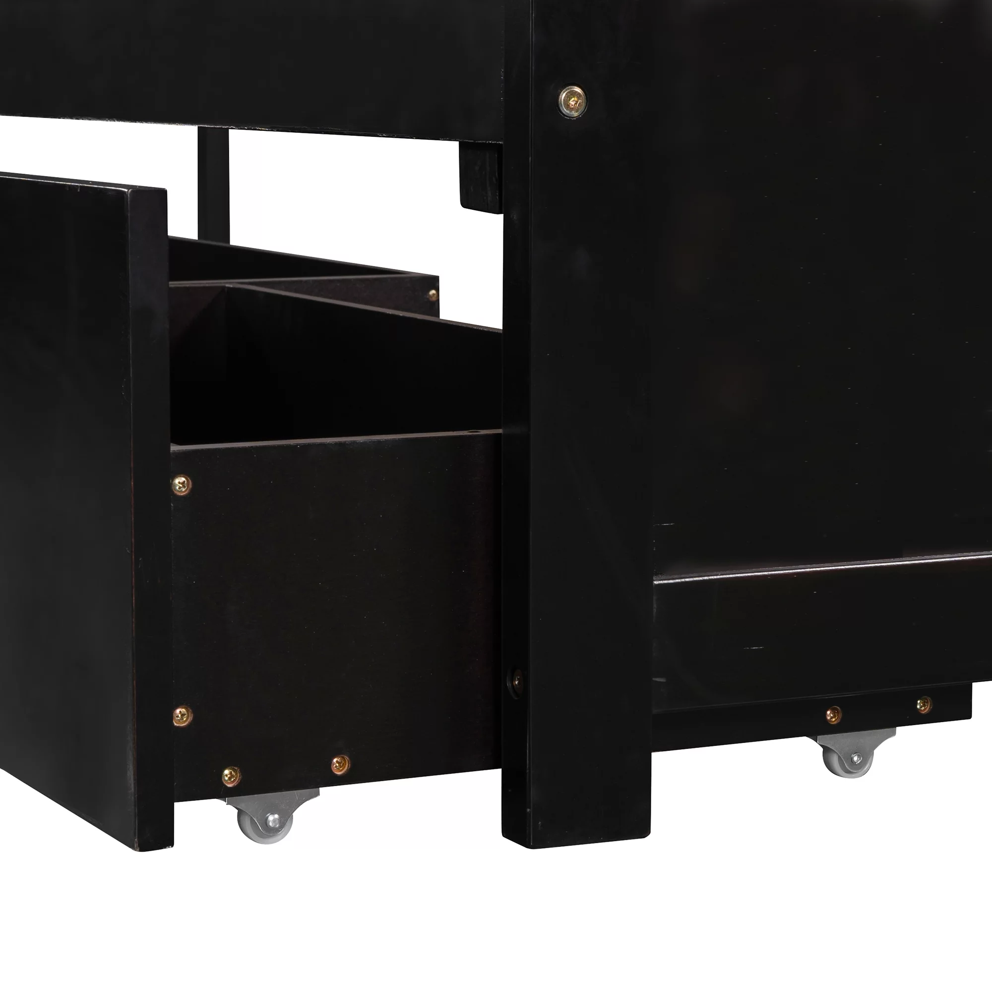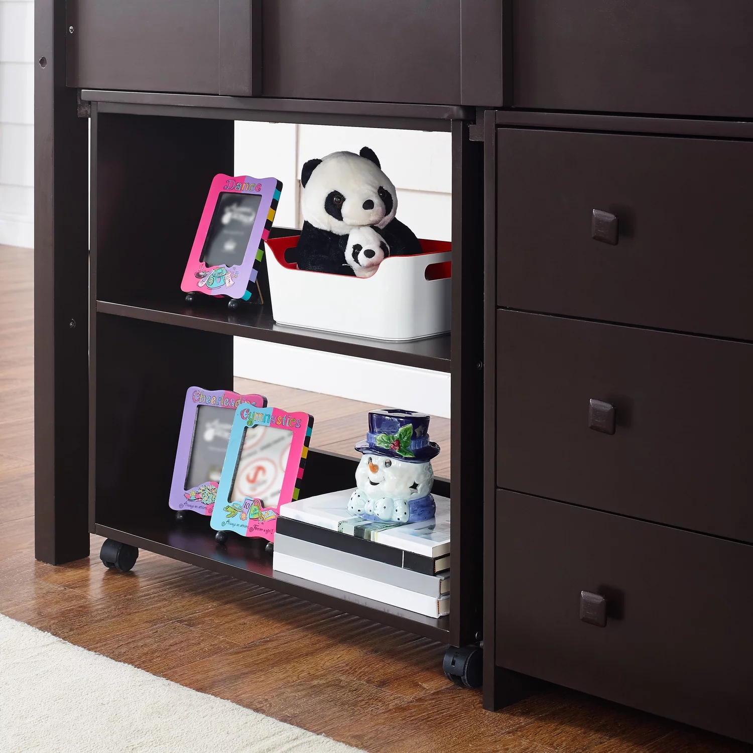 Low Study Full Loft Bed with Cabinet ,Shelves and Rolling Portable Desk ,Multiple Functions Bed- Espresso