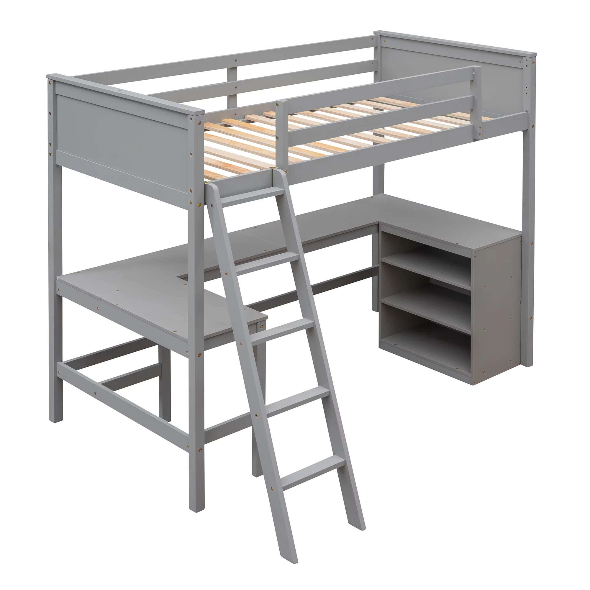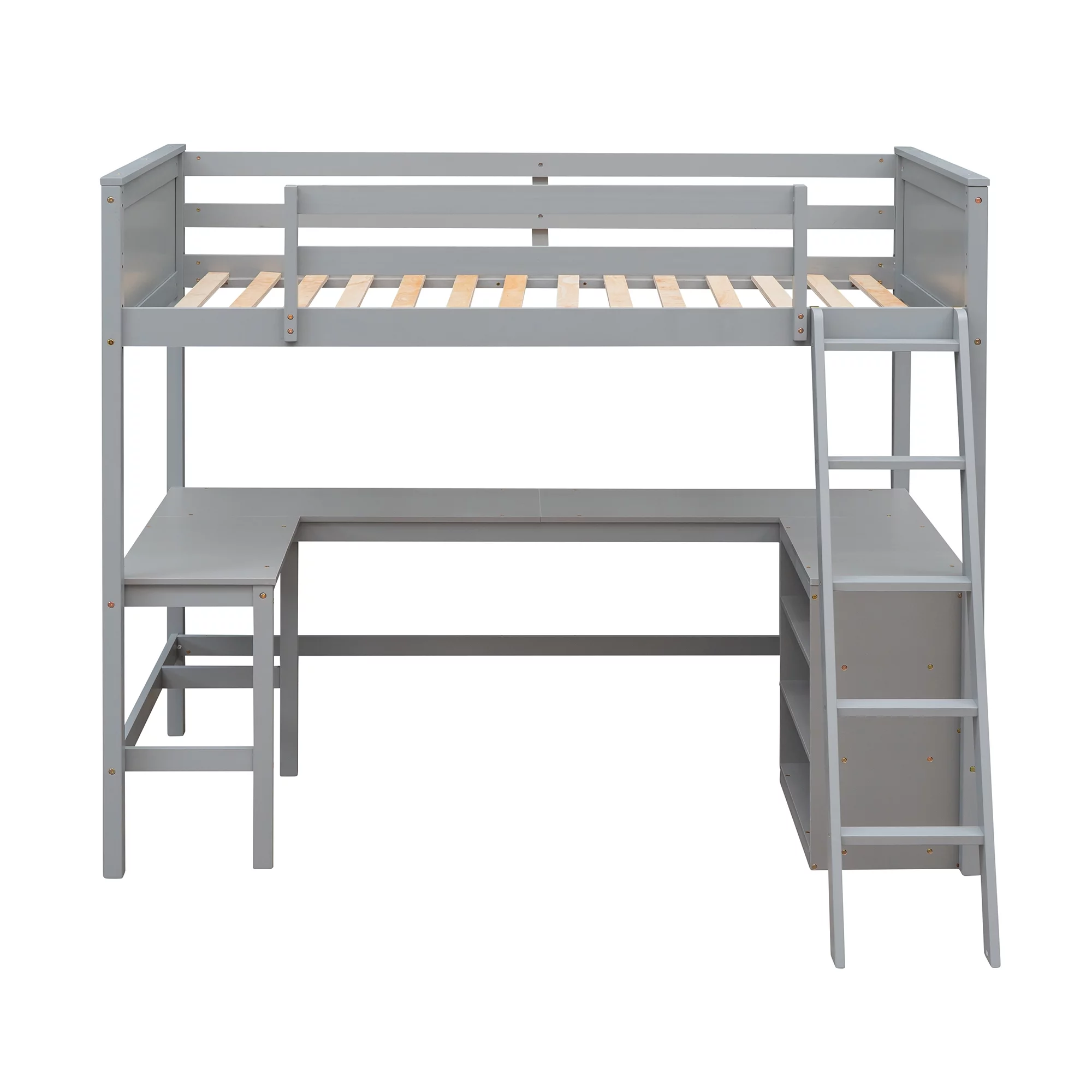 CoSoTower Twin Size Loft Bed with Shelves and Desk, Wooden Loft Bed with Desk - Gray