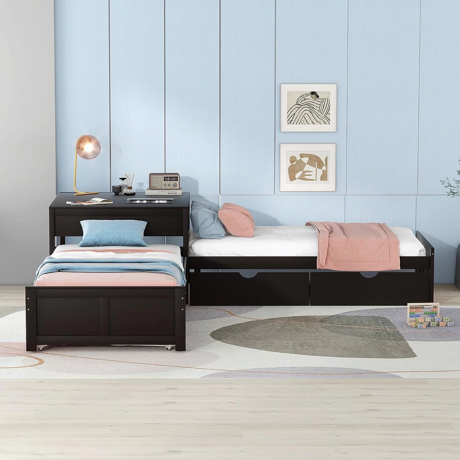 Loft Bed Low Study Twin Size Loft Bed With Storage Steps and Portable,Desk,Espresso