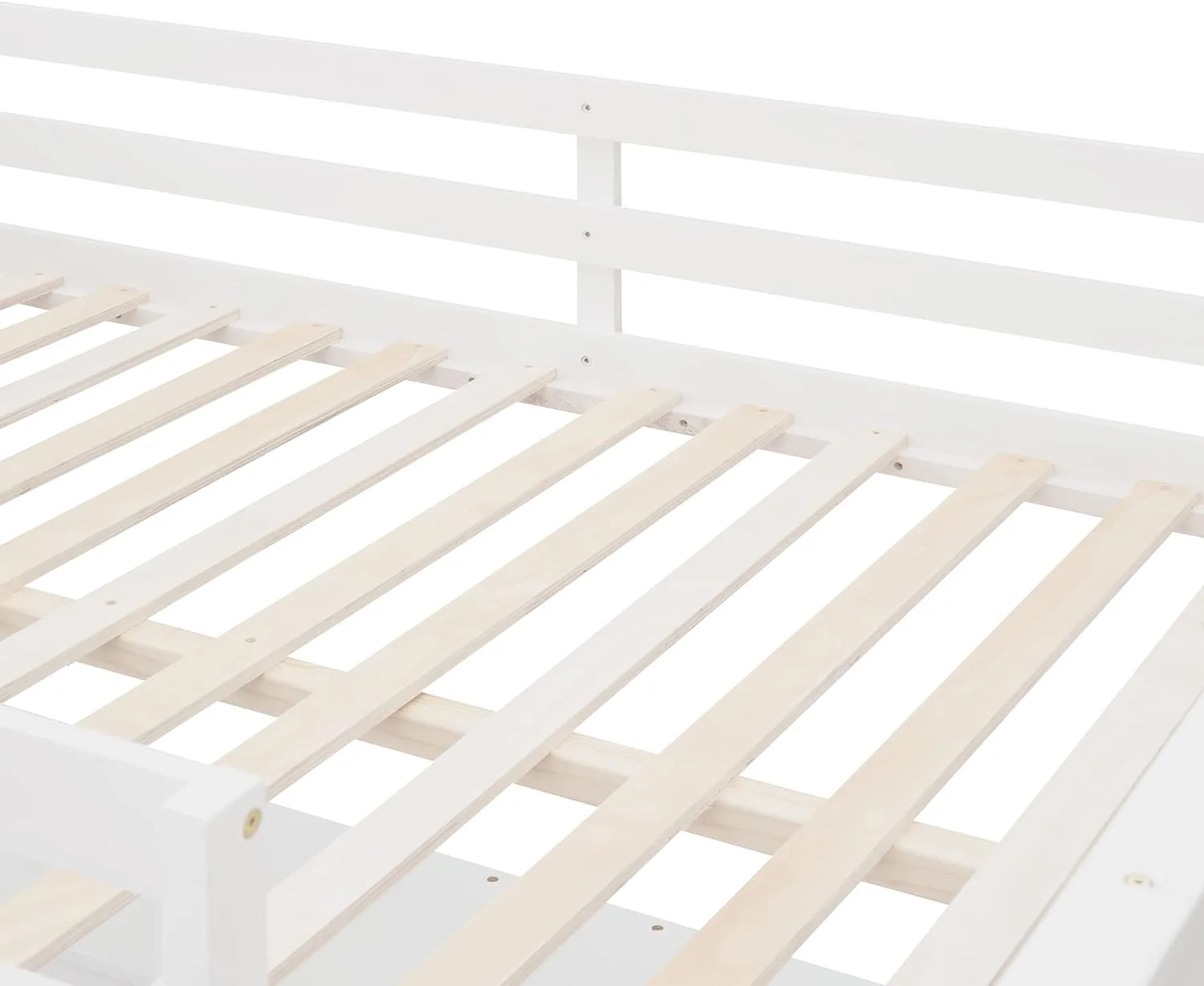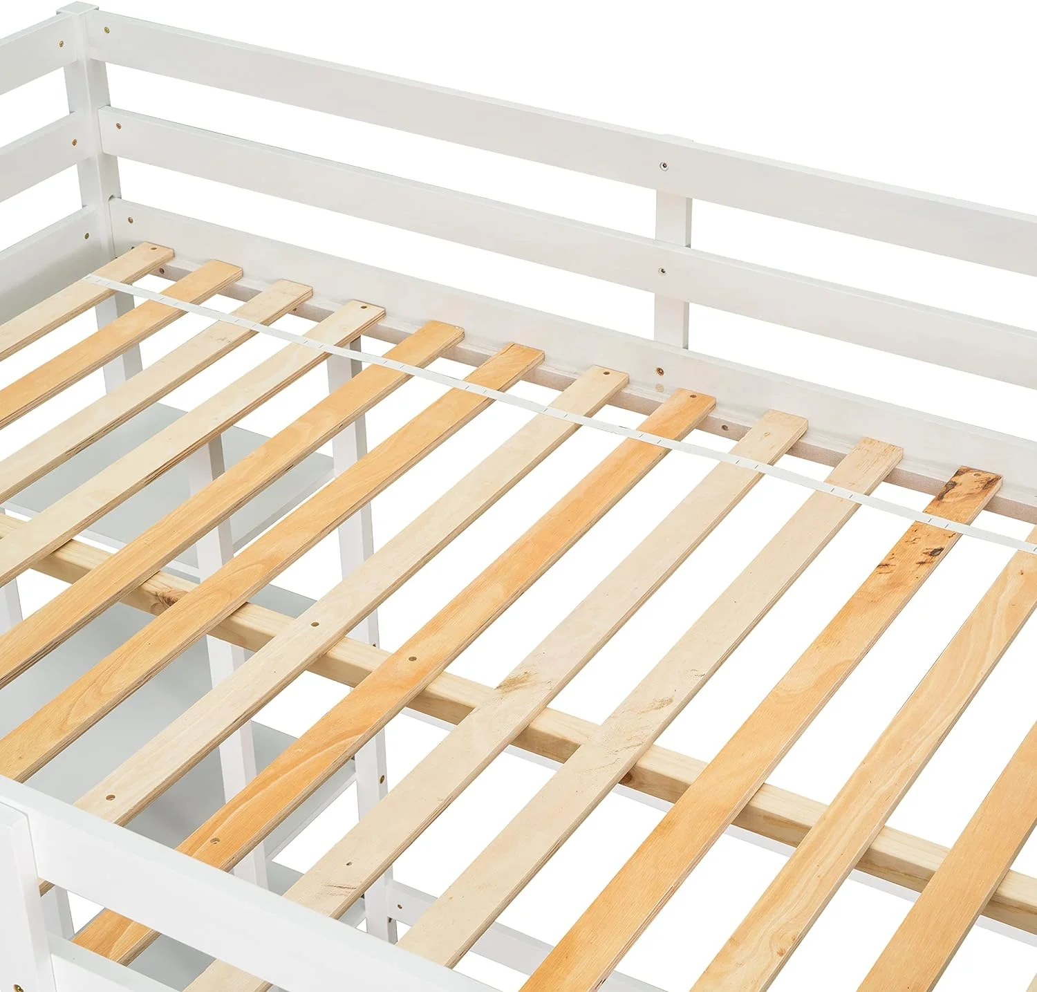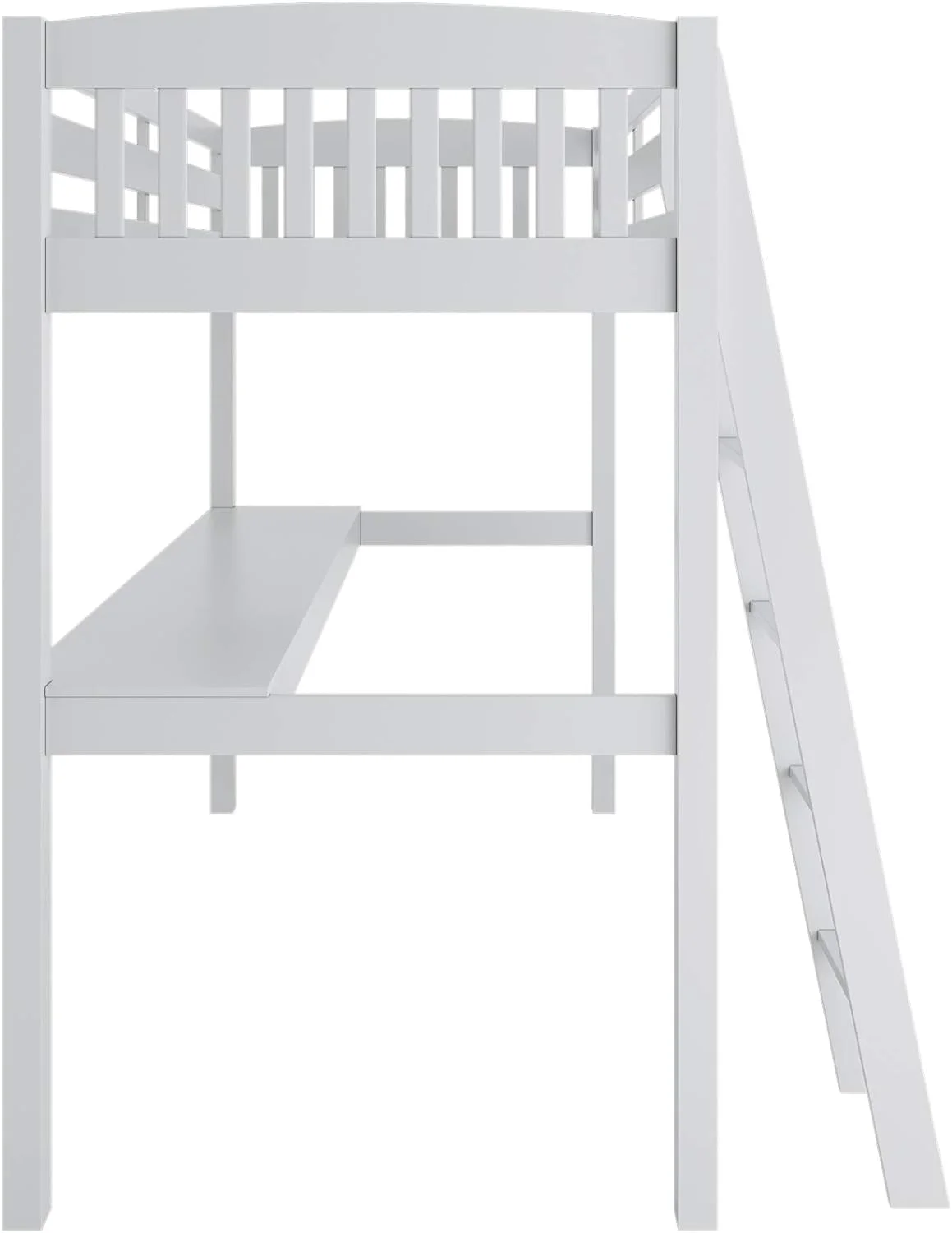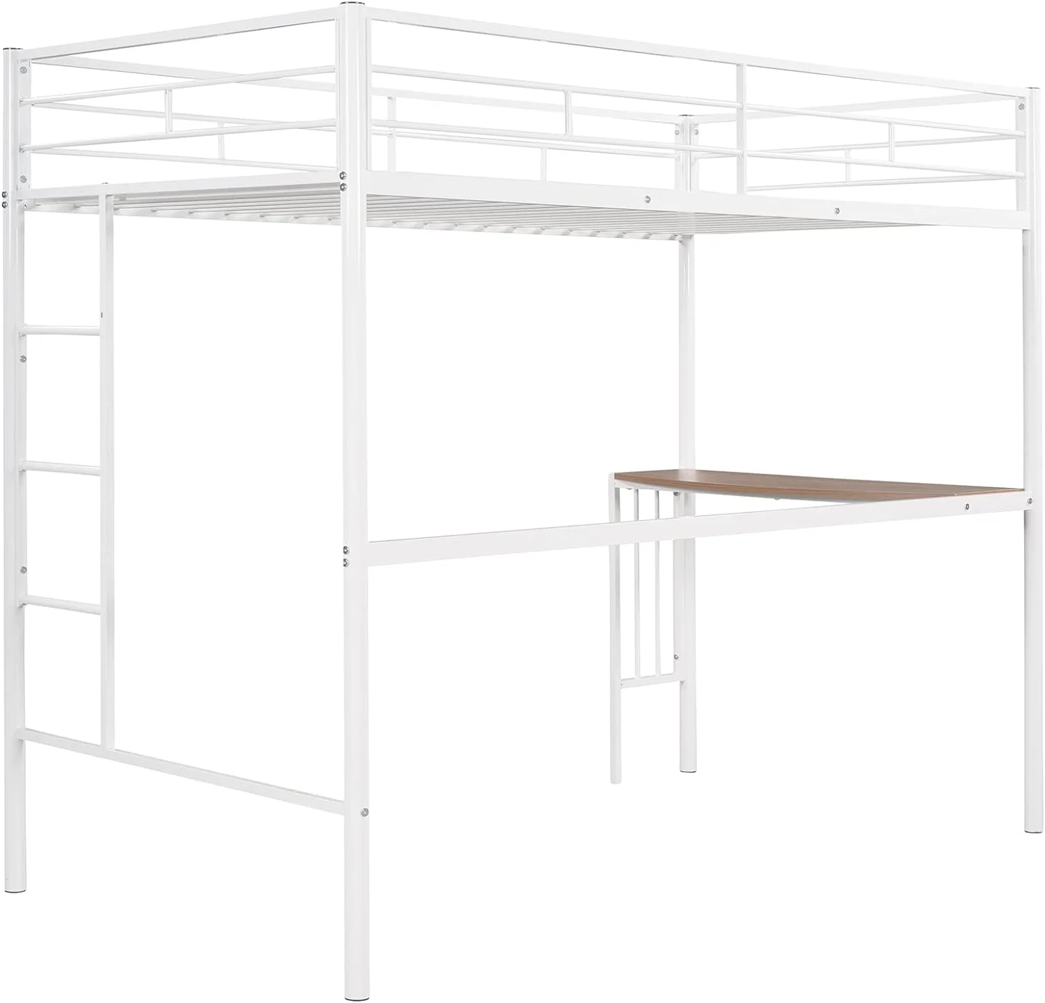 Loft Bed Frame with Desk, Twin Size Wooden Bed Frame with Guard Rails & Ladder for Kids and Teens - White