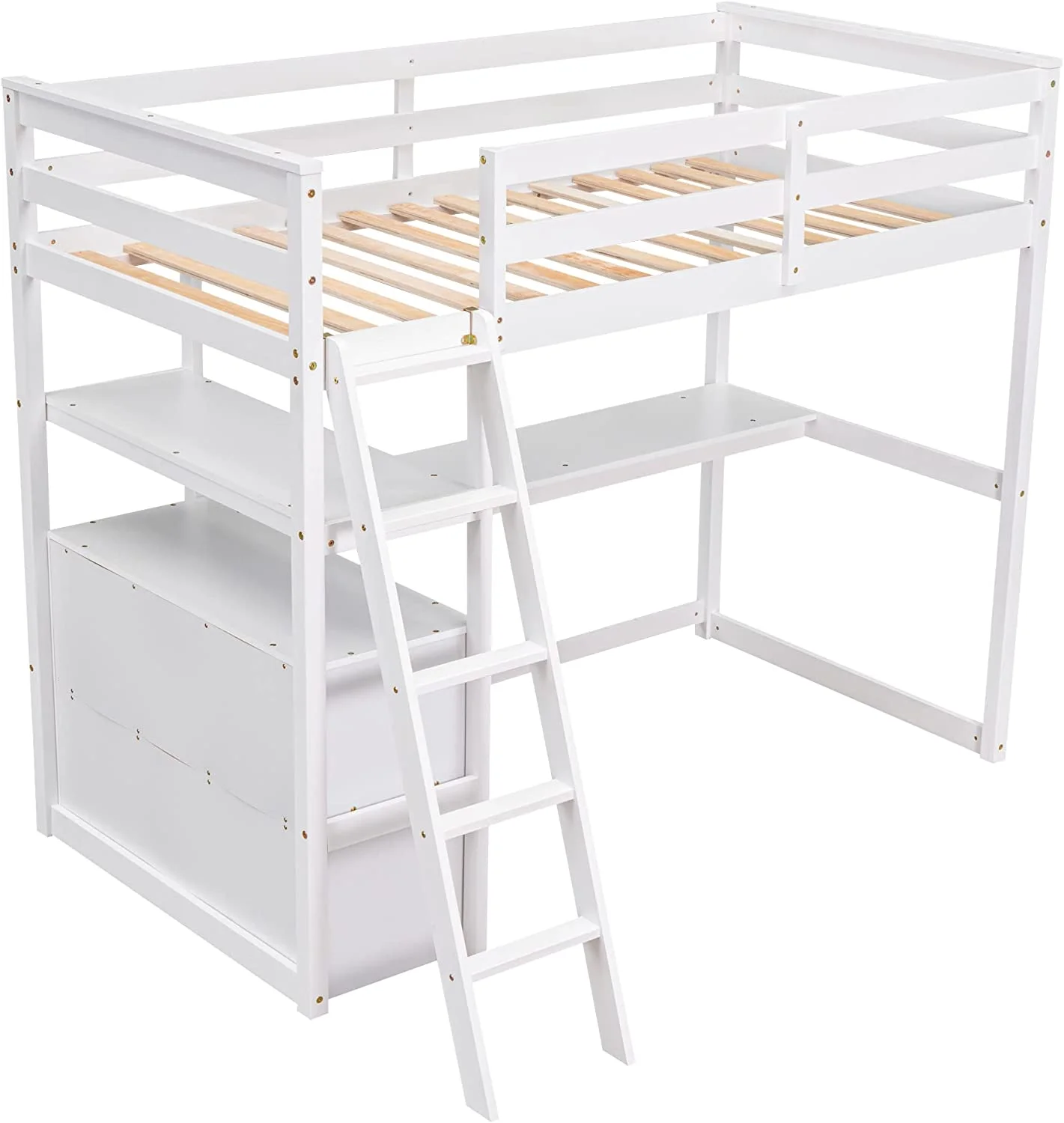 ikayaa Twin Size Loft Bed with Convenient Desk, Shelves, and Ladder, White