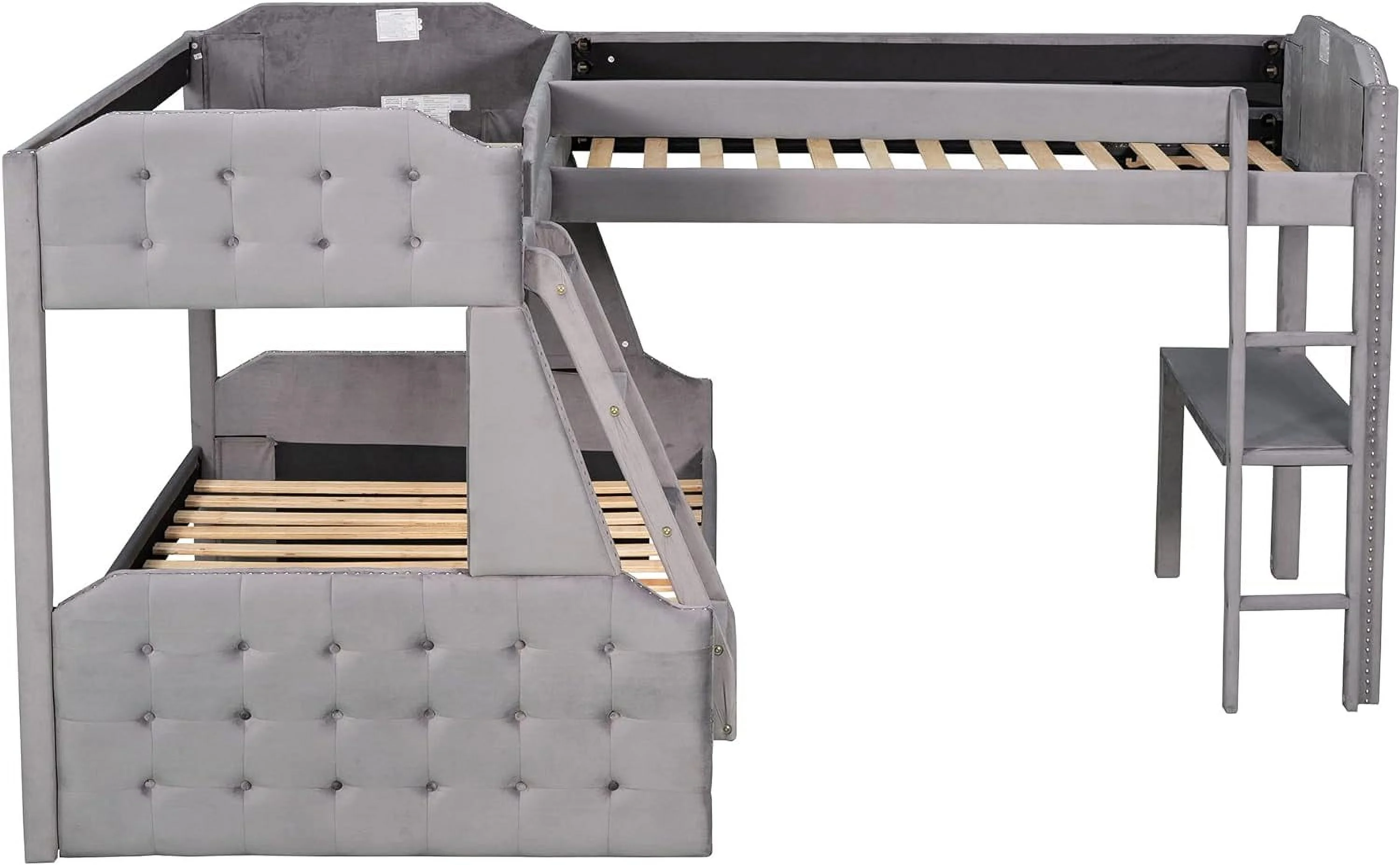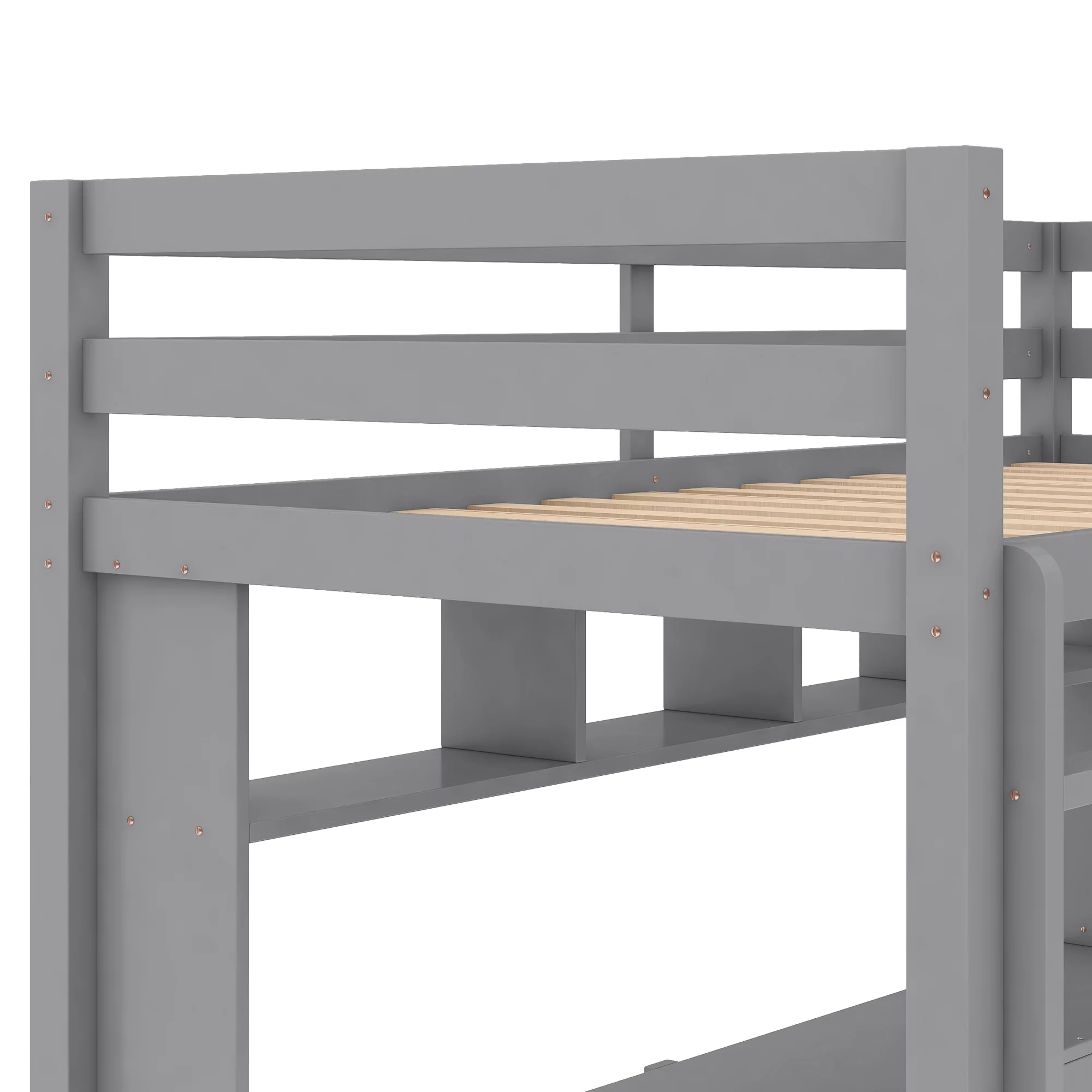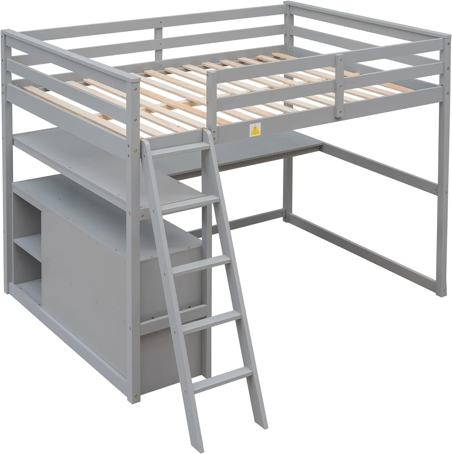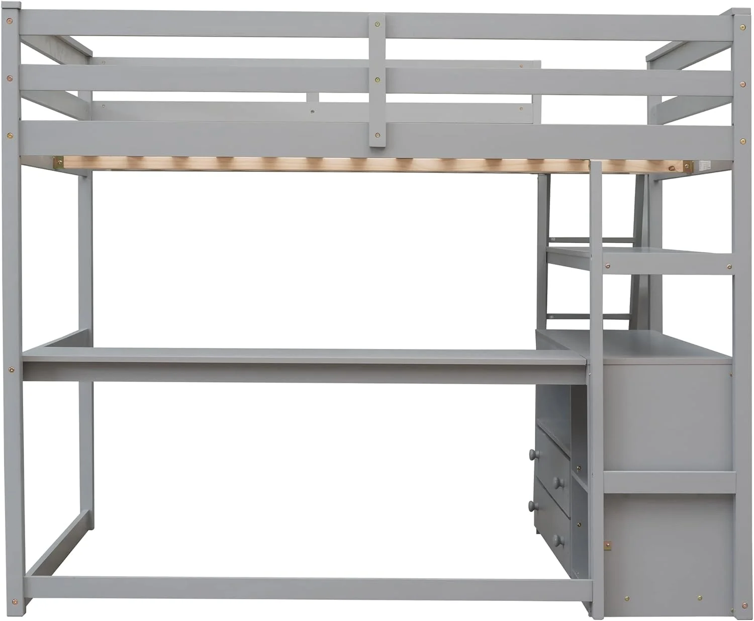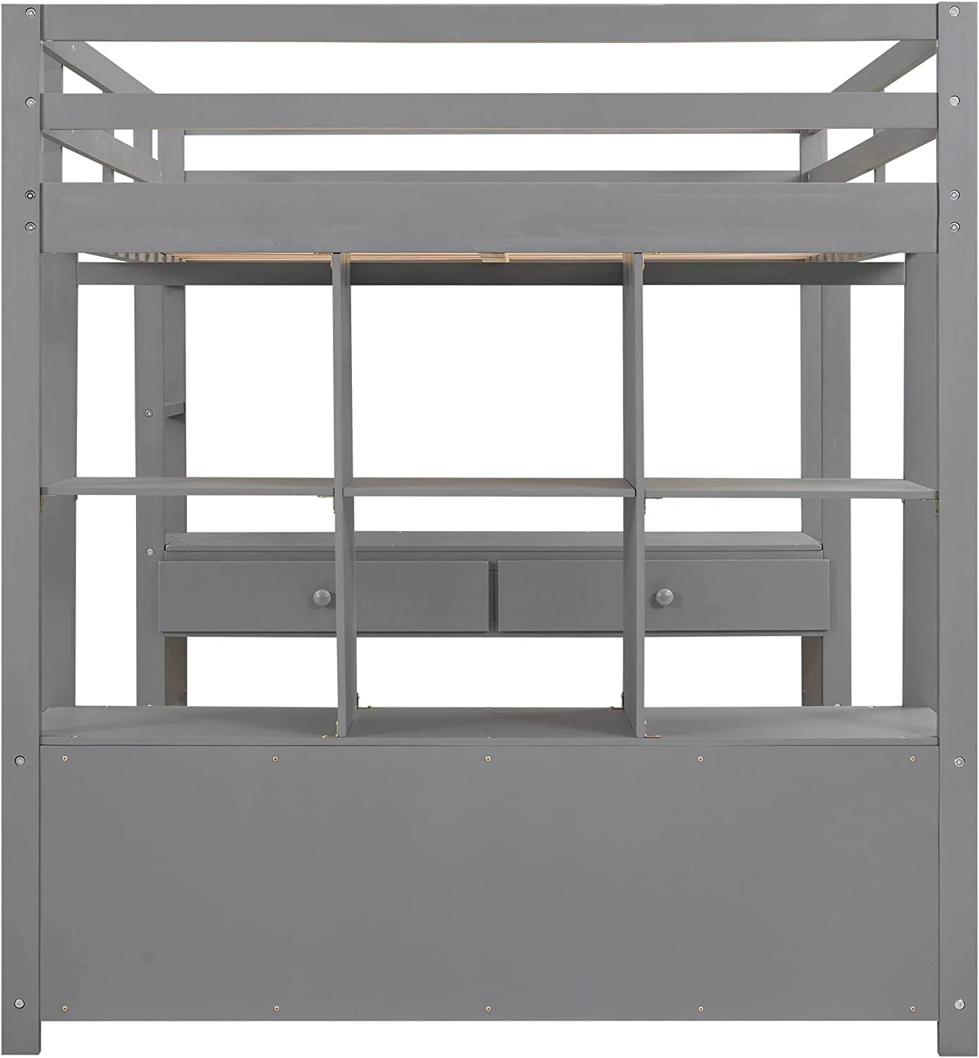 Full Loft Bed With Desk Ad Storage Drawers, Solid Wood Loft Bed Frame With Bookshelf (Full Size, Gray)