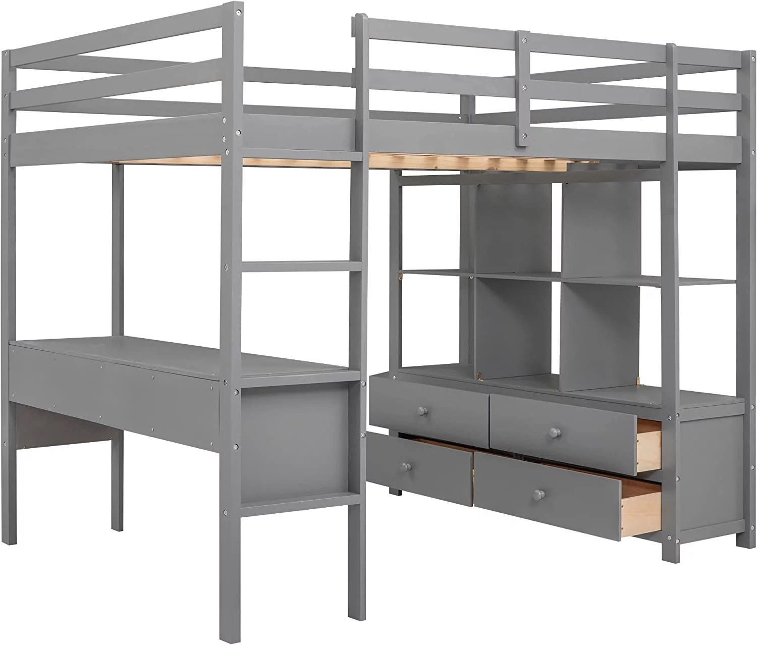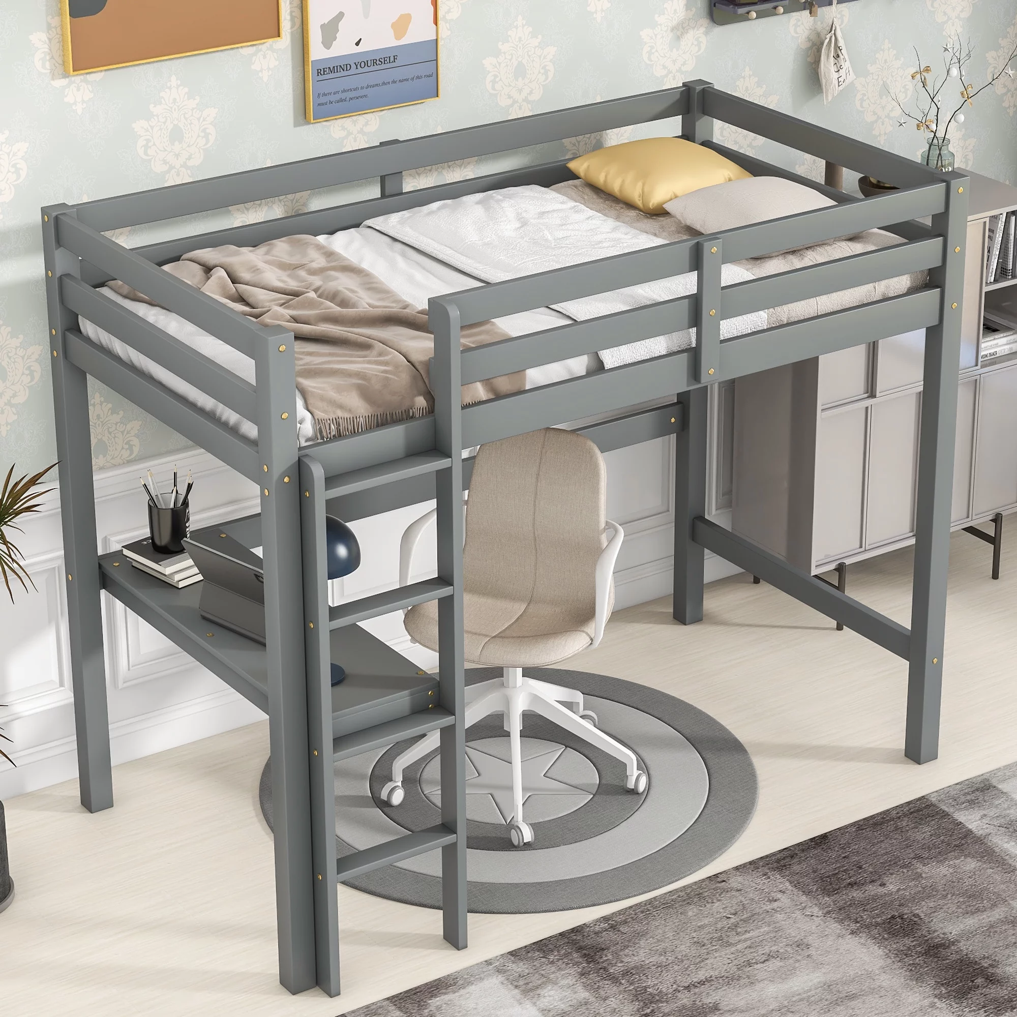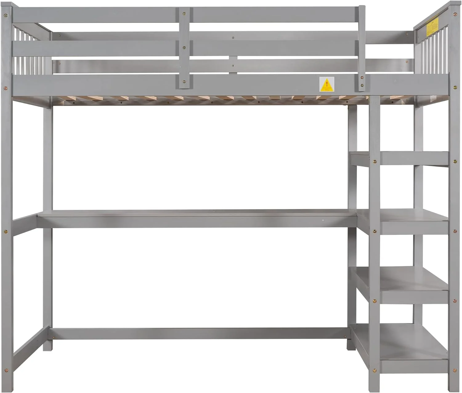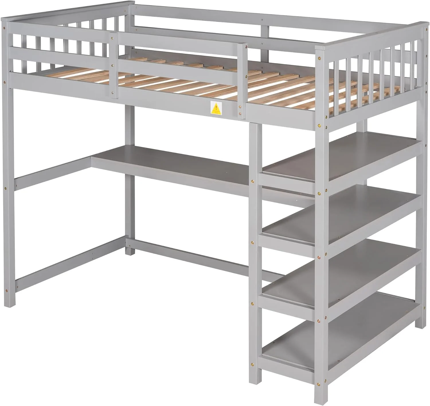 Size Loft Bed With Desk Ad Storage Shelves, Solid Wood Loft Bed Frame With Ladder Ad Guardrail For Kids Tees Adults - Gray