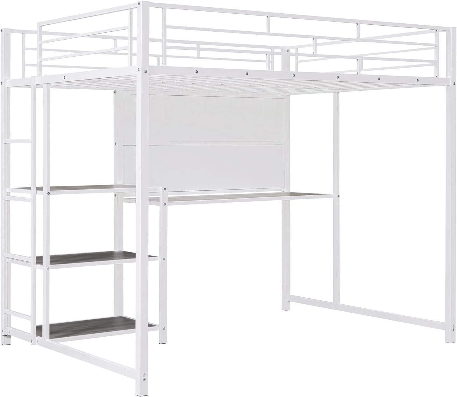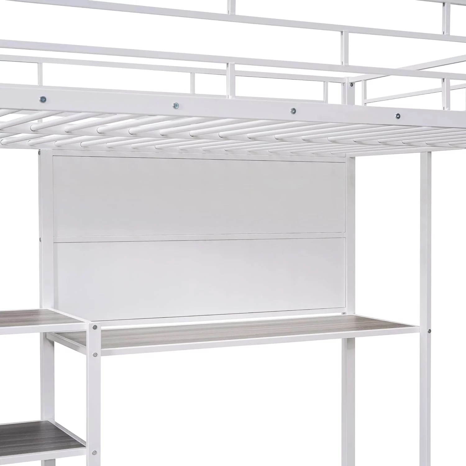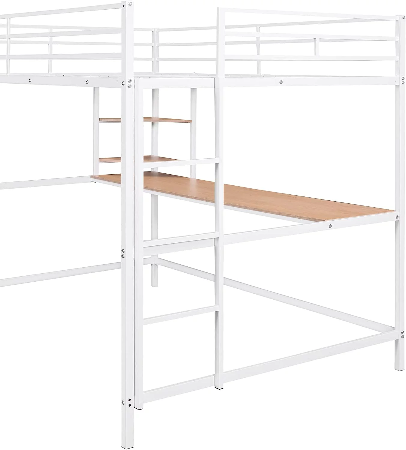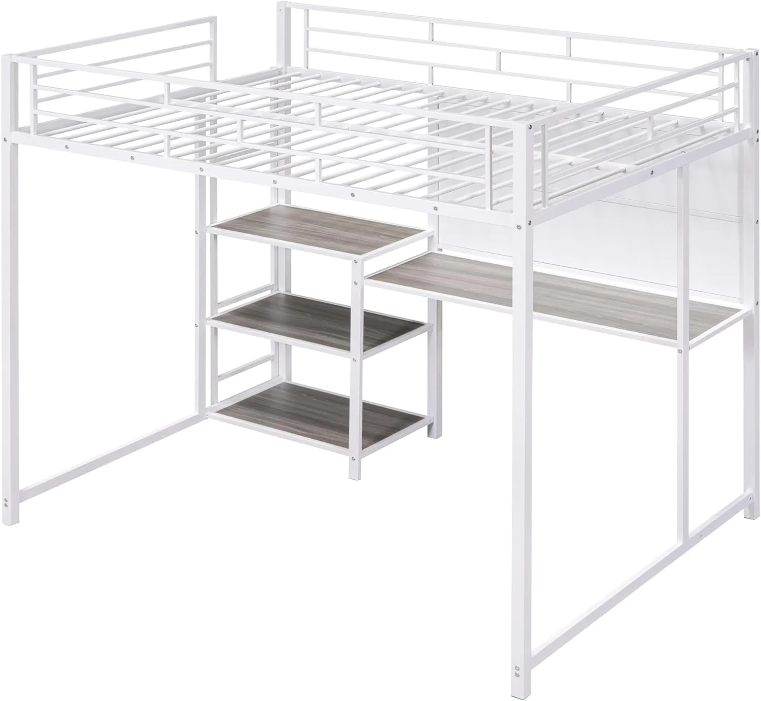 Full Size Metal Loft Bed With Long Desk, Shelves And Full Length Guardrails, Space-Saving Full Loft Bed For Bedroom, White
